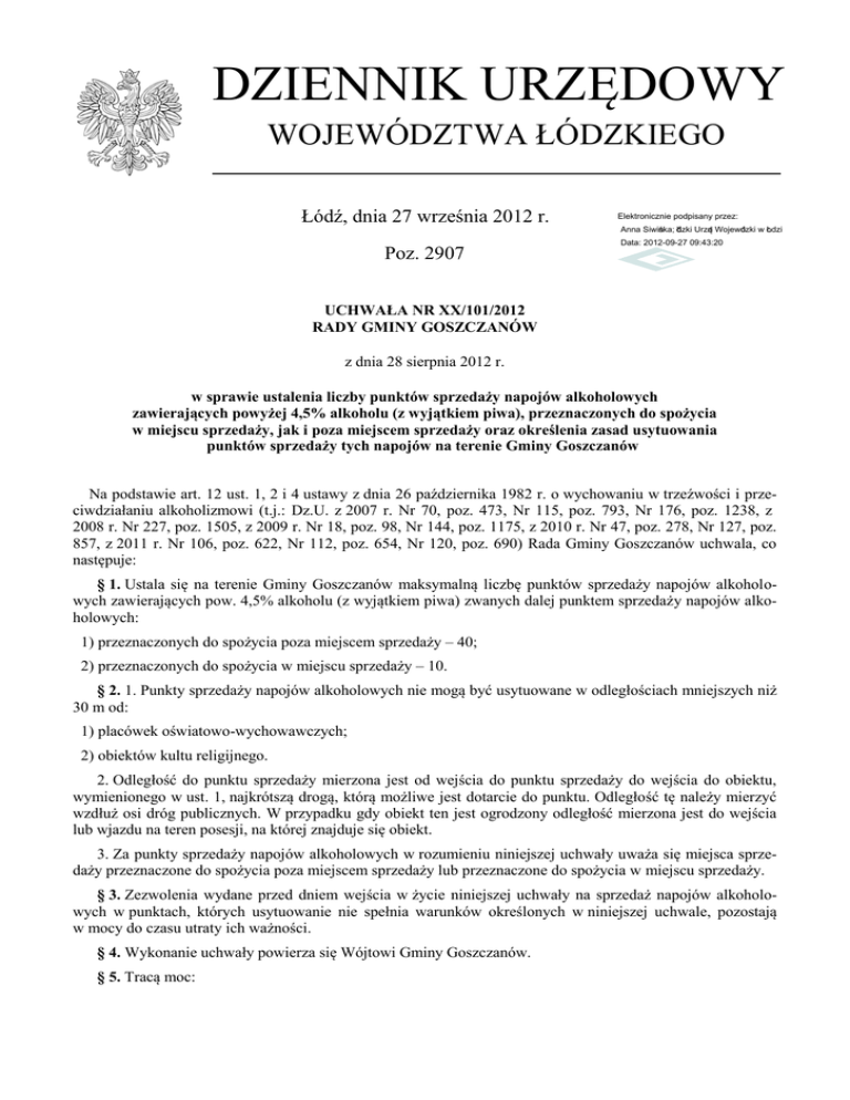 DZIENNIK URZĘDOWY WOJEWÓDZTWA ŁÓDZKIEGO Łódź, dnia 27 września 2012 r. Elektronicznie podpisany przez: Anna Siwińska; Łódzki Urząd Wojewódzki w Łodzi Poz. 2907 Data: 2012-09-27 09:43:20 UCHWAŁA NR XX/101/2012 RADY GMINY GOSZCZANÓW z dnia 28 sierpnia 2012 r. w sprawie ustalenia liczby punktów sprzedaży napojów alkoholowych zawierających powyżej 4,5% alkoholu (z wyjątkiem piwa), przeznaczonych do spożycia w miejscu sprzedaży, jak i poza miejscem sprzedaży oraz określenia zasad usytuowania punktów sprzedaży tych napojów na terenie Gminy Goszczanów Na podstawie art. 12 ust. 1, 2 i 4 ustawy z dnia 26 października 1982 r. o wychowaniu w trzeźwości i przeciwdziałaniu alkoholizmowi (t.j.: Dz.U. z 2007 r. Nr 70, poz. 473, Nr 115, poz. 793, Nr 176, poz. 1238, z 2008 r. Nr 227, poz. 1505, z 2009 r. Nr 18, poz. 98, Nr 144, poz. 1175, z 2010 r. Nr 47, poz. 278, Nr 127, poz. 857, z 2011 r. Nr 106, poz. 622, Nr 112, poz. 654, Nr 120, poz. 690) Rada Gminy Goszczanów uchwala, co następuje: § 1. Ustala się na terenie Gminy Goszczanów maksymalną liczbę punktów sprzedaży napojów alkoholowych zawierających pow. 4,5% alkoholu (z wyjątkiem piwa) zwanych dalej punktem sprzedaży napojów alkoholowych: 1) przeznaczonych do spożycia poza miejscem sprzedaży – 40; 2) przeznaczonych do spożycia w miejscu sprzedaży – 10. § 2. 1. Punkty sprzedaży napojów alkoholowych nie mogą być usytuowane w odległościach mniejszych niż 30 m od: 1) placówek oświatowo-wychowawczych; 2) obiektów kultu religijnego. 2. Odległość do punktu sprzedaży mierzona jest od wejścia do punktu sprzedaży do wejścia do obiektu, wymienionego w ust. 1, najkrótszą drogą, którą możliwe jest dotarcie do punktu. Odległość tę należy mierzyć wzdłuż osi dróg publicznych. W przypadku gdy obiekt ten jest ogrodzony odległość mierzona jest do wejścia lub wjazdu na teren posesji, na której znajduje się obiekt. 3. Za punkty sprzedaży napojów alkoholowych w rozumieniu niniejszej uchwały uważa się miejsca sprzedaży przeznaczone do spożycia poza miejscem sprzedaży lub przeznaczone do spożycia w miejscu sprzedaży. § 3. Zezwolenia wydane przed dniem wejścia w życie niniejszej uchwały na sprzedaż napojów alkoholowych w punktach, których usytuowanie nie spełnia warunków określonych w niniejszej uchwale, pozostają w mocy do czasu utraty ich ważności. § 4. Wykonanie uchwały powierza się Wójtowi Gminy Goszczanów. § 5. Tracą moc: Dziennik Urzędowy Województwa Łódzkiego –2– Poz. 2907 1) uchwała Nr 139/XXV/97 Rady Gminy w Goszczanowie z dnia 27 czerwca 1997 r. w sprawie ustalenia liczby punktów sprzedaży napojów powyżej 4,5% alkoholu (z wyjątkiem piwa) przeznaczonych do spożycia poza miejscem sprzedaży na terenie gminy Goszczanów; 2) uchwała Nr 140/XXV/97 Rady Gminy Goszczanów z dnia 27 czerwca 1997 r. w sprawie ustalenia zasad usytuowania punktów sprzedaży napojów alkoholowych i warunków sprzedaży tych napojów na terenie gminy Goszczanów. § 6. Uchwała wchodzi w życie po upływie 14 dni od dnia ogłoszenia w Dzienniku Urzędowym Województwa Łódzkiego. Przewodniczący Rady Gminy: Bogumił Kaczorkiewicz