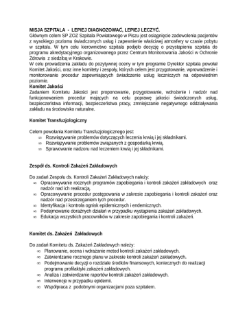 MISJA SZPITALA - LEPIEJ DIAGNOZOWAĆ, LEPIEJ LECZYĆ. Głównym celem SP ZOZ Szpitala Powiatowego w Piszu jest osiągnięcie zadowolenia pacjentów z wysokiego poziomu świadczonych usług i zapewnienie właściwej atmosfery w czasie pobytu w szpitalu. W tym celu kierownictwo szpitala podjęło decyzję o przystąpieniu szpitala do programu akredytacyjnego organizowanego przez Centrum Monitorowania Jakości w Ochronie Zdrowia z siedzibą w Krakowie. W celu prowadzenia zakładu do pozytywnej oceny w tym programie Dyrektor szpitala powołał Komitet Jakości, oraz inne komitety i zespoły, których celem jest przygotowanie, wprowadzenie i monitorowanie procedur zapewniających świadczenie usług leczniczych na odpowiednim poziomie. Komitet Jakości Zadaniem Komitetu Jakości jest proponowanie, przygotowanie, wdrożenie i nadzór nad funkcjonowaniem procedur mających na celu poprawę jakości świadczonych usług, bezpieczeństwa informacji, bezpieczeństwa pracy, zmniejszanie negatywnego oddziaływania zakładu na środowisko naturalne. Komitet Transfuzjologiczny Celem powołania Komitetu Transfuzjologicznego jest: • Rozwiązywanie problemów dotyczących leczenia krwią i jej składnikami. • Rozwiązywanie problemów związanych z gospodarką krwią. • Sprawowanie nadzoru nad leczeniem krwią i jej składnikami. Zespół ds. Kontroli Zakażeń Zakładowych Do zadań Zespołu ds. Kontroli Zakażeń Zakładowych należy: • Opracowywanie rocznych programów zapobiegania i kontroli zakażeń zakładowych oraz nadzór nad ich realizacją. • Opracowywanie procedur postępowania w zakresie zapobiegania i kontroli zakażeń oraz nadzór nad przestrzeganiem tych procedur. • Identyfikacja i kontrola ognisk epidemicznych i endemicznych. • Podejmowanie doraźnych działań w przypadku wystąpienia zakażeń zakładowych. • Edukacja wszystkich pracowników w zakresie zapobiegania i kontroli zakażeń. Komitet ds. Zakażeń Zakładowych Do zadań Komitetu ds. Zakażeń Zakładowych należy: • Planowanie, ocena i wdrażanie metod kontroli zakażeń zakładowych. • Zatwierdzanie rocznego planu w zakresie kontroli zakażeń zakładowych. • Podejmowanie decyzji o rozdziale środków finansowych, koniecznych do realizacji programu profilaktyki zakażeń zakładowych. • Analiza i zatwierdzanie raportów kontroli zakażeń zakładowych. • Interwencje w przypadku epidemii. • Współpraca z podobnymi organizacjami poza szpitalem. • Współpraca z lekarzami rodzinnymi. Zespół ds. Analizy Bezpieczeństwa Leczenia Do zadań zespołu należy : 1. Przeprowadzenie postępowania wyjaśniającego w przypadku zgłoszenia w trakcie leczenia pacjentów w SP ZOZ Szpitalu Powiatowym w Piszu : • podejrzenia ciężkiego niepożądanego działania produktu leczniczego, • podejrzenia jakościowych uchybień dotyczących produktu leczniczego, • podejrzenie niepożądanego odczynu poszczepiennego, • podejrzenie incydentu medycznego z wyrobem medycznym, • podejrzenia jakościowych uchybień dotyczących wyrobu medycznego, 2. Analiza i ocena przyczyn zaistnienia ciężkiego, niepożądanego działania produktu leczniczego. 3. Podejmowanie działań prewencyjnych. Zespół ds. Skarg Zadaniem zespołu jest wyjaśnienie okoliczności wymienionych w skargach na działalność SP ZOZ Szpitala Powiatowego w Piszu oraz dotyczących tegoż zakładu publikacjach prasowych, a w szczególności zasadności zarzutów i krytycznych uwag, jak również przyczyn powstania tego rodzaju zdarzeń w wypadku potwierdzenia słuszności stawianych zarzutów. Zespół ds. Szpitalnej Polityki Antybiotykowej Do zadań Zespołu ds. Szpitalnej Polityki Antybiotykowej należy: • Ustalenie polityki antybiotykoterapii w SP ZOZ Szpitalu Powiatowym w Piszu. • Wprowadzenie procedur przeciwdziałających narastaniu lekooporności w wyniku niewłaściwego stosowania profilaktyki i terapii antybiotykowej. • Opracowanie procedur polegających na włączaniu celowanej antybiotykoterapii. Zespół ds. Badania Satysfakcji Pacjentów Zadaniem zespołu jest okresowa analiza ankiet satysfakcji pacjentów i formułowanie wniosków w celu poprawy jakości usług świadczonych w SP ZOZ Szpital Powiatowym w Piszu. Komitet Terapeutyczny Do zadań komitetu należy opracowanie zasad gospodarki lekami i materiałami medycznymi, a w szczególności: • Nowelizacja Receptariusza Szpitalnego z podziałem na leki rekomendowane, leki rezerwowe oraz leki zastrzeżone. • Nadzór nad właściwym doborem leków i materiałów medycznych, z uwzględnieniem dbałości o jakość usług medycznych oraz zasad gospodarności i oszczędności. • Opracowanie zasad dystrybucji leków i materiałów medycznych wewnątrz szpitala. Zespół ds. Kontroli Wewnętrznej w obszarze realizacji działań zapobiegających szerzeniu się zakażeń i chorób zakaźnych Do zadań zespołu należy: • Ocena ryzyka występowania zakażeń związanych z udzielaniem świadczeń zdrowotnych, • Monitorowanie czynników alarmowych i zakażeń związanych z udzielaniem świadczeń zdrowotnych w zakresie wykonywanych świadczeń, • Kontrola procedur zapobiegania zakażeniom i chorobom zakaźnym związanym z udzielaniem świadczeń zdrowotnych, w tym procedur dekontaminacji. Zespół Etyczny Zespół Etyczny zajmuje się rozpatrywaniem spraw dotyczących złamania przez pracowników szpitala etyki zawodowej. Zespół Żywieniowy Do zadań zespołu należy poprawa jakości leczenia żywieniowego w naszej placówce. Zespół ds. Dokumentacji Medycznej Do zadań i obowiązków zespołu należy: • Ocena zgodności analizowanej dokumentacji medycznej z obowiązującymi przepisami prawa. • Analiza zawartości dokumentacji medycznej pod względem merytorycznym. • Nadzór nad procedurą przechowywania oraz udostępniania dokumentacji medycznej osobom uprawnionym. Zespół ds. Profilaktyki Odleżyn Do zadań i obowiązków zespołu należy : • Monitorowanie stopni
