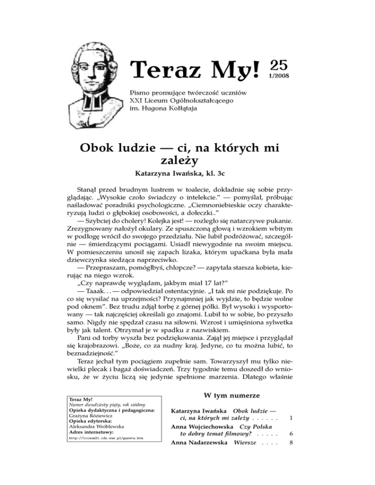 Teraz My! 25 1/2008 Pismo promujące twórczość uczniów XXI Liceum Ogólnokształcącego im. Hugona Kołłątaja Obok ludzie — ci, na których mi zależy Katarzyna Iwańska, kl. 3c Stanął przed brudnym lustrem w toalecie, dokładnie się sobie przyglądając. „Wysokie czoło świadczy o intelekcie.” — pomyślał, próbując naśladować poradniki psychologiczne. „Ciemnoniebieskie oczy charakteryzują ludzi o głębokiej osobowości, a dołeczki..” — Szybciej do cholery! Kolejka jest! — rozległo się natarczywe pukanie. Zrezygnowany nałożył okulary. Ze spuszczoną głową i wzrokiem wbitym w podłogę wrócił do swojego przedziału. Nie lubił podróżować, szczególnie — śmierdzącymi pociągami. Usiadł niewygodnie na swoim miejscu. W pomieszczeniu unosił się zapach lizaka, którym upaćkana była mała dziewczynka siedząca naprzeciwko. — Przepraszam, pomógłbyś, chłopcze? — zapytała starsza kobieta, kierując na niego wzrok. „Czy naprawdę wyglądam, jakbym miał 17 lat?” — Taaak. . . — odpowiedział ostentacyjnie. „I tak mi nie podziękuje. Po co się wysilać na uprzejmości? Przynajmniej jak wyjdzie, to będzie wolne pod oknem”. Bez trudu zdjął torbę z górnej półki. Był wysoki i wysportowany — tak najczęściej określali go znajomi. Lubił to w sobie, bo przyszło samo. Nigdy nie spędzał czasu na siłowni. Wzrost i umięśniona sylwetka były jak talent. Otrzymał je w spadku z nazwiskiem. Pani od torby wyszła bez podziękowania. Zajął jej miejsce i przyglądał się krajobrazowi. „Boże, co za nudny kraj. Jedyne, co tu można lubić, to beznadziejność.” Teraz jechał tym pociągiem zupełnie sam. Towarzyszył mu tylko niewielki plecak i bagaż doświadczeń. Trzy tygodnie temu doszedł do wniosku, że w życiu liczą się jedynie spełnione marzenia. Dlatego właśnie Teraz My! Numer dwudziesty piąty, rok siódmy Opieka dydaktyczna i pedagogiczna: Grażyna Róziewicz Opieka edytorska: Aleksandra Wróblewska Adres internetowy: http://liceum21.ids.waw.pl/gazeta.htm W tym numerze Katarzyna Iwańska Obok ludzie — ci, na których mi zależy . . . . . . 1 Anna Wojciechowska Czy Polska to dobry temat filmowy? . . . . . 6 Anna Nadarzewska Wiersze . . . . 8 2 Teraz My, numer 25 — Epika porzucił wszystko, co miał i, wprawdzie bez zielonego kamyka, ale za to z wiarą i nadzieją w sercu, zmierzał teraz do Warszawy. Ostatni raz był tam na pogrzebie rodziców. Nienawidził tamtego dnia prawie tak mocno, jak wszystkich fotoreporterów i dziennikarzy pytających go wtedy, co czuje. Miałem 8 lat i stałem na tym cmentarzu zupełnie sam, co mogłem czuć?! Wczoraj, 19 października 1990 r. Anna i Kazimierz Stoszewscy zginęli w wypadku samochodowym, jadąc na kolejny koncert zespołu Kolt. Wielcy, sławni, znani, uwielbiani, zamożni, szczęśliwi. Robili to, co kochali, a ludzie kochali ich za to, co robili. On — znany pod pseudonimem „Kazik”, tworzył świetną muzykę, Ona — realizowała się fotografując. Zginęli na miejscu. Osierocili jedynego syna. Znał ten tekst na pamięć. O wypadku dowiedział się z krótkiej notki prasowej. „A teraz ten syn, po 15 długich latach, wraca. Wracam! I będę Kimś.” — pomyślał, marszcząc czoło. Wiedział, że stolica to jedyne miejsce na tym świecie, gdzie ma szansę się spełnić. Jego mała ojczyzna, gdzie ma do zrobienia coś wartego zachodu. Jedyną miłością w jego życiu była muzyka. Studiował śpiew i grę na instrumentach. Widząc, co dzieje się z polskim show biznesem i nie mogąc znieść kiczowatych piosenek z pierwszych miejsc list przebojów, postanowił zdobyć sławę i pokazać ludziom, że istnieje muzyka naprawdę warta słuchania. ? ? ? Skręcony ze zdenerwowania żołądek podchodził do gardła. Z plakatów wielkie litery wrzeszczały: WBW. Piotrek oparty plecami o ścianę powoli zamknął i otworzył oczy. „Na ekranie telewizora wyglądało to jakoś prościej”. Zdawał sobie sprawę ze swego talentu. Wiedział, że jest dobry i że innym wszystko przychodzi dużo trudniej. Jakoś nie poprawiało mu to humoru. „Tym większa ewentualna klęska” — pomyślał. „Stop! Wygram. A ludzie zrozumieją, co staram się przekazać. Będzie dobrze” — uspokajał samego siebie. — Juuuuż, właź! — rozległ się wrzask gdzieś obok. Popchnięto go na scenę. Zagrała muzyka. Nie było żadnego wstępu, wszyscy dokładnie wiedzieli, po co tu są, nikt nie potrzebował wprowadzenia. Jasne światła oślepiały. „Niezły, tłusty bit” — pomyślał wsłuchując się w melodię. Tłum pod sceną kiwał rytmicznie głowami. Niektórzy patrzyli zdezorientowani, inni zaciekawieni. — Eeegoo! — krzyknął, chcąc jednocześnie przedstawić się i rozgrzać publikę. Odpowiedziało niewiele głosów, zabrzmiało też kilka bluzgów i jedno donośne ’spierdalaj’ z końca sali. Wziął głęboki oddech, wsłuchał się w rytm i rozpoczął: — W nieruchomym centrum kosmosu, jako fundament jej powierzchni — otchłanie pełne romantycznych marzeń i wyobrażeń. Tam złota barwa rozkwita w złote malowidła . . . — melodyjnie mówił do mikrofonu. Ludzie ucichli, wsłuchując się w słowa i głos. Pierwszym etapem był freestyle na dowolny temat. Wszyscy występujący przed nim jaskrawo ubrani kolesie robili wielkie show, klnąc i wrzeszcząc do mikrofonu, rzucając żółtymi czapkami pod scenę. Piotrek przyszedł ubrany w czarnogranatowy sweter. Jedyna zmiana, jaka zaszła w jego wyglądzie specjalnie na ten wieczór, to brak okularów. Nie porywał śpiewem o biedzie, swojej zajebistej lasce, czy psach — rapował o swoich marzeniach. 3 Teraz My, numer 25 — Epika — Rusz wyobraźnią i otwórz oczy na świat, ujrzysz krainę, której nie znajdziesz na żadnej z map! Nibylandia to kraina jedna, jedyna, bez wad, bez trosk, bez żalu. . . Występ był świetny. Łatwo przeszedł do drugiej i trzeciej tury, wre