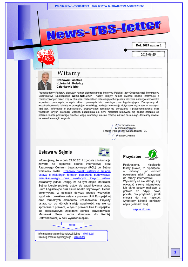 POLSKA IZBA GOSPODARCZA TOWARZYSTW BUDOWNICTWA SPOŁECZNEGO Rok 2015 numer 1 2015-06-25 Wit amy Szanowni Państwo Koleżanki i Koledzy Członkowie Izby Przedkładamy Państwu pierwszy numer elektronicznego biuletynu Polskiej Izby Gospodarczej Towarzystw Budownictwa Społecznego News-TBS-letter Każdy kolejny numer zwierać będzie informacje o zamieszczonych przez Izbę w chmurze materiałach, interesujących z punktu widzenia naszego środowiska artykułach prasowych, nowych aktach prawnych lub przebiegu prac legislacyjnych. Zachęcamy do współredagowania biuletynu przesyłając wszelkiego rodzaju informacje dotyczące wydarzeń w Waszych TBS-ach, informacje o publikacjach, propozycjach tematów do poruszenia i przedyskutowania oraz wszelkich innych informacji wartych podzielenia się nimi. Nesletter ukazywać się będzie zależnie od potrzeb, biorąc pod uwagę pilność i wagę informacji, ale nie rzadziej niż raz na miesiąc. Jesteśmy otwarci na wszelkie uwagi i sugestie. Z pozdrowieniami w imieniu Zarządu Prezes Polskie Izby Gospodarczej TBS Wiesław Źrebiec Ustawa w Sejmie Przydatne Informujemy, że w dniu 24.06.2014 zgodnie z informacją zawartą na sejmowej stronie internetowej oraz Rządowego Centrum Legislacyjnego (RCL) do Sejmu wniesiony został Rządowy projekt ustawy o zmianie ustawy o niektórych formach popierania budownictwa mieszkaniowego oraz niektórych innych ustaw. Zwracamy jednak uwagę, że na tym etapie Marszałek Sejmu kieruje projekty ustaw do zaopiniowania przez Biuro Legislacyjne oraz Biuro Analiz Sejmowych. Ocena dokonywana w opiniach dotyczy przede wszystkim zgodności projektów ustaw z prawem Unii Europejskiej oraz formalnych elementów uzasadnienia. Projekty ustaw, co, do których istnieje wątpliwość, czy nie są sprzeczne z prawem, w tym z prawem Unii Europejskiej lub podstawowymi zasadami techniki prawodawczej, Marszałek Sejmu może skierować do Komisji Ustawodawczej w celu wyrażenia opinii. Podkreślone, niebieskie teksty (słowa) to hiperłącza, a mówiąc „po ludzku” odwołanie (link ) zazwyczaj do strony internetowej. Wystarczy na nie kliknąć, aby otworzyć stronę internetową lub okno poczty mailowej z gotową do edycji nową pocztą. Dla przykładu:, jeżeli chcesz do nas napisać, wystarczy kliknąć poniższy napis (właśnie: link) napisz do nas więcej Informacja na stronie internetowej Sejmu - kliknij tutaj Przebieg procesu legislacyjnego - kliknij tutaj 1 POLSKA IZBA GOSPODARCZA TOWARZYSTW BUDOWNICTWA SPOŁECZNEGO Rok 2015 numer 1 2015-06-25 Walne Izby i XX-lecie Poznańskiego TBS W dniu 10 czerwca odbyło się Walne Zgromadzenie Izby, a w dniu 11-tego konferencja. Agenda związana z Walnym Zgromadzeniem Izby zawierała tradycyjne Forum Dyskusyjne służące wymianie doświadczeń zawodowych, prezentacje firm oraz panel poświęcony sprawom dotyczącym działalności Izby. Ponadto Członkowie Izby wzięli udział w uroczystych obchodach XX-lecia Poznańskiego Towarzystwa Budownictwa Społecznego, w szczególności w organizowanej przy wsparciu Izby z tej okazji Konferencji. Odbyło się m.in. arcyciekawe szkolenie z zakresu ochrony danych osobowych, prezentacja rozwiązań prawnych oraz organizacyjnych z zakresu windykacji należności w Poznańskim TBS, a także prezentacja Banku Gospodarstwa Krajowego dotycząca finansowania inwestycji mieszkaniowych. Oprócz tradycyjnych gratulacji w imieniu Członków Izby wręczyliśmy na ręce Pani Prezes Bogny Narożnej, także pamiątkową statuetkę. Dziękujemy za zaproszenie i jeszcze raz wszystkiego najlepszego. więcej Materiały do pobrania z poznańskiej konferencji Z pracy Zarządu W dniu 24.06.2015r. dzięki uprzejmości Katowickiego TBS w jego siedzibie w Katowicach odbyło się spotkanie z Członkami Stowarzyszenia Tebeesów Polski Południowej i Zachodniej z udziałem Prezesa Zarządu Izby oraz członka Zarządu Pana Kazimierza Fiursta. Na spotkaniu przedstawiliśmy działalność Izby i złożyliśmy zaproszenie przystąpienia do Polskiej Izby Gospodarczej TBS skierowane do Członków Stowarzyszenia niebędących członkami Izby. Ponadto omówiliśmy formy współpracy ze Stowarzyszeniem oraz problematykę zmian ustawy. Spotkanie przebiegło w sympatycznej atmosferze. W dniu 25 czerwca Prezes Izby odbędzie spotkanie w BGK z Panem Dyrektorem Dariuszem Stacherą podczas, którego omówione zostaną kwestie nowego projektu zmiany ustawy oraz problematyki pomocy publicznej w ramach „nowego programu”. W tym samym dniu Prezes odbędzie, także spotkanie w Ministerstwie Infrastruktury i Rozwoju z Panią Dyrektor Dorotą Bortnowską, na którym planowane jest omówienie uwag zgłoszonych w Poznaniu. Kwestie legislacyjne omówione zostały z Panią Dyrektor wcześniej - w dniu 18 czerwca podczas rozmowy telefonicznej. Ponadto, planowane jest też spotkanie z menadżer Hotelu Mercue Warszawa Grand (przygotowania do XX lecia - uzgodnienia szczegółowe), a w dniu 26 czerwca spotkanie z wydawcą albumu (uzgodnienia dotyczące wydania albumu z okazji XX-lecia programu TBS). Polska Izba Gospodarcza Towarzystw Budownictwa Społecznego 01-471 Warszawa, ul. Gen. Pełczyńskiego 30, PKO Bank Polski w Warszawie Nr rach: 79 1020 1156 0000 7102 0126 0033 NIP : 526-26-16-650 ; REGON 017515780 tel. : 48-22-629 61 89 tel. / fax : 48-22-629 40 34 tel. kom. : 604 237 342 http://www.izbatbs.pl; [email protected] 2