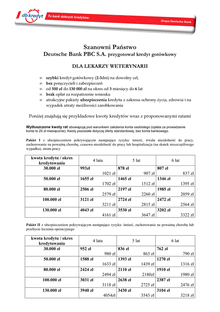 Szanowni Państwo Deutsche Bank PBC S.A. przygotował kredyt gotówkowy DLA LEKARZY WETERYNARII • • • • • szybki kredyt gotówkowy (2-3dni) na dowolny cel, bez poręczycieli i zabezpieczeń od 500 zł do 130 000 zł na okres od 3 miesięcy do 6 lat brak opłat za rozpatrzenie wniosku atrakcyjne pakiety ubezpieczenia kredytu z zakresu ochrony życia, zdrowia i na wypadek utraty możliwości zarobkowania Poniżej znajdują się przykładowe kwoty kredytów wraz z proponowanymi ratami Wytłuszczone kwoty rat obowiązują pod warunkiem założenia konta osobistego (opłata za prowadzenie konta to 25 zł miesięcznie). Kwoty pozostałe dotyczą oferty standardowej, bez konta bankowego. Pakiet I z ubezpieczeniem pokrywającym następujące ryzyka: śmierć, trwała niezdolność do pracy, zachorowanie na poważną chorobę, czasowa niezdolność do pracy lub hospitalizacja (na skutek nieszczęśliwego wypadku), utrata pracy kwota kredytu / okres kredytowania 30.000 zł 4 lata 5 lat 993zł 878 zł 807 zł 1021 zł 50.000 zł 6 lat 1655 zł 907 zł 1465 zł 1346 zł 1702 zł 80.000 zł 2506 zł 100.000 zł 3121 zł 130.000 zł 4043 zł 837 zł 1512 zł 2197 zł 1395 zł 1985 zł 2579 zł 2260 zł 2724 zł 2059 zł 2472 zł 3211 zł 2815 zł 3530 zł 2564 zł 3202 zł 4161 zł 3647 zł 3322 zł Pakiet II z ubezpieczeniem pokrywającym następujące ryzyka: śmierć, zachorowanie na poważną chorobę lub przebycie leczenia operacyjnego kwota kredytu / okres kredytowania 30.000 zł 952 zł 50.000 zł 1588 zł 80.000 zł 2424 zł 100.000 zł 3031 zł 130.000 zł 3940 zł 4 lata 5 lat 6 lat 836 zł 980 zł 762 zł 863 zł 1393 zł 1633 zł 1439 zł 2110 zł 2494 zł 1316 zł 1910 zł 2180zł 2638 zł 3118 zł 1980 zł 2387 zł 2725 zł 3430 zł 4054zł 790 zł 1270 zł 2476 zł 3104 zł 3543 zł 3218 zł Pakiet III z ubezpieczeniem pokrywającym następujące ryzyka: śmierć, trwała niezdolność do pracy kwota kredytu / okres kredytowania 30.000 zł 50.000 zł 80.000 zł 100.000 zł 130.000 zł 48 m-cy 914 zł 940 zł 1524 zł 1567 zł 2271 zł 2337 zł 2828 zł 2910 zł 3664 zł 3771 zł 60 m-cy 791 zł 72 m-ce 712 zł 817 zł 1319 zł 738 zł 1187 zł 1362 zł 1940 zł 1230 zł 1725 zł 2005 zł 2417 zł 1789 zł 2148 zł 2497 zł 3131 zł 2229 zł 2784 zł 3235 zł 2887 zł Kwoty rat zawierają prowizję oraz ubezpieczenie (gdy kredyt jest ubezpieczony). W każdym z tych wariantów jest możliwość wcześniejszej spłaty kredytu. Przy wcześniejszej spłacie przyszłe odsetki zostają anulowane. Warunki otrzymania kredytu: • w przypadku umowy o pracę wymagana jest umowa na czas nieokreślony • w przypadku prowadzenia własnej działalności wymagane jest, aby działalność prowadzona była minimum 2 lata Wymagane dokumenty: W przypadku umowy o pracę: • dowód osobisty • zaświadczenie z firmy o zatrudnieniu i średniej wysokości dochodów z ostatnich 3 m-cy, W przypadku prowadzenia działalności gospodarczej na zasadach ogólnych: • Wpis do ewidencji działalności gospodarczej lub wypis z KRS • Kopia zbiorczego zestawienia od początku roku z książki przychodów i rozchodów (podbita przez osobę prowadzącą KPiR) roku wraz z potwierdzeniem zapłaty podatku za ostatni miesiąc (PIT 5 lub PIT 5 L) Powyżej kwoty 20.000 zł wymagana jest pisemna zgoda współmałżonka lub kopia rozdzielności majątkowej. W razie jakichkolwiek pytań proszę o kontakt Michał Kowalski Doradca Klienta db kredyt Tel. 728 348 123, 515 227 053 Powyższe kalkulacje zostały wyliczone dla dochodu powyżej 7 tyś zł netto i maja charakter szacunkowy. Nie są oferta w rozumieniu artykułu 66 § 1 k.c. Ostateczne wysokości rat kredytu mogą nieznacznie różnic sie od powyższych w zależności od daty uruchomienia kredytu.