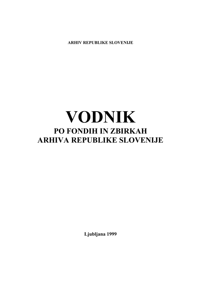 ARHIV REPUBLIKE SLOVENIJE VODNIK PO FONDIH IN ZBIRKAH ARHIVA REPUBLIKE SLOVENIJE Ljubljana 1999 Vodnik po fondih in zbirkah Arhiva Republike Slovenije, I., II., III. knjiga Glavni urednik Vladimir Kološa Odgovorni urednik Vladimir Žumer Redaktorja Vladimir Kološa in Vladimir Žumer Tehnični urednik in redaktor Milan Bizjak Računalniška podpora Milan Bizjak in Darija Plevel Avtorji uvodnih tekstov: Uvod (Vladimir Žumer), Arhiv Republike Slovenije (Gašper Šmid, Vladimir Žumer, Izbrana bibliografija (Marija Vera Erjavec), Navodila za uporabo vodnika (Vladimir Žumer), Seznam kratic in okrajšav (Milan Bizjak) Avtorji popisov fondov in zbirk: Marjeta Adamič, Marjeta Čampa, France M. Dolinar, Ljuba Dornik Šubelj, Darinka Drnovšek, Suzana Felicijan Bratož, Majda Ficko, Eva Gerkman, Natalija Glažar, Metka Gombač, Vesna Gotovina, Marija Grabnar, Mirjana Jadreško, Mateja Jeraj, Daniela Juričić Čargo, Alenka Kačičnik Gabrič, Miran Kafol, Majda Kocmur, Vladimir Kološa, Matevž Košir, Branko Kozina, Jelena Malbašič, Jelka Melik, Aleksandra Mrdavšič, Pavla Mrdjenović, Olga Pivk, Branko Radulovič, Marta Rau Selič, Aleksandra Serše, Gorazd Stariha, Vladimir Sunčič, Jože Škofljanec, Gašper Šmid, Žarko Štrumbl, Nevenka Troha, Drago Trpin, Alojzij Tršan, Ema Umek, Andrej Zadnikar, Marjan Zupančič in Vladimir Žumer. Prevod v nemščino in angleščino: A3, Agencija za prevajanje d.o.o. Ljubljana Izdal in založil Arhiv Republike Slovenije, Ljubljana 1999 Za izdajatelja Vladimir Žumer Tisk in vezava Gorenjski tisk Kranj Naklada 350 izvodov 2 VODNIK PO FONDIH IN ZBIRKAH ARHIVA REPUBLIKE SLOVENIJE III. KNJIGA Fondi in zbirke društev in družbenih organizacij, cerkve, zemljiških gospostev, osebni in rodbinski fondi ter arhivske zbirke (po klasifikaciji od zaporedne številke 957 do 1749) 3 CIP - Kataložni zapis o publikaciji Narodna in univerzitetna knjižnica, Ljubljana 930.253(497.4 Ljubljana) ARHIV Slovenije Vodnik po fondih in zbirkah Arhiva Republike Slovenije / [glavni urednik Vladimir Kološa ; avtorji uvodnih tekstov Vladimir Žumer ... [et al.] ; avtorji popisov fondov in zbirk Marjeta Adamič ... [et al.] ; prevod v nemščino in angleščino A3]. - Ljubljana : Arhiv Republike Slovenije, 1999 Knj. 3: Fondi in zbirke društev in družbenih organizacij, cerkve, zemljiških gospostev, osebni in rodbinski fondi ter arhivske zbirke ISBN 961-6137-38-7 (zv. 3) 1. Kološa, Vladimir 103703040 4 VSEBINA VODNIKA I. knjiga Stran Uvod .............................................................................................................................. 11 Arhiv Republike Slovenije ............................................................................................ Predstavitev .............................................................................................................. Uporaba arhivskega gradiva ..................................................................................... Izbrana bibliografija ................................................................................................. 15 15 19 24 Archiv der Republik Slowenien ..................................................................................... 35 Präsentation ............................................................................................................... 35 Benutzung der Archivalien ....................................................................................... 39 Archives of the Republic of Slovenia ............................................................................ 45 Profile ........................................................................................................................ 45 Using the Archives .................................................................................................... 49 Navodila za uporabo vodnika ........................................................................................ 55 Navodilo za citiranje arhivskega gradiva ...................................................................... 71 Seznam kratic in okrajšav ............................................................................................. 73 Kazalo fondov in zbirk po klasifikacijskem načrtu ....................................................... 85 Abecedno kazalo fondov in zbirk .................................................................................145 Abecedno kazalo ustvarjalcev fondov (pravnih in fizičnih oseb) ................................193 Kazalo fondov po krajih sedežev ustvarjalcev fondov izven Ljubljane ..................... 274 Arhivski fondi in zbirke po klasifikaciji od zaporedne številke 1 do 335 .................... 293 A Uprava ................................................................................................................ 293 AA Najvišje državne in avtonomne oblasti ......................................................293 AAA Najvišje državne in avtonomne oblasti do leta 1918 ........................293 AAA1 Centralni uradi na Dunaju......................................................293 AAA2 Oblasti na ravni dežele ali višji ravni ...................................314 AAA21 Avtonomni organi ................................................... 314 AAA22 Upravni organi ........................................................321 AAA23 Posebni avtonomni in upravni organi......................353 AAA24 Zemljiški kataster ....................................................386 AAB Najvišje državne in avtonomne oblasti od 1918 do 1941 ................ 410 AAB1 Državne in avtonomne oblasti od 1918 do 1923 ................. 410 5 AAB2 Državne in avtonomne oblasti od 1923 do 1929 ..................426 AAB3 Državne in avtonomne oblasti od 1929 do 1941 .................437 AAC Najvišje državne in avtonomne oblasti od 1941 do 1945 .................461 AAC1 Italijanske (in nemške) okupacijske oblasti .........................461 AAC2 N