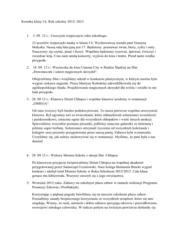 Kronika klasy I b. Rok szkolny 2012/ 2013 1. 3. 09. 12 r.- Uroczyste rozpoczęcie roku szkolnego. 23 uczniów rozpoczęło naukę w klasie I b. Wychowawcą została pani Grażyna Małyska. Naszą salą lekcyjną jest 17. Będziemy poznawać świat, litery, cyfry i nuty. Nauczymy się czytać, pisać i liczyć. Wspólnie będziemy rysować, śpiewać, ćwiczyć i zwiedzać kraj. Czas nam umilą koncerty, wyjścia do kina i teatru. Przed nami wielka przygoda. 2. 18. 09. 12 r.- Wycieczka do kina Cinema City w Rudzie Śląskiej na film „Dzwoneczek i sekret magicznych skrzydeł”. Obejrzeliśmy film i wzięliśmy udział w konkursie plastycznym, w którym można było wygrać ciekawe nagrody. Praca Martyny Kołodziej zakwalifikowała się do ogólnopolskiego finału. Projektowanie magicznych skrzydeł dla wróża i wróżki to nie lada przygoda. 3. 28. 09 12 r.- Klasowy Dzień Chłopca i wspólne klasowe urodziny w restauracji „OMEGA”. Od rana wszyscy byli bardzo podekscytowani. To nasza pierwsza wspólna uroczystość klasowa. Był ogromny tort ze świeczkami, które zdmuchiwali solenizanci wrześniowi i październikowi, sztuczne ognie dla wszystkich chłopaków i wiele innych atrakcji. Śpiewaliśmy wszystkie poznane piosenki, jedliśmy smaczne galaretki ze śmietaną i piliśmy super herbatę. Solenizanci otrzymali życzenia od wszystkich koleżanek i kolegów oraz prezenty przygotowane przez naszą panią. Zabawa była wyśmienita. Uczyliśmy się, jak należy zachowywać się w restauracji. Myślimy, że pani była z nas dumna! 4. 28. 09 12 r.- Wybory Mistera Szkoły z okazji Dni Chłopca. Po klasowym przyjęciu świętowaliśmy Dzień Chłopca na wspólnej akademii przygotowanej przez Samorząd Uczniowski. Nasz kolega Beniamin Bracki wygrał konkurs i zdobył tytuł Mistera Szkoły w Roku Szkolnym 2012/2013. Cała klasa gorąco mu kibicowała. Wszyscy cieszyli się z jego zwycięstwa. 5. Wrzesień 2012 roku- Zabawy na szkolnym placu zabaw w ramach realizacji Programu Promocji Zdrowia i Profilaktyki. Korzystając z pięknej pogody bawiliśmy się na naszym szkolnym placu zabaw. Poznaliśmy zasady bezpiecznego korzystania ze wszystkich urządzeń, które się tam znajdują. Wiemy, że ruch, uśmiech i dobra zabawa sprzyjają zdrowiu i prawidłowemu rozwojowi młodego człowieka. W trakcie pobytu na świeżym powietrzu dotleniły się nasze mózgi i nauka sama „ wchodziła” do głów. Bawiąc się nawiązaliśmy nowe przyjaźnie. 6. 1. 10. 12 r.- Uroczystość Pasowania na ucznia Szkoły Podstawowej nr 20 im. M. Konopnickiej. Wreszcie nadszedł upragniony moment pasowania na ucznia. Zaprezentowaliśmy nasze umiejętności i talenty. Pani Prezydent Anna Krzysteczko wraz z panią Dyrektor Katarzyną Szubą wręczyła nam dyplomy potwierdzające, że naprawdę jesteśmy uczniami. Złożyliśmy ślubowanie, że będziemy dbać o dobre imię szkoły i wzorowo się uczyć. Następnie nasi rodzice przyrzekali nam w tym pomagać. Był to bardzo wzruszający moment. 7. 10. 12 r.- Spotkanie ze strażakiem- tatą Jana Gebauera. Poznaliśmy tajniki trudnej i niebezpiecznej pracy strażaków. Zobaczyliśmy kolekcję różnych czapek oraz strój roboczy i mundur galowy strażaka. Następnie była opowieść o akcjach strażackich i wiersz „ Jak Wojtek został strażakiem”. Wielu chłopców w tym wieku marzy by być takim bohaterem. Na zakończenie zrobiliśmy wspólne zdjęcie. W klasie odbył się konkurs plastyczny związany z tym spotkaniem. 8. 5. 10. 12 r.- Wycieczka do Palmiarni w Gliwicach w ramach „ Popołudnia z mamą i tatą”. Dzięki dotacji UM w Rudzie Śląskiej byliśmy na wycieczce w Palmiarni w Gliwicach. Razem z rodzicami podziwialiśmy rośliny tropikalne i słuchaliśmy przewodnika. Dowiedzieliśmy się wielu ciekawych rzeczy. Każdy otrzymał pamiątkową książkę. Wzięliśmy też udział w konkursie wiedzowym oraz plastycznym. Zwycięzcy otrzymali dyplomy i upominki. Nauczyliśmy się wielu ciekawych rzeczy i miło spędziliśmy czas z naszą panią, paniami uczącymi w naszej szkole języka angielskiego oraz rodzicami i rodzeństwem. Z niecierpliwością czekamy na kolejne popołudnie z mamą i tatą. 9. Cały rok szkolny- „ Cała Polska czyta dzieciom” – spotkania z ciekawymi ludźmi, którzy czytają wiersze, bajki i opowiadania, aby zachęcić uczniów i przedszkolaków do odwiedzania biblioteki i sięgania po książki. Nasza klasa bierze udział w ogólnopolskiej akcji „ Cała Polska czyta dzieciom”. Odwiedzają nas goście wykonujący różne zawody, mający pasje, talenty i zainteresowania. Oprócz tego, że nam czytają, to również opowiadają o sobie i swojej pracy. Wielu pokazuje swoje kolekcje i eksponaty. Te spotkania uczą nas skupienia i uważnego słuchania. Kiedy poznamy wszystkie litery, będziemy sami sięgali po książki, aby je czytać. Dorośli uczą nas własnym przykładem. „ Pokaż mi, co czytasz, a powiem Ci, kim jesteś”. 10. 9. 10. 12 r.- Wycieczka do Ogrodu Botanicznego w Krakowie, jako nagroda w regionalnym konkursie ekologicznym „ Przyjaciel drzew”. Nasza pani przygotowała nas do udziału w konkursie. Obserwowaliśmy drzewa, oglądaliśmy albumy, rysowaliśmy okazy, liście, owoce i kwiaty. Później pani oprawiła nasze dzieła i wysłała przygotowane albumy na adres organizatora konkursu. Bardzo cieszyliśmy się ze zwycięstwa, zwłaszcza że nagrodą była wycieczka do Krakowa. Zwiedziliśmy Ogród Botaniczny, rynek w Krakowie oraz fabrykę cukierków. Otrzymaliśmy certyfikat „ Przyjaciół drzew” oraz medale. 11. Październik 2012 r.- Zajęcia integrujące zespół klasowy. Rok szkolny rozpoczął się tak nie dawno, a tu już październik. Znamy swoje imiona, ale jeszcze niewiele o sobie wiemy. Wspólne zabawy, wycieczki i imprezy oraz zajęcia integrujące pozwalają nam lepiej się poznać i zaprzyjaźnić. 12. 12. 10 12 r.- Dzień Edukacji Narodowej. Po raz pierwszy, jako uczniowie obchodziliśm