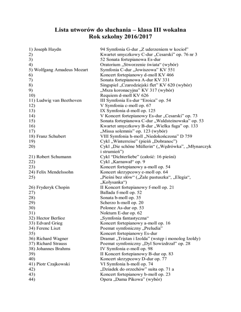 Lista utworów do słuchania – klasa III wokalna Rok szkolny 2016/2017 1) Joseph Haydn 2) 3) 4) 5) Wolfgang Amadeus Mozart 6) 7) 8) 9) 10) 11) Ludwig van Beethoven 12) 13) 14) 15) 16) 17) 18) Franz Schubert 19) 20) 21) Robert Schumann 22) 23) 24) Felix Mendelssohn 25) 26) Fryderyk Chopin 27) 28) 29) 30) 31) 32) Hector Berlioz 33) Edvard Grieg 34) Ferenc Liszt 35) 36) Richard Wagner 37) Richard Strauss 38) Johannes Brahms 39) 40) 41) Piotr Czajkowski 42) 43) 44) 94 Symfonia G-dur „Z uderzeniem w kocioł” Kwartet smyczkowy C-dur „Cesarski” op. 76 nr 3 52 Sonata fortepianowa Es-dur Oratorium „Stworzenie świata“ (wybór) Symfonia C-dur „Jowiszowa” KV 551 Koncert fortepianowy d-moll KV 466 Sonata fortepianowa A-dur KV 331 Singspiel „Czarodziejski flet” KV 620 (wybór) „Msza koronacyjna” KV 317 (wybór) Requiem d-moll KV 626 III Symfonia Es-dur “Eroica” op. 54 V Symfonia c-moll op. 67 IX Symfonia d-moll op. 125 V Koncert fortepianowy Es-dur „Cesarski” op. 73 Sonata fortepianowa C-dur „Waldsteinowska” op. 53 Kwartet smyczkowy B-dur „Wielka fuga” op. 133 „Missa solemnis” op. 123 (wybór) VIII Symfonia h-moll „Niedokończona” D 759 Cykl „Winterreise” (pieśń „Dobranoc”) Cykl „Die schöne Müllerin“ („Wędrówka”, „Młynarczyk i strumień”) Cykl “Dichterliebe” (całość: 16 pieśni) Cykl „Karnawał“ op. 9 Koncert fortepianowy a-moll op. 54 Koncert skrzypcowy e-moll op. 64 „Pieśni bez słów“ („Żale pastuszka“, „Elegia“, „Kołysanka“) II Koncert fortepianowy f-moll op. 21 Ballada f-moll op. 52 Sonata b-moll op. 35 Scherzo h-moll op. 20 Polonez As-dur op. 53 Nokturn E-dur op. 62 „Symfonia fantastyczna“ Koncert fortepianowy a-moll op. 16 Poemat symfoniczny „Preludia” Koncert fortepianowy Es-dur Dramat „Tristan i Izolda” (wstęp i monolog Izoldy) Poemat symfoniczny „Dyl Sowizdrzał” op. 28 IV Symfonia e-moll op. 98 II Koncert fortepianowy B-dur op. 83 Koncert skrzypcowy D-dur op. 77 VI Symfonia h-moll op. 74 „Dziadek do orzechów” suita op. 71 a Koncert fortepianowy b-moll op. 23 Opera „Dama Pikowa” (wybór) 45) Antonin Dvořák 46) Stanisław Moniuszko 47) 48) Henryk Wieniawski 49) Gustav Mahler 50) Modest Musorgski 51) 52) Gioacchino Rossini 53) Giuseppe Verdi 54) Giacomo Puccini 55) Gabriel Fauré IX Symfonia e-moll „Z Nowego Świata” op. 95 Opera „Straszny dwór” (wybór) Pieśni: „Dziad i baba”, „Kozak” Koncert skrzypcowy d-moll op. 22 II Symfonia c-moll (część IV i V) Cykl „Obrazki z wystawy” Opera „Borys Godunow” (scena śmierci Borysa) Opera “Cyrulik sewilski” (wybór) Opera „Rigoletto” (wybór) Opera „Tosca” (III akt) Requiem op. 48