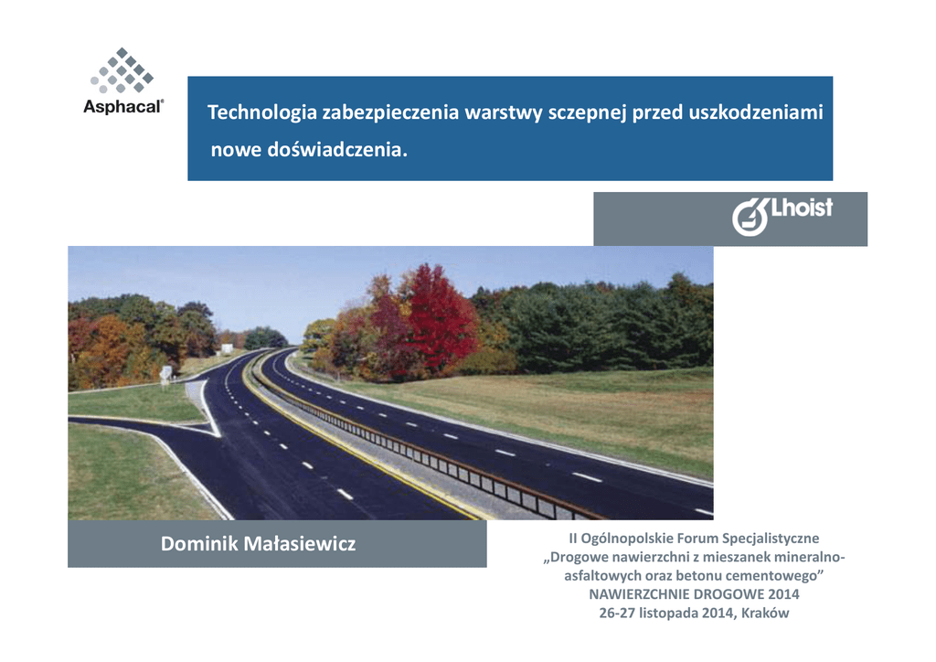 Asphacal® Technologia zabezpieczenia warstwy sczepnej przed uszkodzeniami nowe doświadczenia. Améliorer la durabilité des structures bitumineuses Votre email ici Dominik Małasiewicz Votre LOGO ICI II Ogólnopolskie Forum Specjalistyczne „Drogowe nawierzchni z mieszanek mineralnoasfaltowych oraz betonu cementowego” NAWIERZCHNIE DROGOWE 2014 26-27 listopada 2014, Kraków Asphacal®TC - zabezpieczenie warstwy sczepnej Definicja – w prezentacji Warstwa sczepna warstwa powstała wskutek rozpadu emulsji asfaltowej (odparowaniu wody i wytrąceniu asfaltu) rozłożonej na warstwie mineralo-asfaltowej lub warstwie tłuczniowej celem poprawy sczepności w/w warstw. Potocznie nazywana: Nawierzchnie Drogowe Kraków, 2014 - skropieniem międzywarstwowym - skropieniem z emulsji asfaltowej - złączeniem miedzywarstwowym - połączeniem międzywarstwowym 2 Asphacal®TC - zabezpieczenie warstwy sczepnej Łączenie warstw http://orj.cc sspoiwo/klej www.hincol.com emulsja asfaltowa Nawierzchnie Drogowe Kraków, 2014 3 Asphacal®TC - zabezpieczenie warstwy sczepnej Dobre połączenie Nawierzchnie Drogowe Kraków, 2014 vs. Brak połączenia 4 Asphacal®TC - zabezpieczenie warstwy sczepnej Na początku jest pięknie… Nawierzchnie Drogowe Kraków, 2014 www.pavementinteractive.org 5 Asphacal®TC - zabezpieczenie warstwy sczepnej Wprowadzamy sprzęt i . . . Nawierzchnie Drogowe Kraków, 2014 6 Asphacal®TC - zabezpieczenie warstwy sczepnej PROBLEM Przywieranie asfaltu wytrąconego z emulsji asfaltowej do kół i gąsienic pojazdów budowy. Nawierzchnie Drogowe Kraków, 2014 Emulsja asfaltowa roznoszona jjestt po sąsiadującym z budową terenie. 7 Asphacal®TC - zabezpieczenie warstwy sczepnej Taki piękny bałagan Częsty problem na budowie. Nawierzchnie Drogowe Kraków, 2014 8 Zanieczyszczony teren poza budową Nawierzchnie Drogowe Kraków, 2014 http://limanow http://limanowa.in wa in Asphacal®TC - zabezpieczenie warstwy sczepnej 9 Asphacal®TC - zabezpieczenie warstwy sczepnej TC ● preparat na bazie wodnego roztworu Ca(OH)2 ● wysokie stężenie wodorotlenku wapnia - 45% ● specjalne dodatki osłabiają proces sedymentacji oraz agregacji cząstek wapna Nawierzchnie Drogowe Kraków, 2014 10 Asphacal®TC - zabezpieczenie warstwy sczepnej Koncentrat preparatu dostarczany jest w: http://cysterna.waw.pl/ Nawierzchnie Drogowe Kraków, 2014 kontenerach IBC o poj. 1 m3 cysternach ok. 24 tony 11 Asphacal®TC - zabezpieczenie warstwy sczepnej Na miejscu budowy przed użyciem koncentrat jest rozcieńczany n-krotnie wodą i natryskiwany na warstwę sczepną w ilości 250g/m2. (10-35 g/m2 wapna hydratyzowanego owanego na zabezpieczonej powierzchni) – wg zalecanych dawek. Zalecane rozcieńczenia: 1 : 9 - Asphacal TC : woda 2 : 8 - Asphacal TC : woda 3 : 7 - Asphacal TC : woda Nawierzchnie Drogowe Kraków, 2014 12 Asphacal®TC - zabezpieczenie warstwy sczepnej Aplikacja – stosowany sprzęt Nawierzchnie Drogowe Kraków, 2014 1 13 Asphacal®TC - zabezpieczenie warstwy sczepnej Rozpoczęcie prac – na zabezpieczonej nawierzchni 10-60 min Pojazdy mogą poruszać się po zabezpieczonej nawierzchni po około 10 – 60 min od momentu naniesienia preparatu. Nawierzchnie Drogowe Kraków, 2014 Czas zależny jest od temperatury otoczenia i szybkości odparowania wody. 14 Asphacal®TC - zabezpieczenie warstwy sczepnej Doświadczenia światowe Nawierzchnie Drogowe Kraków, 2014 15 Asphacal®TC - zabezpieczenie warstwy sczepnej Na terenie Francji zabezpieczono ponad 15 milionów m2 nawierzchni w ten sposób ! SANEF Société des autoroutes du Nord et de l'Est de la France Towarzystwo autostrad Wschodu i Północy Francji) - jedno z francuskich przedsiębiorstw zarządzających autostradami. Stosowanie technologii jest zalecane przez SANEF Nawierzchnie Drogowe Kraków, 2014 zapisy w specyfikacji technicznej CCTP (fr. Cahier des clauses techniques particulières) 16 Asphacal®TC - zabezpieczenie warstwy sczepnej SAPN Société des autoroutes Paris-Normandie ormandie - filia SANEF-u. APRR Autoroutes Paris Rhin Rhone. ASF Autoroutes du Sud de la France. Prace prowadzone na terenie Francji przy budowie autostrad. 17 Asphacal®TC - zabezpieczenie warstwy sczepnej Badania laboratoryjne Politechnika Świętokrzyska Nawierzchnie Drogowe Kraków, 2014 18 Asphacal®TC - zabezpieczenie warstwy sczepnej Program badawczy: Do wykonania próbek laboratoryjnych wykorzystano dwa rodzaje mieszanek mineralno-asfaltowych: 9 warstwa ścieralna – mieszanka SMA 8 9 warstwa wiążąca – beton asfaltowy o wysokim module sztywności WMS 16W Obie mieszanki spełniały wymagania dla nawierzchni obciążonej ruchem KR 5-6 zgodnie z WT 2 – 2010. Nawierzchnie Drogowe Kraków, 2014 19 Asphacal®TC - zabezpieczenie warstwy sczepnej Wyniki badań laboratoryjnych Średnia siła ścinająca w połączeniu międzywarstwowym Nawierzchnie Drogowe Kraków, 2014 Średnie naprężenie ścinające w połączeniu międzywarstwowym 20 Asphacal®TC - zabezpieczenie warstwy sczepnej Doświadczenia krajowe przypomnienie Nawierzchnie Drogowe Kraków, 2014 21 Asphacal®TC - zabezpieczenie warstwy sczepnej Skanska – droga dojazdowa do WMB 9 Około 700 m2 zabezpieczonej nawierzchni 9 Warstwa podbudowy mineralnej 9 3 proporcje rozcieńczania preparatu Nawierzchnie Drogowe Kraków, 2014 22 2 Asphacal®TC - zabezpieczenie warstwy sczepnej Rozcieńczenie 1:9 (Asphacal TC : woda) Rozcieńczenie 2:8 (Asphacal TC : woda) Rozcieńczenie 3:7 (Asphacal TC : woda) Nawierzchnie Drogowe Kraków, 2014 23 Asphacal®TC - zabezpieczenie warstwy sczepnej EFEKT Brak odrywania emulsji asfaltowej z nawierzchni. Nawierzchnie Drogowe Kraków, 2014 24 Asphacal®TC - zabezpieczenie warstwy sczepnej Wyniki badań z odcinka testowego 94 94 Uwagi do rodzaju skropienia: (2) – ilość oraz rodzaj emulsji (1) plus 250g/m2 Asphacal TC w stosunku 1:9 (preparat : woda) (3) – ilość oraz rodzaj emulsji (1) plus 250g/m2 Asphacal TC w stosunku 2:8 (preparat : woda) (4) – ilość oraz rod