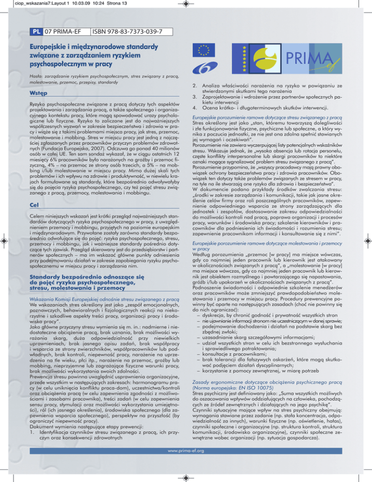 ciop_wskazania7:Layout 1 10.03.09 10:24 Strona 13 PL 07 PRIMA-EF ISBN 978-83-7373-039-7 Europejskie i międzynarodowe standardy związane z zarządzaniem ryzykiem psychospołecznym w pracy Hasła: zarządzanie ryzykiem psychospołecznym, stres związany z pracą, molestowanie, przemoc, przepisy, standardy Wstęp 2. 3. Ryzyko psychospołeczne związane z pracą dotyczy tych aspektów projektowania i zarządzania pracą, a także społecznego i organizacyjnego kontekstu pracy, które mogą spowodować urazy psychologiczne lub fizyczne. Ryzyko to zaliczane jest do najważniejszych współczesnych wyzwań w zakresie bezpieczeństwa i zdrowia w pracy i wiąże się z takimi problemami miejsca pracy, jak stres, przemoc, molestowanie i mobbing. Stres w miejscu pracy jest jedną z najczęściej zgłaszanych przez pracowników przyczyn problemów zdrowotnych (Fundacja Europejska, 2007). Odczuwa go ponad 40 milionów osób w całej UE. Ten sam sondaż wykazał, że w ciągu ostatnich 12 miesięcy 6% pracowników było narażonych na groźby i przemoc fizyczną, 4% – na przemoc ze strony osób trzecich, a 5% – na mobbing i/lub molestowanie w miejscu pracy. Mimo dużej skali tych problemów i ich wpływu na zdrowie i produktywność, w niewielu krajach formułowane są standardy, które bezpośrednio odwoływałyby się do pojęcia ryzyka psychospołecznego, czy też pojęć stresu związanego z pracą, przemocy, molestowania i mobbingu. Cel Celem niniejszych wskazań jest krótki przegląd najważniejszych standardów dotyczących ryzyka psychospołecznego w pracy, z uwzględnieniem przemocy i mobbingu, przyjętych na poziomie europejskim i międzynarodowym. Przywołane zostały zarówno standardy bezpośrednio odwołujące się do pojęć: ryzyka psychospołecznego, stresu, przemocy i mobbingu, jak i ważniejsze standardy pośrednio dotyczące tych zjawisk. Przegląd skierowany jest do przedsiębiorstw i partnerów społecznych – ma im wskazać główne punkty odniesienia przy podejmowaniu działań w zakresie zapobiegania ryzyku psychospołecznemu w miejscu pracy i zarządzania nim. Standardy bezpośrednio odnoszące się do pojęć ryzyka psychospołecznego, stresu, molestowania i przemocy Wskazania Komisji Europejskiej odnośnie stresu związanego z pracą We wskazaniach stres określony jest jako „zespół emocjonalnych, poznawczych, behawioralnych i fizjologicznych reakcji na niekorzystne i szkodliwe aspekty treści pracy, organizacji pracy i środowiska pracy”. Jako główne przyczyny stresu wymienia się m. in.: nadmierne i niedostateczne obciążenie pracą, brak uznania, brak możliwości wyrażania skarg, duża odpowiedzialność przy niewielkich uprawnieniach, brak jasnego opisu zadań, brak współpracy i wsparcia ze strony zwierzchników, współpracowników lub podwładnych, brak kontroli, niepewność pracy, narażenie na uprzedzenia na tle wieku, płci itp., narażenie na przemoc, groźby lub mobbing, nieprzyjemne lub zagrażające fizyczne warunki pracy, brak możliwości wykorzystania swoich zdolności. Prewencja stresu powinna uwzględnić usprawnienia organizacyjne, przede wszystkim w następujących zakresach: harmonogramu pracy (w celu uniknięcia konfliktu praca-dom), uczestnictwa/kontroli oraz obciążenia pracą (w celu zapewnienia zgodności z możliwościami i zasobami pracownika), treści zadań (w celu zapewnienia sensu pracy, stymulacji oraz możliwości wykorzystania umiejętności), ról (ich jasnego określenia), środowiska społecznego (dla zapewnienia wsparcia społecznego), perspektyw na przyszłość (by ograniczyć niepewność pracy). Dokument wymienia następujące etapy prewencji: 1. Identyfikacja czynników stresu związanego z pracą, ich przyczyn oraz konsekwencji zdrowotnych 4. Analiza właściwości narażenia na ryzyko w powiązaniu ze stwierdzonymi skutkami tego narażenia Zaprojektowanie i wdrożenie przez partnerów społecznych pakietu interwencji Ocena krótko- i długoterminowych skutków interwencji. Europejskie porozumienie ramowe dotyczące stresu związanego z pracą Stres określony jest jako „stan, któremu towarzyszą dolegliwości i złe funkcjonowanie fizyczne, psychiczne lub społeczne, a który wynika z poczucia jednostki, ze nie jest ona zdolna spełnić stawianych jej wymagań i oczekiwań”. Porozumienie nie zawiera wyczerpującej listy potencjalnych wskaźników stresu. Wskazuje jednak, że „wysoka absencja lub rotacja personelu, częste konflikty interpersonalne lub skargi pracowników to niektóre oznaki mogące sygnalizować problem stresu związanego z pracą”. Porozumienie przypomina, że „wszyscy pracodawcy mają prawny obowiązek ochrony bezpieczeństwa pracy i zdrowia pracowników. Obowiązek ten dotyczy także problemów związanych ze stresem w pracy, na tyle na ile stwarzają one ryzyko dla zdrowia i bezpieczeństwa”. W dokumencie podano przykłady środków zwalczania stresu: „środki w zakresie zarządzania i komunikacji, takie jak jasne określenie celów firmy oraz roli poszczególnych pracowników, zapewnienie odpowiedniego wsparcia ze strony zarządzających dla jednostek i zespołów, dostosowanie zakresu odpowiedzialności do możliwości kontroli nad pracą, poprawa organizacji i procesów pracy, warunków i środowiska pracy; szkolenie kierowników i pracowników dla podniesienia ich świadomości i rozumienia stresu; zapewnienie pracownikom informacji i konsultowanie się z nimi”. Europejskie porozumienie ramowe dotyczące molestowania i przemocy w pracy Według porozumienia „przemoc [w pracy] ma miejsce wówczas, gdy co najmniej jeden pracownik lub kierownik jest atakowany w okolicznościach związanych z pracą”, a „molestowanie [w pracy] ma miejsce wówczas, gdy co najmniej jeden pracownik lub kierownik jest obiektem rozmyślnego i powtarzającego się napastowania, gróźb i/lub upokorzeń w okolicznościach związanych z pracą”. Podnoszenie świadomości i odpowiednie s