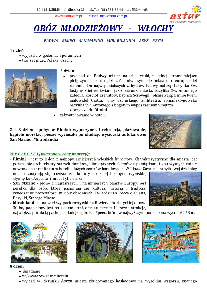 20-612 LUBLIN ul. Głęboka 29, tel./fax (81) 532-98-64, tel. 532-44-68 www.astur.com.pl e-mail: [email protected] OBÓZ MŁODZIEŻOWY - WŁOCHY PADWA – RIMINI – SAN MARINO – MIRABILANDIA – ASYŻ – RZYM 1 dzień wyjazd z w godzinach porannych tranzyt przez Polskę, Czechy 2 dzień przejazd do Padwy miasta nauki i sztuki, z jednej strony miejsce pielgrzymek, z drugiej zaś uniwersyteckie miasto o europejskiej renomie. Do najwspanialszych zabytków Padwy należą: bazylika Św. Justyny z jej relikwiami jako patronki miasta, bazylika Św. Antoniego katedra, kościół Eremitów, kaplica Scrovegni, olśniewająca mnóstwem malowideł Giotta, ruiny rzymskiego amfiteatru, romańsko-gotycka bazylika Św. Antoniego z bogatym wyposażeniem wnętrza przyjazd do Rimini zakwaterowanie w hotelu 2 – 8 dzień - pobyt w Rimini: wypoczynek i rekreacja, plażowanie, kąpiele morskie, piesze wycieczki po okolicy, wycieczki autokarowe: San Marino, Mirabilandia W Y C I E C Z K I (wliczone w cenę imprezy): Rimini – jest to jeden z najpopularniejszych włoskich kurortów. Charakterystyczne dla miasta jest połączenie architektury starych domków, klimatycznych sklepów z pamiątkami i starożytnych ruin z nowoczesną architekturą hoteli i dużych centrów handlowych. W Piazza Cavour – zabytkowej dzielnicy miasta, znajdują się pozostałości kultury etruskiej i zabytki rzymskie, słynny Łuk Augusta i most Tyberiusza. San Marino - jedno z najstarszych i najmniejszych państw Europy, jest perełką dla osób, które pasjonują się kulturą, historią i tradycją, zwiedzanie: pozostałości murów obronnych, Twierdzy La Rocca o Guaita, Bazyliki, Starego Miasta. Mirabilandia – największy park rozrywki na Riwierze Adriatyckiej o pow. 30 ha, podzielony jest na siedem stref, oferuje łącznie 44 różne atrakcje, największą atrakcją parku jest kolejka górska iSpeed, która w najwyższym punkcie ma wysokość 53 m. 8 dzień śniadanie wykwaterowanie z hotelu wyjazd w kierunku Asyżu miasta zbudowanego kaskadowo na wysokim wzgórzu, znanego głównie osoby św. Franciszka, który żył tam w czasach średniowiecza. Miasto zostało wpisane na listę światowego dziedzictwa UNESCO zwiedzanie Asyżu: Bazylika św. Franciszka, Bazylika św. Klary, Kościół Najświętszej Marii Panny Anielskiej; spacer uliczkami „kamiennego miasta” przejazd na nocleg w okolice Rzymu obiadokolacja i nocleg 9 dzień śniadanie przyjazd do Rzymu, który położony jest na siedmiu wzgórzach skupionych nad rzeką Tyber, to stolica dawnego imperium rzymskiego, centrum katolicyzmu i główny cel pielgrzymek chrześcijan z całego świata. Zróżnicowane i wielowarstwowe oblicze nowoczesnego miasta przyciąga na równi ze starożytną przeszłością, wspaniałymi pomnikami renesansu oraz skarbami Watykanu zwiedzanie Rzymu: Plac i Bazylika św. Piotra – modlitwa przy grobie św. Jana Pawła II, Piazza Navona z fontanną „Czterech Rzek”, Fontanna di Trevi – najsłynniejsza fontanna świata, Schody Hiszpańskie, obiadokolacja, nocleg 10 dzień śniadanie ciąg dalszy zwiedzania Rzymu – Koloseum – najsłynniejszy amfiteatr świata, Forum Romanum - najstarszy plac miejski w Rzymie, główny polityczny, religijny i towarzyski ośrodek starożytnego Rzymu, Kapitol - pod względem historycznym najważniejsze wzgórze Rzymu, Plac Wenecki z pomnikiem pierwszego króla zjednoczonej Italii – Wiktora Emanuela II, Forum Trajana, Panteon niezwykłe dzieło starożytnych budowniczych, którzy potrafili zrównoważyć potężną masę budynku i nadać lekkość jego formie, wyjazd z Rzymu tranzyt nocny przez Włochy, Austrię, Czechy 11 dzień śniadanie z prowiantu przyjazd na nocleg w Czechach obiadokolacja i nocleg 12 dzień śniadanie powrót do Polski w godzinach wieczornych TERMIN: 25.06 – 06.07.2016r. CENA: 1920 zł Świadczenia: transport autokarem LUX zakwaterowanie: 6 noclegów w Rimini (w hotelu *** w pokojach 3,4 osobowych z łazienką i TV, 2 noclegi w okolicach Rzymu, 1 nocleg w Czechach) wyżywienie: 2 posiłki podczas pobytu w Rimini, 2 posiłki (Rzym i Czechy) opieka pilota - przewodnika ubezpieczenie KL i NNW realizacja programu UWAGA: Uczestnicy powinni zabezpieczyć ok. 35-40 € na realizację programu (w tym ok. 25 € wejście do Mirabilandi, opłata za przejazd metrem po Rzymie)