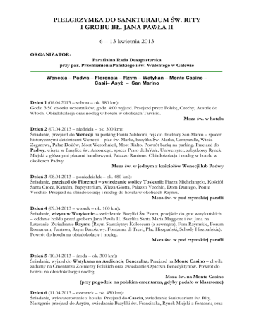 PIELGRZYMKA DO SANKTURAIUM ŚW. RITY I GROBU BŁ. JANA PAWŁA II 6 – 13 kwietnia 2013 ORGANIZATOR: Parafialna Rada Duszpasterska przy par. PrzemienieniaPańskiego i św. Walentego w Galewie Wenecja – Padwa – Florencja – Rzym – Watykan – Monte Casino – Casii– Asyż – San Marino Dzień 1 (06.04.2013 – sobota – ok. 980 km): Godz. 3:50 zbiórka uczestników, godz. 4:00 wyjazd. Przejazd przez Polskę, Czechy, Austrię do Włoch. Obiadokolacja oraz nocleg w hotelu w okolicach Tarvisio. Msza św. w hotelu Dzień 2 (07.04.2013 – niedziela – ok. 300 km): Śniadanie, przejazd do Wenecji na parking Punta Sabbioni, rejs do dzielnicy San Marco – spacer historycznymi dzielnicami Wenecji – plac św. Marka, bazylika Św. Marka, Campanilla, Wieża Zegarowa, Pałac Dożów, Most Westchnień, Most Rialto. Powrót barką na parking. Przejazd do Padwy, wizyta w Bazylice św. Antoniego, spacer Prato dellaVale, Uniwersytet, zabytkowy Rynek Miejski z głównymi placami handlowymi, Palazzo Ranione. Obiadokolacja i nocleg w hotelu w okolicach Padwy. Msza św. w jednym z kościołów Wenecji lub Padwy Dzień 3 (08.04.2013 – poniedziałek – ok. 480 km): Śniadanie, przejazd do Florencji – zwiedzanie stolicy Toskanii: Piazza Michelangelo, Kościół Santa Croce, Katedra, Baptysterium, Wieża Giotta, Palazzo Vecchio, Dom Dantego, Ponte Vecchio. Przejazd na obiadokolację i nocleg do hotelu w okolicach Rzymu. Msza św. w pod rzymskiej parafii Dzień 4 (09.04.2013 – wtorek – ok. 100 km): Śniadanie, wizyta w Watykanie – zwiedzanie Bazyliki Św Piotra, przejście do grot watykańskich – oddanie hołdu przed grobem Jana Pawła II. Bazylika Santa Maria Maggiore i św. Jana na Lateranie. Zwiedzanie Rzymu (Rzym Starożytny: Koloseum (z zewnątrz), Fora Rzymskie, Forum Romanum, Panteon, Rzym Barokowy: Fontanna di Trevi, Plac Hiszpański, Schody Hiszpańskie). Powrót do hotelu na obiadokolacje i nocleg. Msza św. w pod rzymskiej parafii Dzień 5 (10.04.2013 – środa – ok. 300 km): Śniadanie, wyjazd do Watykanu na Audiencję Generalną. Przejazd na Monte Casino – chwila zadumy na Cmentarzu Żołnierzy Polskich oraz zwiedzanie Opactwa Benedyktynów. Powrót do hotelu na obiadokolację i nocleg. Msza św. na Monte Casino (przy pogodzie na polskim cmentarzu, gdyby padało w klasztorze) Dzień 6 (11.04.2013 – czwartek – ok. 450 km): Śniadanie, wykwaterowanie z hotelu. Przejazd do Cascia, zwiedzanie Sanktuarium św. Rity. Następnie przejazd do Asyżu, zwiedzanie Bazyliki św. Franciszka, Rynek Miejski z fontanną oraz antyczną świątynią Minerwy, spacer średniowiecznymi uliczkami umbryjskiego miasta. Przejazd na obiadokolację i nocleg do hotelu na Riwierze Adriatyckiej. Msza św. w Casii lub Asyżu Dzień 7 (12.04.2013 – piątek – ok. 480 km): Śniadanie. Przejazd do San Marino – zwiedzanie najstarszej republiki świata, czas wolny na zakupy. Przejazd na obiadokolację i nocleg do hotelu w okolicach Tarvisio. Msza św. w kościele parafialnym Dzień 8 (13.04.2013 – sobota – ok. 980 km): Wczesne śniadanie. Przejazd przez Austrię, Czechy, powrót do miejsca zamieszkania ok. godz. 23:00. Miejsce mszy św. jeszcze do ustalenia Dokładne miejsca i godziny mszy św. podane będą na ostatnim spotkaniu przed wyjazdem. Cena: 1695 zł/os i 75 €/os Cena obejmuje: przejazd autokarem wyposażonym w klimatyzację, toaletę, dvd, cafe – bar; zakwaterowanie: 7 noclegów w hotelach**/***, pokoje 2 os. z łazienkami; wyżywienie: 7 śniadań kontynentalnych i 7 obiadokolacji; ubezpieczenie KL i NW; realizację programu, opiekę pilota. Cena nie obejmuje: biletów wstępu do zwiedzanych obiektów, biletów komunikacji miejskiej w Rzymie, przewodników lokalnych, płatnych wjazdów do zwiedzanych miast, autostrad, barki w Wenecji 75 €/os. Uwaga! Do obiadokolacji podawana jest woda, napoje dodatkowo płatne. Ubezpieczenie KL nie obejmuje chorób przewlekłych. Kontakt: - ks. Maksymilian Skorek, wikariusz par. Podwyższenia Krzyża Świętego w Kole - ks. Jacek Buda, proboszcz par. w Galewie