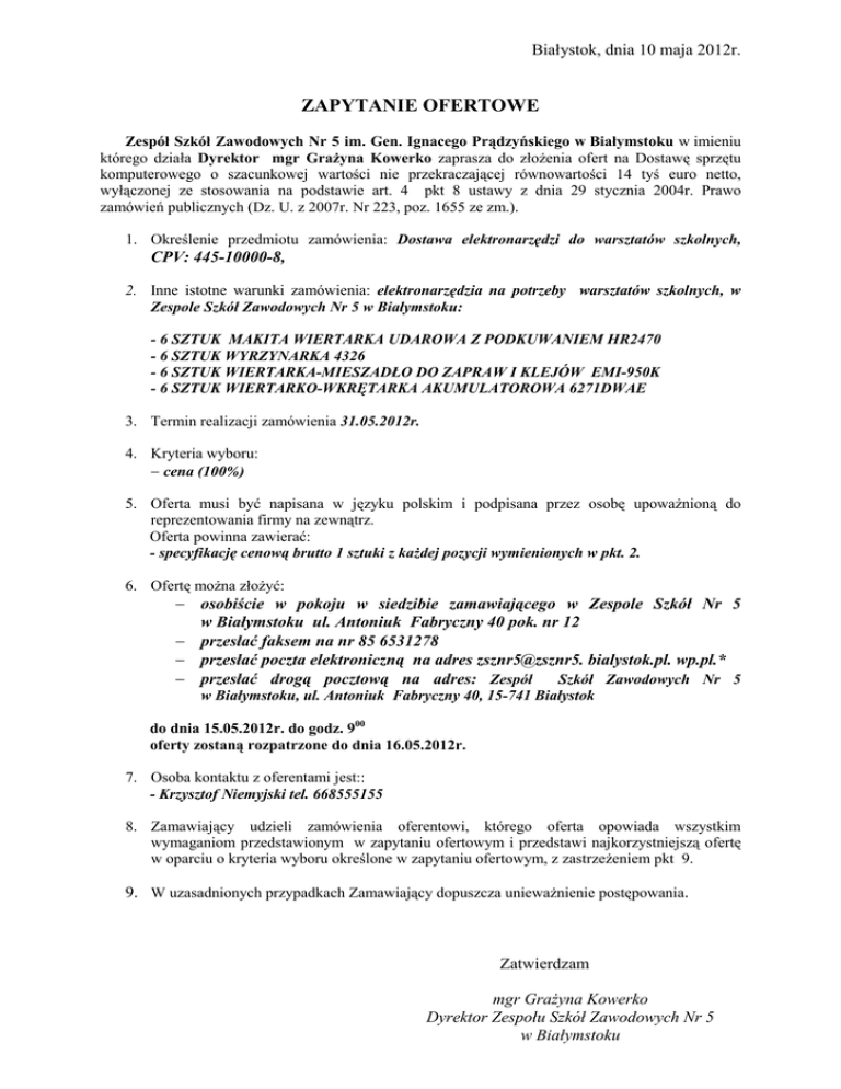 Białystok, dnia 10 maja 2012r. ZAPYTANIE OFERTOWE Zespół Szkół Zawodowych Nr 5 im. Gen. Ignacego Prądzyńskiego w Białymstoku w imieniu którego działa Dyrektor mgr Grażyna Kowerko zaprasza do złożenia ofert na Dostawę sprzętu komputerowego o szacunkowej wartości nie przekraczającej równowartości 14 tyś euro netto, wyłączonej ze stosowania na podstawie art. 4 pkt 8 ustawy z dnia 29 stycznia 2004r. Prawo zamówień publicznych (Dz. U. z 2007r. Nr 223, poz. 1655 ze zm.). 1. Określenie przedmiotu zamówienia: Dostawa elektronarzędzi do warsztatów szkolnych, CPV: 445-10000-8, 2. Inne istotne warunki zamówienia: elektronarzędzia na potrzeby warsztatów szkolnych, w Zespole Szkół Zawodowych Nr 5 w Białymstoku: - 6 SZTUK MAKITA WIERTARKA UDAROWA Z PODKUWANIEM HR2470 - 6 SZTUK WYRZYNARKA 4326 - 6 SZTUK WIERTARKA-MIESZADŁO DO ZAPRAW I KLEJÓW EMI-950K - 6 SZTUK WIERTARKO-WKRĘTARKA AKUMULATOROWA 6271DWAE 3. Termin realizacji zamówienia 31.05.2012r. 4. Kryteria wyboru: − cena (100%) 5. Oferta musi być napisana w języku polskim i podpisana przez osobę upoważnioną do reprezentowania firmy na zewnątrz. Oferta powinna zawierać: - specyfikację cenową brutto 1 sztuki z każdej pozycji wymienionych w pkt. 2. 6. Ofertę można złożyć: − osobiście w pokoju w siedzibie zamawiającego w Zespole Szkół Nr 5 w Białymstoku ul. Antoniuk Fabryczny 40 pok. nr 12 − przesłać faksem na nr 85 6531278 − przesłać poczta elektroniczną na adres zsznr5@zsznr5. bialystok.pl. wp.pl.* − przesłać drogą pocztową na adres: Zespół Szkół Zawodowych Nr 5 w Białymstoku, ul. Antoniuk Fabryczny 40, 15-741 Białystok do dnia 15.05.2012r. do godz. 900 oferty zostaną rozpatrzone do dnia 16.05.2012r. 7. Osoba kontaktu z oferentami jest:: - Krzysztof Niemyjski tel. 668555155 8. Zamawiający udzieli zamówienia oferentowi, którego oferta opowiada wszystkim wymaganiom przedstawionym w zapytaniu ofertowym i przedstawi najkorzystniejszą ofertę w oparciu o kryteria wyboru określone w zapytaniu ofertowym, z zastrzeżeniem pkt 9. 9. W uzasadnionych przypadkach Zamawiający dopuszcza unieważnienie postępowania. Zatwierdzam mgr Grażyna Kowerko Dyrektor Zespołu Szkół Zawodowych Nr 5 w Białymstoku