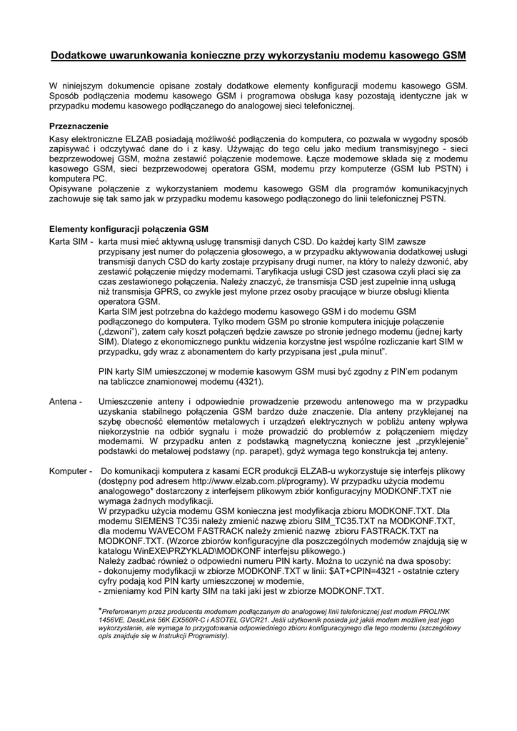 Dodatkowe uwarunkowania konieczne przy wykorzystaniu modemu kasowego GSM W niniejszym dokumencie opisane zostały dodatkowe elementy konfiguracji modemu kasowego GSM. Sposób podłączenia modemu kasowego GSM i programowa obsługa kasy pozostają identyczne jak w przypadku modemu kasowego podłączanego do analogowej sieci telefonicznej. Przeznaczenie Kasy elektroniczne ELZAB posiadają możliwość podłączenia do komputera, co pozwala w wygodny sposób zapisywać i odczytywać dane do i z kasy. Używając do tego celu jako medium transmisyjnego - sieci bezprzewodowej GSM, można zestawić połączenie modemowe. Łącze modemowe składa się z modemu kasowego GSM, sieci bezprzewodowej operatora GSM, modemu przy komputerze (GSM lub PSTN) i komputera PC. Opisywane połączenie z wykorzystaniem modemu kasowego GSM dla programów komunikacyjnych zachowuje się tak samo jak w przypadku modemu kasowego podłączonego do linii telefonicznej PSTN. Elementy konfiguracji połączenia GSM Karta SIM - karta musi mieć aktywną usługę transmisji danych CSD. Do każdej karty SIM zawsze przypisany jest numer do połączenia głosowego, a w przypadku aktywowania dodatkowej usługi transmisji danych CSD do karty zostaje przypisany drugi numer, na który to należy dzwonić, aby zestawić połączenie między modemami. Taryfikacja usługi CSD jest czasowa czyli płaci się za czas zestawionego połączenia. Należy znaczyć, że transmisja CSD jest zupełnie inną usługą niż transmisja GPRS, co zwykle jest mylone przez osoby pracujące w biurze obsługi klienta operatora GSM. Karta SIM jest potrzebna do każdego modemu kasowego GSM i do modemu GSM podłączonego do komputera. Tylko modem GSM po stronie komputera inicjuje połączenie („dzwoni”), zatem cały koszt połączeń będzie zawsze po stronie jednego modemu (jednej karty SIM). Dlatego z ekonomicznego punktu widzenia korzystne jest wspólne rozliczanie kart SIM w przypadku, gdy wraz z abonamentem do karty przypisana jest „pula minut”. PIN karty SIM umieszczonej w modemie kasowym GSM musi być zgodny z PIN’em podanym na tabliczce znamionowej modemu (4321). Antena - Umieszczenie anteny i odpowiednie prowadzenie przewodu antenowego ma w przypadku uzyskania stabilnego połączenia GSM bardzo duże znaczenie. Dla anteny przyklejanej na szybę obecność elementów metalowych i urządzeń elektrycznych w pobliżu anteny wpływa niekorzystnie na odbiór sygnału i może prowadzić do problemów z połączeniem między modemami. W przypadku anten z podstawką magnetyczną konieczne jest „przyklejenie” podstawki do metalowej podstawy (np. parapet), gdyż wymaga tego konstrukcja tej anteny. Komputer - Do komunikacji komputera z kasami ECR produkcji ELZAB-u wykorzystuje się interfejs plikowy (dostępny pod adresem http://www.elzab.com.pl/programy). W przypadku użycia modemu analogowego* dostarczony z interfejsem plikowym zbiór konfiguracyjny MODKONF.TXT nie wymaga żadnych modyfikacji. W przypadku użycia modemu GSM konieczna jest modyfikacja zbioru MODKONF.TXT. Dla modemu SIEMENS TC35i należy zmienić nazwę zbioru SIM_TC35.TXT na MODKONF.TXT, dla modemu WAVECOM FASTRACK należy zmienić nazwę zbioru FASTRACK.TXT na MODKONF.TXT. (Wzorce zbiorów konfiguracyjne dla poszczególnych modemów znajdują się w katalogu WinEXE\PRZYKLAD\MODKONF interfejsu plikowego.) Należy zadbać również o odpowiedni numeru PIN karty. Można to uczynić na dwa sposoby: - dokonujemy modyfikacji w zbiorze MODKONF.TXT w linii: $AT+CPIN=4321 - ostatnie cztery cyfry podają kod PIN karty umieszczonej w modemie, - zmieniamy kod PIN karty SIM na taki jaki jest w zbiorze MODKONF.TXT. *Preferowanym przez producenta modemem podłączanym do analogowej linii telefonicznej jest modem PROLINK 1456VE, DeskLink 56K EX560R-C i ASOTEL GVCR21. Jeśli użytkownik posiada już jakiś modem możliwe jest jego wykorzystanie, ale wymaga to przygotowania odpowiedniego zbioru konfiguracyjnego dla tego modemu (szczegółowy opis znajduje się w Instrukcji Programisty).