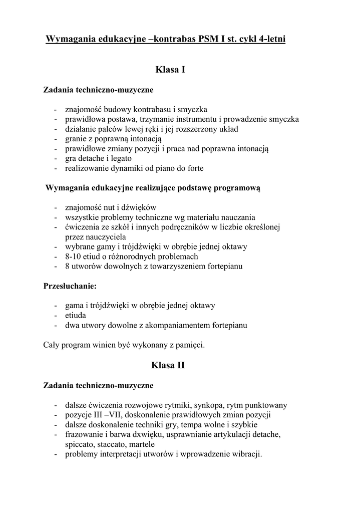 Wymagania edukacyjne –kontrabas PSM I st. cykl 4-letni Klasa I Zadania techniczno-muzyczne - znajomość budowy kontrabasu i smyczka prawidłowa postawa, trzymanie instrumentu i prowadzenie smyczka działanie palców lewej ręki i jej rozszerzony układ granie z poprawną intonacją prawidłowe zmiany pozycji i praca nad poprawna intonacją gra detache i legato realizowanie dynamiki od piano do forte Wymagania edukacyjne realizujące podstawę programową - znajomość nut i dźwięków - wszystkie problemy techniczne wg materiału nauczania - ćwiczenia ze szkół i innych podręczników w liczbie określonej przez nauczyciela - wybrane gamy i trójdźwięki w obrębie jednej oktawy - 8-10 etiud o różnorodnych problemach - 8 utworów dowolnych z towarzyszeniem fortepianu Przesłuchanie: - gama i trójdźwięki w obrębie jednej oktawy - etiuda - dwa utwory dowolne z akompaniamentem fortepianu Cały program winien być wykonany z pamięci. Klasa II Zadania techniczno-muzyczne dalsze ćwiczenia rozwojowe rytmiki, synkopa, rytm punktowany pozycje III –VII, doskonalenie prawidłowych zmian pozycji dalsze doskonalenie techniki gry, tempa wolne i szybkie frazowanie i barwa dxwięku, usprawnianie artykulacji detache, spiccato, staccato, martele - problemy interpretacji utworów i wprowadzenie wibracji. - Wymagania edukacyjne realizujące podstawę programową - opanowanie gry w pozycjach I – VII wszystkie problemy techniczne wg programu nauczania ćwiczenia ze szkół i innych podręczników gamy i pasaże wg programu nauczania 10 etiud o różnorodnej problematyce 8 utworów z akompaniamentem fortepianu Przesłuchanie półroczne - gama i pasaże w obrębie dwóch oktaw - etiuda - utwór z akompaniamentem fortepianu Egzamin promocyjny - dwie etiudy o zróżnicowanej problematyce technicznej - dwa utwory z akompaniamentem fortepianu Cały program winien być wykonany z pamięci. Klasa III Zadania techniczno –muzyczne - pozycje VIII – X doskonalenie trylu oraz przednutki krótkiej i długiej dalsze ćwiczenia szybkości gry rozwijanie pamięci muzycznej –wzrokowej, manualnej, intelektualnej dynamika od piano do forte, crescendo, diminuendo, akcenty doskonalenie prawidłowych zmian pozycji ćwiczenia przygotowawcze do wibracji nauka obycia estradowego i pokonywanie tremy gra zespołowa i gra z akompaniamentem rozwijanie umiejętności samodzielnego ćwiczenia. Wymagania edukacyjne realizujące podstawę programową - wszystkie problemy techniczne wg programu nauczania ćwiczenia ze szkół i innych podręczników gamy i pasaże wg materiału nauczania 10 etiud o zróżnicowanej problematyce 8 utworów z akompaniamentem fortepianu. Przesłuchanie półroczne - gama i pasaże dur lub moll w obrębie dwóch oktaw - etiuda - utwór lub II część Sonaty -z akompaniamentem Egzamin promocyjny: - dwie etiudy o zróżnicowanej problematyce - dwa utwory lub jedna część koncertu z akompaniamentem Cały program winien być wykonany z pamięci. Klasa IV Zadania techniczno –muzyczne - układ aparatu gry –pozycje kciukowe dalsze doskonalenie techniki gry, tempa szybkie i wolne usprawnienie artykulacji detache, spiccato, staccato, martele swobodna wibracja z płynną zmianą pozycji problemy interpretacji utworów poprawna intonacja, frazowanie i barwa dźwięku doskonalenie obycia estradowego utrwalanie umiejętności samodzielnego ćwiczenia opanowanie gry w pozycjach I -X Wymagania edukacyjne realizujące podstawę programową - gamy, pasaże z zastosowaniem pozycji I –X wszystkie problemy techniczne wg programu nauczania ćwiczenia ze szkół i innych podręczników 10 etiud o różnorodnej problematyce dwie części sonaty lub I cz. koncertu z akompaniamentem 8 utworów dowolnych z akompaniamentem Przesłuchanie półroczne - gama dur lub moll, pasaże w obrębie dwóch oktaw - etiuda - utwór z akompaniamentem Egzamin promocyjny: - dwie etiudy o zróżnicowanej problematyce - dwa utwory z akompaniamentem dla uczniów bardzo zdolnych: - dwie etiudy - dwie kontrastujące części sonaty - I lub II i III cz. koncertu lub temat z wariacjami z akomp. - utwór dowolny z akompaniamentem Cały program winien być wykonany z pamięci.