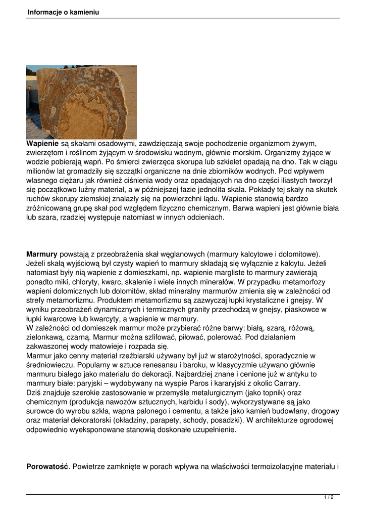 Informacje o kamieniu Wapienie są skałami osadowymi, zawdzięczają swoje pochodzenie organizmom żywym, zwierzętom i roślinom żyjącym w środowisku wodnym, głównie morskim. Organizmy żyjące w wodzie pobierają wapń. Po śmierci zwierzęca skorupa lub szkielet opadają na dno. Tak w ciągu milionów lat gromadziły się szczątki organiczne na dnie zbiorników wodnych. Pod wpływem własnego ciężaru jak również ciśnienia wody oraz opadających na dno części iliastych tworzył się początkowo luźny materiał, a w późniejszej fazie jednolita skała. Pokłady tej skały na skutek ruchów skorupy ziemskiej znalazły się na powierzchni lądu. Wapienie stanowią bardzo zróżnicowaną grupę skał pod względem fizyczno chemicznym. Barwa wapieni jest głównie biała lub szara, rzadziej występuje natomiast w innych odcieniach. Marmury powstają z przeobrażenia skał węglanowych (marmury kalcytowe i dolomitowe). Jeżeli skałą wyjściową był czysty wapień to marmury składają się wyłącznie z kalcytu. Jeżeli natomiast były nią wapienie z domieszkami, np. wapienie margliste to marmury zawierają ponadto miki, chloryty, kwarc, skalenie i wiele innych minerałów. W przypadku metamorfozy wapieni dolomicznych lub dolomitów, skład mineralny marmurów zmienia się w zależności od strefy metamorfizmu. Produktem metamorfizmu są zazwyczaj łupki krystaliczne i gnejsy. W wyniku przeobrażeń dynamicznych i termicznych granity przechodzą w gnejsy, piaskowce w łupki kwarcowe lub kwarcyty, a wapienie w marmury. W zależności od domieszek marmur może przybierać różne barwy: białą, szarą, różową, zielonkawą, czarną. Marmur można szlifować, piłować, polerować. Pod działaniem zakwaszonej wody matowieje i rozpada się. Marmur jako cenny materiał rzeźbiarski używany był już w starożytności, sporadycznie w średniowieczu. Popularny w sztuce renesansu i baroku, w klasycyzmie używano głównie marmuru białego jako materiału do dekoracji. Najbardziej znane i cenione już w antyku to marmury białe: paryjski – wydobywany na wyspie Paros i kararyjski z okolic Carrary. Dziś znajduje szerokie zastosowanie w przemyśle metalurgicznym (jako topnik) oraz chemicznym (produkcja nawozów sztucznych, karbidu i sody), wykorzystywane są jako surowce do wyrobu szkła, wapna palonego i cementu, a także jako kamień budowlany, drogowy oraz materiał dekoratorski (okładziny, parapety, schody, posadzki). W architekturze ogrodowej odpowiednio wyeksponowane stanowią doskonałe uzupełnienie. Porowatość. Powietrze zamknięte w porach wpływa na właściwości termoizolacyjne materiału i 1/2 Informacje o kamieniu zdolności tłumienia dźwięków. Im więcej kamień zawiera porów, tym lepiej izoluje cieplnie i ma lepsze właściwości wyciszające. Najmniej porowaty kamień to granit, a najbardziej – trawertyn. Faktura powierzchni i ładna barwa trawertynu (kremowa, beżowa, różowa), która dzięki polerowaniu staje się jeszcze bardziej wyrazista, czyni z niego atrakcyjną okładzinę ścienną. Trawertynu używa się też na posadzki i parapety, chociaż wtedy wymaga wypełnienia porów specjalną żywicą. Konserwacja. Na rynku jest wiele specjalistycznych preparatów do zabezpieczania, czyszczenia i konserwacji kamienia. Inne ich rodzaje stosuje się do konserwacji marmuru, inne do granitu, a jeszcze inne do piaskowca. Wynika to z odmiennego składu chemicznego różnych skał. Marmur i wapień zbity to po prostu węglan wapnia. Na takie skały niszcząco działają wszelkie nawet najsłabsze kwasy – także te, których używamy w kuchni, jak kwas cytrynowy, ocet czy kwasy owocowe. Dlatego blaty kamienne w kuchni trzeba od razu po położeniu zabezpieczyć preparatem odpowiednim do rodzaju kamienia. Opłaca się więc zamówić nie tylko przycięcie płyty, ale i jej impregnację. Należy też uważać z wszelkimi chemikaliami – także tymi do użytku domowego (zwłaszcza preparatami do czyszczenia łazienek usuwającymi kamień i rdzę). Mogą zniszczyć nawet najbardziej odporne kamienie. Powodują powstanie plam i wżerów również na bardzo odpornych płytach granitowych, nie wspominając o marmurach i trawertynach. Tam, gdzie są blaty kamienne, trzeba uważać z farbą, tuszem i wszelkimi barwnymi cieczami. Kolorowe plamy są bardzo trudne do usunięcia z każdej kamiennej powierzchni (oczywiście im bardziej jest nasiąkliwa, tym łatwiej ją zabrudzić). Nieraz kończy się to powtórnym szlifowaniem i polerowaniem zabrudzonej w ten sposób płyty kamiennej. http://www.youtube.com/watch?v=q9McN9K3e_w 2/2