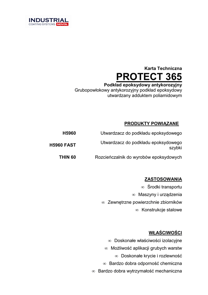 Karta Techniczna PROTECT 365 Podkład epoksydowy antykorozyjny Grubopowłokowy antykorozyjny podkład epoksydowy utwardzany adduktem poliamidowym PRODUKTY POWIĄZANE H5960 Utwardzacz do podkładu epoksydowego H5960 FAST Utwardzacz do podkładu epoksydowego szybki THIN 60 Rozcieńczalnik do wyrobów epoksydowych ZASTOSOWANIA • Środki transportu • Maszyny i urządzenia • Zewnętrzne powierzchnie zbiorników • Konstrukcje stalowe WŁAŚCIWOŚCI • Doskonałe właściwości izolacyjne • Możliwość aplikacji grubych warstw • Doskonałe krycie i rozlewność • Bardzo dobra odporność chemiczna • Bardzo dobra wytrzymałość mechaniczna PROTECT 365 Karta Techniczna 11.07.2014 PODŁOŻA Stal Oczyścić do stopnia czystości Sa 21/2 (obróbka strumieniowa) lub St3 (czyszczenie ręczne lub z wykorzystaniem narzędzia z napędem mechanicznym) wg PN-ISO 12944-4; powierzchnia po obróbce powinna być wolna od oleju, smaru, pyłu, luźno związanej z podłożem starej powłoki malarskiej, zgorzeliny walcowniczej, rdzy i obcych zanieczyszczeń; powierzchnia powinna wykazywać połysk pochodzący od metalowego podłoża. Stare powłoki lakierowe Odtłuścić i przeszlifować na sucho papierem P220 - P360. Szpachlówki poliestrowe Przeszlifować na sucho, do końcowego wyrównania P240 ÷ P320. Stal ocynkowana, aluminium W celu uzyskania chropowatości podłoża zastosować delikatną obróbkę strumieniowo-ścierną stosując kuliste materiały niemetaliczne lub szlifować papierem ściernym P240-P320 a następnie odtłuścić. Stal nierdzewna Odtłuścić i zmatowić papierem ściernym P240-P320. Ponownie odtłuścić. Laminaty poliestrowe Przeszlifować na sucho P280 i odtłuścić. PROPORCJE MIESZANIA Objętościowo Wagowo PROTECT 365 4 100 H5960 1 16 25% 14 4 100 1 16 15% 8 THIN 60 PROTECT 365 H5960 Fast THIN 60 Ilość rozcieńczalnika dodajemy w przeliczeniu na podkład. LEPKOŚĆ 52 ÷ 68 s DIN 4/20°C APLIKACJA Natrysk pneumatyczny UWAGA: uwzględnić wskazówki producenta sprzętu Natrysk hydrodynamiczny z osłoną powietrza Liczba warstw Dysza Ciśnienie Odległość 1.8 ÷ 2.2 mm 3 ÷ 4 bar 15 ÷ 20 cm 0.38 ÷ 0.43 mm (0.015” ÷ 0.017 ”) 100 ÷ 160 bar Osłona powietrza 2 bary, 10 ÷ 15 cm 1-2 UWAGA: W przypadku gdy podkład epoksydowy jest jedynym podkładem w powłoce lakierniczej jego grubość nie może być mniejsza niż 80 µm. Grubość pojedynczej suchej warstwy. 80 µm 2/4 PROTECT 365 Karta Techniczna 11.07.2014 ok.7.3 m2/l przy 80 µm Wydajność mieszanki gotowej do użycia dla grubości suchej powłoki w podanym zakresie PROTECT 365 + H5960 (4+1) Wydajność praktyczna zależy od kształtu podłoża, jego chropowatości, parametrów aplikacji. Trwałość mieszanki w 20oC 12 godz. dla utwardzacza H 5960 4 godz. dla utwardzacza H5960 FAST Czas odparowania między warstwami 10 ÷15 min CZAS UTWARDZANIA Czas do szlifowania H 5960 Dla grubości suchej warstwy max. 130 µm. 20°C 24 godz. H5960 Fast 60°C 45 min. 20°C 60°C 14 godz. 30 min. SUSZENIE PROMIENNIKIEM PODCZERWIENI Odległość Stosować się do zaleceń producenta sprzętu Czas w zależności od rodzaju i mocy lampy 10 ÷ 20 min. UWAGA: Wygrzewanie promiennikiem rozpocząć nie wcześniej niż po 10 min. od aplikacji ostatniej warstwy. SZLIFOWANIE Szlifowanie na sucho P240 ÷ P500 Szlifowanie na mokro P400 ÷ P800 POKRYWALNY PRZEZ Pokrywalny przez wszystkie lakiery nawierzchniowe NOVOL. Nakładanie farby nawierzchniowej możliwe po upływie 45 min przy grubości 80µm podkładu. Maksymalny czas malowania bez matowania wynosi 48 godz. Utwardzacz H 5960 FAST pozwala na nakładanie szpachlówki przemysłowej Tech Plus po 4 godz. DANE TECHNICZNE Zawartość części stałych wagowo Zawartość części stałych objętościowo Gęstość PROTECT 365 ≈ 76 % ≈ 58 % ≈ 1.57 g/cm3 H5960 ≈ 68% ≈ 65% ≈ 0.92 g/cm3 PROTECT 365 + H5960 (4+1) ≈ 74% ≈ 59% ≈ 1.44 g/cm3 Wyrób 3/4 PROTECT 365 Karta Techniczna 11.07.2014 ZAWARTOŚĆ ORGANICZNYCH CZĘŚCI LOTNYCH VOC II/B/c limit* 540 g/l VOC rzeczywiste 510 g/l (dla układu 4+1 + 25% THIN 60) * Dla mieszaniny gotowej do aplikacji według Dyrektywy UE 2004/42/CE DOBARWIANIE Nie zalecane. WARUNKI APLIKACJI Malowana powierzchnia musi być sucha. Temperatura farby, malowanej powierzchni jak i otoczenia powinna mieścić się w zakresie od +15°C do +25°C, a wilgotno ść względna nie powinna przekraczać 80%. Temperatura malowanej powierzchni powinna być wyższa od temperatury punktu rosy o min. 3°C. KOLOR Szary, beżowy. CZYSZCZENIE SPRZĘTU Rozcieńczalnik do wyrobów epoksydowych THIN 60. WARUNKI PRZECHOWYWANIA Przechowywać w chłodnych i suchych pomieszczeniach z dala od źródeł ognia i ciepła. Unikać naświetlania promieniami słonecznymi. TERMINY PRZYDATNOŚCI * PROTECT 365 24 miesiące/20°C H5960 24 miesiące/20°C H5960 FAST 24 miesiące/20°C THIN 60 24 miesiące/20°C * W oryginalnie zamkniętym opakowaniu. BEZPIECZEŃSTWO Patrz Karta Charakterystyki INNE INFORMACJE Efektywność naszych systemów jest wynikiem badań laboratoryjnych oraz wieloletniego doświadczenia. Dane zawarte w niniejszym materiale są zgodne z aktualnym stanem wiedzy o naszych produktach i możliwościach ich stosowania. Gwarantujemy wysoką jakość pod warunkiem, że są spełnione nasze instrukcje i że praca jest wykonana zgodnie z zasadami dobrego rzemiosła. Konieczne jest wykonanie próbnego zastosowania produktu ze względu na potencjalnie różne zachowanie się wyrobu z różnymi materiałami. Nie ponosimy odpowiedzialności jeżeli na końcowy rezultat pracy miały wpływ czynniki znajdujące się poza naszą kontrolą. 4/4
