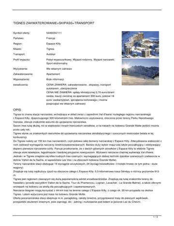 TIGNES ZAKWATEROWANIE+SKIPASS+TRANSPORT Symbol oferty: 5446034/111 Państwo: Francja Region: Espace Killy Miasto: Tignes Transport: Autokar Profil wyjazdu: Pobyt wypoczynkowy, Wyjazd rodzinny, Wyjazd narciarski, Wyżywienie: We własnym zakresie Zakwaterowanie: Apartament Wyposażenie: Brak informacji świadczenia: CENA ZAWIERA: zakwaterowanie , skipassy, transport Sport ekstremalny autokarem, ubezpieczenie CENA NIE ZAWIERA: opłaty klimatycznej 0,70 euro/dzień/ osoba, kaucji zwrotnej za apartament 300 euro, pościel 18 euro/ osoba/tydzień, sprzątania końcowego ( można posprzątać we własnym zakresie) OPIS Tignes to znana stacja narciarska, wchodząca w skład (wraz z sąsiednim Val d'Isere) rozległego regionu narciarskiego L'Espace Killy, dysponującego 300 kilometrami tras. Malowniczo usytuowana, otoczona przez tereny Parku Narodowego Vanoise, oferuje znakomite warunki do uprawiania narciarstwa. Sezon trwa tutaj dłużej, niż w większości innych francuskich ośrodków, a na trasach na lodowcu Grande Motte jeździć można przez cały rok. Tignes słynie ze znakomitych warunków do uprawiania narciarstwa akrobatycznego i corocznych mistrzostw świata w tej konkurencji. Do Tignes należy aż 150 km tras narciarskich, czyli połowa całej domeny narciarskiej L'Espace Killy. Zdecydowana większość z nich zadowoli wymagania narciarzy średniozaawansowanych. Bardzo duży wybór mają tutaj także początkujący i zdobywający dopiero pierwsze narciarskie szlify. Panuje przekonanie, że z dwóch głównych ośrodków L'Espace Killy to właśnie Tignes oferuje stoki łatwiejsze, łagodniejsze i bardziej przyjazne nowicjuszom. Wytrawni narciarze chętniej wybierają Val d'Isere. Jednak i w Tignes znajdzie się kilka trudnych tras czarnych i wymagających dobrej techniki zjazdów czerwonych (zwłaszcza w dolinie Vallon de la Sache, w sąsiedztwie Les Ves i na zboczach lodowca Grande Motte). Tereny narciarskie stacji obsługuje 19 wyciągów orczykowych, 24 wyciągi krzesełkowe i 3 kolejki linowe (w tym jedna - duże wagony). Znajduje się tutaj najdłuższy zjazd na obszarze całego L'Espace Killy: 5,5-kilometrowa trasa Génépy o różnicy poziomów 913 m. Tignes jest regionem cieszącym się dużą popularnością wśród snowboardzistów. Znajdują się tutaj znakomite tereny do freeeide'u (przede wszystkim Vallon de la Sache, Tour du Pramencou, Lognan, Lavachet - La Grande Balme), a także olbrzymi snowpark na lodowcu ze strefą dla początkujących i zaawansowanych. Narciarze biegowi mogą korzystać z 44 km tras na terenie całego L'Espace Killy, z czego ok. 20 km przypada na okolice Tignes. Latem wytyczana jest trasa na lodowcu Grande Motte. Oferta pozanarciarska stacji obejmuje m.in. paragliding, rakiety śnieżne, przygotowane trasy do pieszych wędrówek, przejażdżki skuterem śnieżnym, psie zaprzęgi, ski - joëring i nurkowanie pod lodem w jeziorze Lac du Chevril. 1/3 Dużą atrakcją jest również centrum sportowo-rekreacyjne Espace Forme (Tignespace) o powierzchni 3 tys. m? (tenis, joga, ściana wspinaczkowa, siłownia, fitness), a także otwarty w 2006 roku aquapark "le Lagon" (5 tys. m? powierzchni, baseny, sauna, hammam, jacuzzi, sala fitness, siłownia). Warta zobaczenia jest grota lodowa na lodowcu Grande Motte na wysokości 3 000 m n.p.m. Po nartach zapraszają liczne restauracje, bary, puby i dyskoteki. TIGNES to także: *dogodny dojazd: 3 godz. drogi z lotniska Lyon Saint Exupéry i z lotniska w Genewie, regularne linie kolejowe z Londynu (Eurostar), z Belgii i Holandii (Thalys) do Bourg Saint Maurice. *snowpark, uważany za największy w Europie. *wyjątkowe położenie w sercu cyrku górskiego o 360° panoramie. W środku areny jezioro, skute lodem przez większą część roku, które można przemierzyć wzdłuż i wszerz pieszo lub psim zaprzęgiem. Aparatamenty 4 i 6 osobowe, 2 pokojowe z wyposażona kuchnia, łazienką i WC w rezydencji Le Hameau du Borsat i rezydencji du Val Claret. Uwaga! Podane powyżej opisy są przykładowe i w zależności od konkretnej rezydencji mogą nieco odbiegać od podanych poniżej. TERMINY: od: 2018-01-13 do: 2018-01-22 (10 dni), miejsca: zamów cena od: 1668 PLN od: 2018-01-13 do: 2018-01-22 (10 dni), miejsca: zamów cena od: 1902 PLN od: 2018-01-20 do: 2018-01-29 (10 dni), miejsca: zamów cena od: 1744 PLN od: 2018-01-20 do: 2018-01-29 (10 dni), miejsca: zamów cena od: 2028 PLN CENNIK: Długość pobytu: 10 dni 10 dni 10 dni 10 dni Grupa cenowa: F H D I (-) (-) (-) (-) 50 50 50 50 50 50 50 50 (-) (-) (-) (-) 8964 6966 9693 5526 4590 6030 40 40 40 40 20 20 20 20 3% 3% 3% 500 500 500 Miasto wyjazdowe (do wyboru) Katowice Kraków Wrocław 20 (*) Bielsko-Biała 3 Pobyt w obiekcie (do wyboru) apartament 6-osobowy standardowo dla osób: 6 7911 (*) apartament 4-osobowy standardowo dla osób: 4 4896 Ubezpieczenie (do wyboru) ubezpieczene NWKL SKI (*) ubezpieczenie NW KL Ubezpieczenie (opcjonalne) ubezpieczenie - od kosztów rezygnacji 3% Inne (do wyboru) (*) Transport tam i spo 500 Waluta: PLN Aktualne ceny z systemu S.A.R.T. (-) - cena usługi, podatku kalkulowana przy osobie lub gratis 2/3 (*) - kwota wliczona w cenę standardową 3/3
