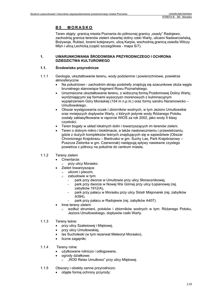 Studium uwarunkowań i kierunków zagospodarowania przestrzennego miasta Poznania ¶ B5 UWARUNKOWANIA STREFA B B5 Morasko MORASKO Teren objęty: granicą miasta Poznania do północnej granicy „osady” Radojewo, zachodnią granica terenów zieleni otwartej doliny rzeki Warty, ulicami Nadwarciańską, Bożywoja, Rubież, torami kolejowymi, ulicą Karpia, wschodnią granicą osiedla Wilczy Młyn i ulicą Lechicką (część szczegółowa - mapa S/7). 1. UWARUNKOWANIA ŚRODOWISKA PRZYRODNICZEGO I OCHRONA DZIEDZICTWA KULTUROWEGO 1.1. Środowisko przyrodnicze 1.1.1 Geologia, ukształtowanie terenu, wody podziemne i powierzchniowe, powietrze atmosferyczne • Na południowo - zachodnim skraju podstrefy znajdują się szacunkowe złoża węgla brunatnego stanowiące fragment Rowu Poznańskiego. • Urozmaicone ukształtowanie terenu, z widoczną formą Przełomowej Doliny Warty, wyróżniającymi się formami wysoczyzn morenowych z kulminacyjnym wypiętrzeniem Góry Moraskiej (154 m n.p.m.) oraz formy sandru Naramowicko – Umultowskiego. • Obszar występowania oczek i zbiorników wodnych, w tym Jezioro Umultowskie oraz mniejszych dopływów Warty, z których jedynie wody Różanego Potoku zostały zaklasyfikowane w raporcie WIOŚ za rok 2002, jako wody II klasy czystości. • Teren bogaty w układ lokalnych dolin i towarzyszących im terenów zieleni. • Teren o dobrym mikro i bioklimacie, a także nasłonecznieniu i przewietrzaniu, gdzie z dużych kompleksów leśnych znajdujących się w sąsiedztwie (Obszar Chronionego Krajobrazu – Biedrusko w gm. Suchy Las, Park Krajobrazowy – Puszcza Zielonka w gm. Czerwonak) następują spływy nawiewne czystego powietrza z północy na południe do centrum miasta. 1.1.2 Tereny zieleni • Cmentarze: o przy ulicy Morasko. • Zieleń towarzysząca: o ulicom i placom, o zabudowie w tym: park przy dworze w Umultowie przy ulicy Słonecznikowej, park przy dworze w Nowej Wsi Górnej przy ulicy Łopianowej (rej. zabytków 1912/A), park przy pałacu w Morasku przy ulicy Sióstr Misjonarek (rej. zabytków A394), park przy pałacu w Radojewie (rej. zabytków A407). • Inne tereny zieleni: o wzdłuż strumieni, potoków i zbiorników wodnych w tym: Różanego Potoku, Jeziora Umultowskiego, dopływów rzeki Warty. 1.1.3 Tereny leśne: • przy ulicy Szałwiowej i Miętowej, • przy ulicy Umultowskiej, • las Sucholeski (w tym rezerwat Meteoryt Morasko), • liczne zagajniki. 1.1.4 Tereny rolne: • użytkowane rolniczo i odłogowane, • ogrody działkowe: o „ROD Relax Umultowo” przy ulicy Miętowej. 1.1.5 Obszary i obiekty cenne przyrodniczo: • objęte formą ochrony przyrody: 119 Studium uwarunkowań i kierunków zagospodarowania przestrzennego miasta Poznania UWARUNKOWANIA STREFA B B5 Morasko przy ulicy Meteorytowej istniejący rezerwat „Meteoryt Morasko” o znacznej powierzchni 53,79 ha, powołany zarządzeniem MliPD z dnia 24.05.1976 roku (M.P.76.24.108), o pomniki przyrody - drzewa pomnikowe i aleje pomnikowe wpisane do wojewódzkiego rejestru pomników przyrody, a także aleje wpisane do rejestru konserwatora zabytków. Cenne przyrodniczo okazy występują przy ulicy Sióstr Misjonarek – dąb szypułkowy, ulicy Lubczykowej 22– dąb szypułkowy oraz ulicy Rumiankowej - aleja kasztanowa, o PLH 300001 – Biedrusko – projektowany obszar Natura 2000, zgłoszony do zatwierdzenia przez Komisję Europejską nie objęte formą ochrony przyrody: o w podstrefie znajduje się obszar byłego zespołu przyrodniczo krajobrazowego „Morasko” (o całkowitej powierzchni ponad 2.400 ha) ustanowiony uchwałą RMP Nr CV/610/94 z dnia 10 maja 1994 roku, o były użytek ekologiczny Jezioro Umultowskie powołany na mocy miejscowego planu ogólnego zagospodarowania przestrzennego miasta Poznania (uchwałą Rady Miejskiej Poznania Nr X/58/II/94 z 6 grudnia 1994 r.) oraz niewielka część byłego użytku Różanego Młyna, a także inne tereny wskazywane jako przyrodniczo wartościowe (Kokoryczowe Wzgórze). o • 120 1.2. Ochrona dziedzictwa kulturowego 1.2.1 Obszary i obiekty cenne kulturowo: • Objęte formą ochrony zabytków: o Park przy pałacu w Radojewie, o Dwór z parkiem w Nowej Wsi Górnej, o Aleja kasztanowa przy Dworze w Umultowie, o Pałac i dwór oraz teren folwarku w Morasku, o Kościół parafialny p.w. Ścięcia Św. Jana Chrzciciela przy ul. Sióstr Misjonarek. o W obrębie podstrefy mogą istnieć pojedyncze obiekty wpisane do rejestru zabytków (aneks nr 1 rejestr zabytków nieruchomych – m. Poznań, 2003r). • Nie objęte formą ochrony zabytków: o Morasko - wieś o czytelnym układzie przestrzennym z założeniem pałacowodworsko-folwarcznym obejmująca: założenie wsi, kościół ewangelicki, ob. katolicki pw. św. Jana Chrzciciela, kościół pw. św. Trójcy, założenie rezydencjonalne ze starym dworem z 1786 r., zakon ss. Misjonarek Chrystusa Króla i nowym dworem-willą, 1857, wraz z parkiem dworskim i aleją klonową XVIII/XIX, oraz obszarem pofolwarcznym z zachowanym nielicznymi budynkami. Zabudowa zagrodowa przy ulicy Rumiankowej, przy ulicy Lewandowskiego kapliczka i leśniczówka. o Radojewo, wieś o czytelnym układzie przestrzennym z założeniem pałacowodworsko-folwarcznym obejmująca: zespół pałacowo – folwarczny, park, rządcówka i wieś. Zespół Pałacowy - Pałac I, ulica Podbiałowa, Pałac II, ulica Piołunowa, zabudowa wsi: domy i budynek gospodarczy przy ulicy Podbiałowej, gorzelnia przy ulicy Piołunowej. o Umultowo, wieś była własnością klasztoru Dominikanów. Włączona do Poznania w 1987 r.) – obejmuje: otoczenie Jeziora Umultowskiego z usytuowanym przy nim założeniem dworskim przy ulicach Umultowo, Rumiankowa, pozostałościami parku krajobrazowego z poł XIX w., aleją kasztanową budynkami folwarku: domy przy ulicy Umultowo. 2. ŁAD PRZESTRZENNY I WYMOGI JEGO OCHRONY 2.1. Struktura funkcjonalno - przestrzenna 2.1.1 Funkcja terenu i charakter zabudowy (część ogólna - mapa O