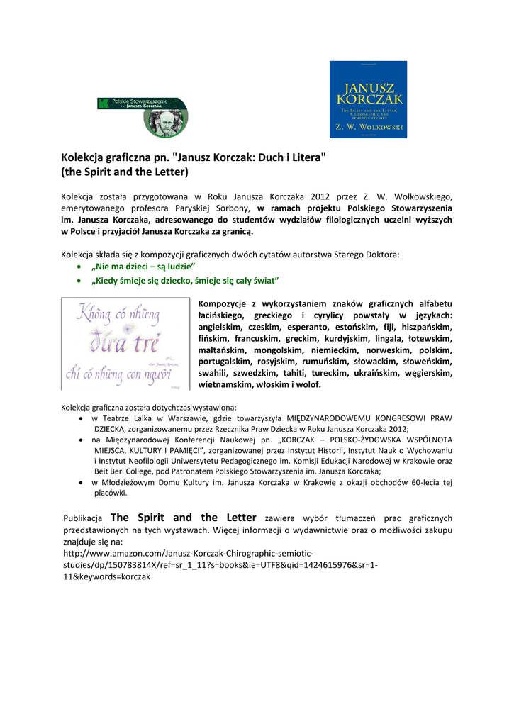 Kolekcja graficzna pn. "Janusz Korczak: Duch i Litera" (the Spirit and the Letter) Kolekcja została przygotowana w Roku Janusza Korczaka 2012 przez Z. W. Wolkowskiego, emerytowanego profesora Paryskiej Sorbony, w ramach projektu Polskiego Stowarzyszenia im. Janusza Korczaka, adresowanego do studentów wydziałów filologicznych uczelni wyższych w Polsce i przyjaciół Janusza Korczaka za granicą. Kolekcja składa się z kompozycji graficznych dwóch cytatów autorstwa Starego Doktora: „Nie ma dzieci – są ludzie” „Kiedy śmieje się dziecko, śmieje się cały świat” Kompozycje z wykorzystaniem znaków graficznych alfabetu łacińskiego, greckiego i cyrylicy powstały w językach: angielskim, czeskim, esperanto, estońskim, fiji, hiszpańskim, fińskim, francuskim, greckim, kurdyjskim, lingala, łotewskim, maltańskim, mongolskim, niemieckim, norweskim, polskim, portugalskim, rosyjskim, rumuńskim, słowackim, słoweńskim, swahili, szwedzkim, tahiti, tureckim, ukraińskim, węgierskim, wietnamskim, włoskim i wolof. Kolekcja graficzna została dotychczas wystawiona: w Teatrze Lalka w Warszawie, gdzie towarzyszyła MIĘDZYNARODOWEMU KONGRESOWI PRAW DZIECKA, zorganizowanemu przez Rzecznika Praw Dziecka w Roku Janusza Korczaka 2012; na Międzynarodowej Konferencji Naukowej pn. „KORCZAK – POLSKO-ŻYDOWSKA WSPÓLNOTA MIEJSCA, KULTURY I PAMIĘCI”, zorganizowanej przez Instytut Historii, Instytut Nauk o Wychowaniu i Instytut Neofilologii Uniwersytetu Pedagogicznego im. Komisji Edukacji Narodowej w Krakowie oraz Beit Berl College, pod Patronatem Polskiego Stowarzyszenia im. Janusza Korczaka; w Młodzieżowym Domu Kultury im. Janusza Korczaka w Krakowie z okazji obchodów 60-lecia tej placówki. Publikacja The Spirit and the Letter zawiera wybór tłumaczeń prac graficznych przedstawionych na tych wystawach. Więcej informacji o wydawnictwie oraz o możliwości zakupu znajduje się na: http://www.amazon.com/Janusz-Korczak-Chirographic-semioticstudies/dp/150783814X/ref=sr_1_11?s=books&ie=UTF8&qid=1424615976&sr=111&keywords=korczak Profesor Z.W. Wolkowski od dwudziestu lat zajmuje się tworzeniem kolekcji graficznych, które zostały wystawione w szesnastu krajach. Do kolekcji należy m. in. opracowanie graficzne w 23 językach europejskich cytatu autorstwa Marii Skłodowskiej-Curie. Grafiki zostały wystawione w 2011 roku na UMCS w Lublinie. Prezentacji towarzyszył odczyt wygłoszony przez prof. Williama Wolkowskiego pt. "Rodzina o 5 Nagrodach Nobla". William Wolkowski jest również autorem publikacji na temat literatury i grafiki wielojęzycznej, w tym Inwokacji Pana Tadeusza na 109 języków, Bogurodzicy na 70 języków.