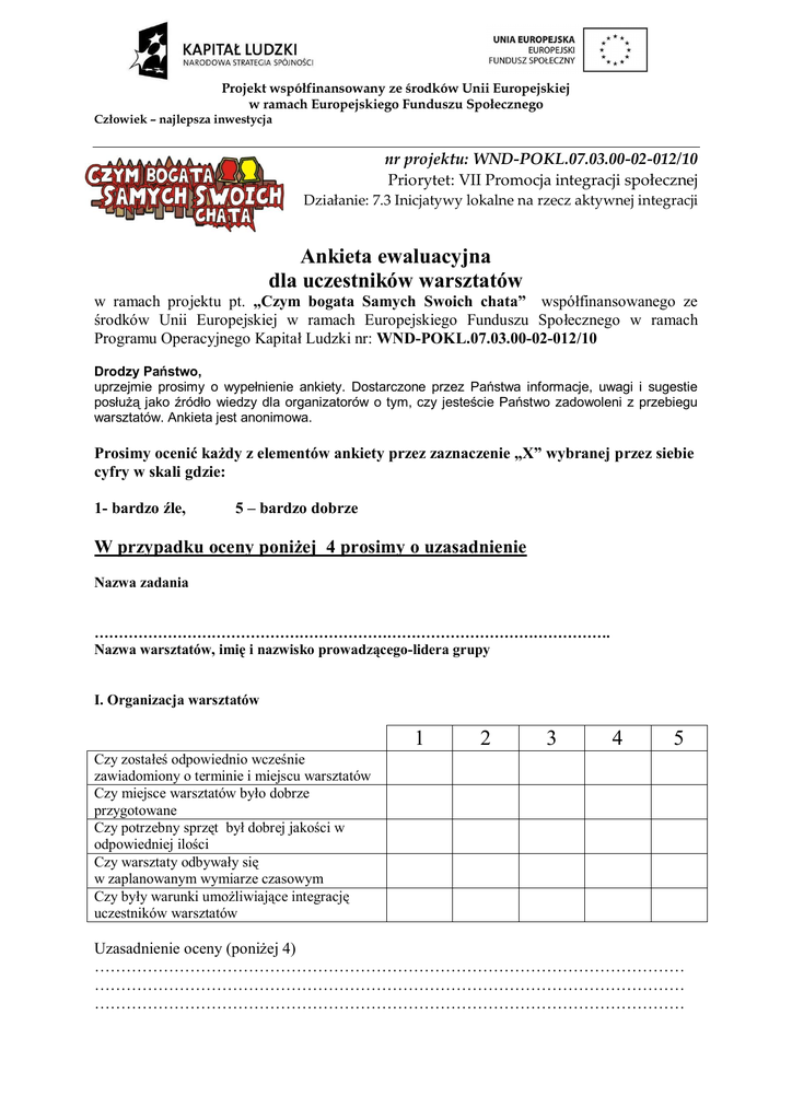 Projekt współfinansowany ze środków Unii Europejskiej w ramach Europejskiego Funduszu Społecznego Człowiek – najlepsza inwestycja nr projektu: WND-POKL.07.03.00-02-012/10 Priorytet: VII Promocja integracji społecznej Działanie: 7.3 Inicjatywy lokalne na rzecz aktywnej integracji Ankieta ewaluacyjna dla uczestników warsztatów w ramach projektu pt. „Czym bogata Samych Swoich chata” współfinansowanego ze środków Unii Europejskiej w ramach Europejskiego Funduszu Społecznego w ramach Programu Operacyjnego Kapitał Ludzki nr: WND-POKL.07.03.00-02-012/10 Drodzy Państwo, uprzejmie prosimy o wypełnienie ankiety. Dostarczone przez Państwa informacje, uwagi i sugestie posłużą jako źródło wiedzy dla organizatorów o tym, czy jesteście Państwo zadowoleni z przebiegu warsztatów. Ankieta jest anonimowa. Prosimy ocenić każdy z elementów ankiety przez zaznaczenie „X” wybranej przez siebie cyfry w skali gdzie: 1- bardzo źle, 5 – bardzo dobrze W przypadku oceny poniżej 4 prosimy o uzasadnienie Nazwa zadania ……………………………………………………………………………………………. Nazwa warsztatów, imię i nazwisko prowadzącego-lidera grupy I. Organizacja warsztatów 1 2 3 4 5 Czy zostałeś odpowiednio wcześnie zawiadomiony o terminie i miejscu warsztatów Czy miejsce warsztatów było dobrze przygotowane Czy potrzebny sprzęt był dobrej jakości w odpowiedniej ilości Czy warsztaty odbywały się w zaplanowanym wymiarze czasowym Czy były warunki umożliwiające integrację uczestników warsztatów Uzasadnienie oceny (poniżej 4) ………………………………………………………………………………………………… ………………………………………………………………………………………………… ………………………………………………………………………………………………… Projekt współfinansowany ze środków Unii Europejskiej w ramach Europejskiego Funduszu Społecznego Człowiek – najlepsza inwestycja II. Lider grupy 1 2 3 4 5 Czy treść warsztatów odpowiadała jego tematowi (nazwie) Czy lider był dobrze przygotowany merytorycznie do prowadzenia warsztatów Czy treść była przekazywana w zrozumiały i przystępny sposób Czy warsztaty zawierały zadania/ prace zespołowe umożliwiające przećwiczenie zdobytej wiedzy Czy lider był dobrze nastawiony do uczestników, odpowiadał na pytania, udzielał dodatkowych wyjaśnień Czy podczas warsztatów panowała dobra atmosfera sprzyjająca komunikacji i współpracy Uzasadnienie oceny (poniżej 4) ………………………………………………………………………………………………… ………………………………………………………………………………………………… ………………………………………………………………………………………………… ………………………………………………………………………………………………… III. Przydatność szkoleń 1 2 3 4 5 Czy warsztaty spełniły Twoje oczekiwania Czy warsztaty poszerzyły Twoje umiejętności Czy nabyte umiejętności będą przydatne w działaniach na rzecz rozwoju własnej wsi Czy po warsztatach masz nowe pomysły, które chciałbyś zastosować w przyszłości Czy poleciłbyś te warsztaty innym Uzasadnienie oceny (poniżej 4) ………………………………………………………………………………………………… ………………………………………………………………………………………………… ………………………………………………………………………………………………… Projekt współfinansowany ze środków Unii Europejskiej w ramach Europejskiego Funduszu Społecznego Człowiek – najlepsza inwestycja IV. Ocena ogólna 1 2 3 4 5 Czy ogólnie rzecz biorąc jesteś zadowolony z warsztatów Uzasadnienie oceny (poniżej 4) ………………………………………………………………………………………………… ………………………………………………………………………………………………… ………………………………………………………………………………………………… ………………………………………………………………………………………………… Podczas warsztatów: a) Najbardziej podobało mi się ......................................................................................... .............................................................................................................................................. b) Przede wszystkim zabrakło mi............................................................................................. ……………………………………………………………………………………………. Sugestie, uwagi wobec warsztatów z tej tematyki ………………………………………………………………………………………………. ………………………………………………………………………………………………. ………………………………………………………………………………………………. ……………………………………………………………………………………………….