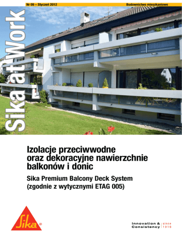 Budownictwo mieszkaniowe Sika at Work Nr 09 – Styczeń 2012 Izolacje przeciwwodne oraz dekoracyjne nawierzchnie balkonów i donic Sika Premium Balcony Deck System (zgodnie z wytycznymi ETAG 005) Osiedle mieszkaniowe w Martinsried, Niemcy Opis projektu Rozwiązania Sika Osiedle mieszkaniowe w Martinsried koło Monachium składa się z dziewięciu apartamentów z dużymi balkonami o powierzchni około 12 m² każdy. Ich fronty wyposażone są w zintegrowane donice. Balkony położone są po wschodniej, południowej i zachodniej stronie kompleksu mieszkalnego, tak aby uzyskać maksymalne nasłonecznienie. Uszkodzone podłoże usunięto, a całą powierzchnię mechanicznie przygotowano i oczyszczono. Powierzchnie donic zostały wyrównane warstwą modyfikowanej polimerami cementowej zaprawy wyrównawczej Icoment® 520 o grubości 2 mm. Następnie na balkonach i wewnątrz donic wykonano warstwę izolacyjną z materiału Sikafloor® -405 Premium - pozwala on na wykonanie izolacji bez spoin na różnych rodzajach podłoża. W kolejnym etapie na balkonach ułożono warstwę nawierzchniową z materiału Sika® Premium Deco, aby osiągnąć pożądany wygląd i efekt dekoracyjny. W miejscach, gdzie nawierzchnia powinna mieć właściwości antypoślizgowe, zastosowano powłokę Sikafloor® -416. Wymagania projektowe Pojawienie się przecieków i wykwitów na spodnich częściach balkonów i donic oznaczało, że dotychczasowa izolacja przeciwwodna przestała prawidłowo pełnić swoją funkcję. Ponadto stwierdzono ubytki i odspojenia nawierzchni balkonów. Do napraw zostały wybrane izolacje przeciwwodne nakładane w postaci płynnej jako najbardziej odpowiednie dla obu zastosowań, zarówno na balkonach jak i w donicach. W związku z tym, że rośliny sadzone są w plastikowych pojemnikach wstawianych do wnętrza donic, od materiału stosowanego do izolacji donic nie była wymagana odporność na przerastanie korzeni. Zastosowane nawierzchnie i izolacje musiały również zapewnić atrakcyjny wygląd balkonów. System Sika Premium Balcony Deck jest wodoodporny, ale przepuszczalny dla pary wodnej, dzięki czemu wilgoć może dyfundować z podłoża, nie powodując powstawania pęcherzy na powierzchni. Specjalnie zaprojektowana mata z włókna szklanego Sika® Reemat Premium - wzmacnia warstwę izolacyjną. Mata ta jest osadzana w materiale żywicznym, dzięki czemu warstwa izolacji przeciwwodnej przekrywa zarysowania i wykazuje bardzo wysoką wytrzymałość na rozciąganie we wszystkich kierunkach. Mata Sika ® Reemat Premium, w porównaniu ze zwykłymi tkaninami i wyrobami z włókna szklanego, wyróżnia się wyjątkowo łatwą instalacją. Dlatego pozwala wykonawcy zaoszczędzić czas, zwłaszcza przy izolowaniu detali takich jak rury spustowe, bariery, attyki, otwory wentylacyjne itp. Ponadto w systemie Sika Premium Balcony Deck dostępny jest także szeroki zakres dekoracyjnych, wysokiej jakości powłok nawierzchniowych, np. 3 mm warstwa z wypełnieniem z piasku kwarcowego, posypka z kolorowych grysów lub kolorowe powłoki antypoślizgowe Sikafloor. Uczestnicy projektu Specjalistyczny wykonawca: Fischbäck GmbH, 82538 Geretsried Główny wykonawca: Kögel Bauprojekt GmbH, 81541 München Zarządca nieruchomości: Jörg Klemmer GmbH, 80538 München 2. Bezspoinowa posadzka / ścianki Sika® Reemat Premium mata z włókna szklanego Mata Sika ® Reemat Premium jest osadzana w warstwie z żywicy Sikafloor ® -405 podczas jej nakładania za pomocą pędzla lub wałka. Druga warstwa żywicy jest układana najczęściej na następny dzień. Wykonanie izolacji przeciwwodnej jest ukończone. Konstrukcja izolacji i nawierzchni jest w sposób ciągły i bezspoinowo wywinięta na ściankę. 3. Bezspoinowa obróbka zewnętrznych odwodnień i wystających elementów 4. Spoiny robocze Konstrukcja izolacji i nawierzchni jest w sposób ciągły i bezspoinowo wykonywana wokół odwodnień i elementów wystających. Sika Poland Sp. z o.o. Karczunkowska 89 02-871 Warszawa tel +48 22 31 00 700 fax +48 22 31 00 800 www.sika.pl Do uszczelniania spoin roboczych stosowane są materiały Sika® Primer-3 N oraz Sikaflex® PRO 3-WF. Przed zastosowaniem materiałów należy zasięgnąć informacji dostępnych w aktualnych Kartach Informacyjnych. Ze względu na specyfike rynku, niektóre materiały mogą nie być dostępne w Polsce. © Sika Services AG / BU Distribution / 09.12 – January 2012 / CMS / gho 1. Nakładanie bezspoinowe