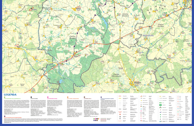 Droga główna MIĘDZYNARODOWY SZLAK NADMORSKI R10 SZLAK KU SŁOŃCU Cały szlak liczy obecnie ok. 7930 km, a docelowo ma mieć długość 8456 km. Trasa prowadzi przez Polskę, Niemcy, Danię, Szwecję, Finlandię, Rosję, Estonię Łotwę i Litwę. Na terenie naszego kraju przebiega województwa: zachodniopomorskie, pomorskie i warmińsko-mazurskie – łącznie ok. 1160 km. Na trasie warto zobaczyć pas wydm objętych ochroną krajobrazową ze względu na porastającą je roślinność oraz Park Zachodni ciągnący się od Grzybowa do ul. Wiosennej. W Kołobrzegu – pomniki przyrody w dzielnicy uzdrowiskowej: kasztan (ul. Spacerowa), aleja grabowa (ul. Towarowa), cedr i ostrokrzew kolczasty (ul. Norwida). Jadąc dalej w kierunku Ustronia, przejeżdżamy przez Ekopark. Biegnie przez malownicze, czyste ekologicznie tereny. W Kołobrzegu warto zobaczyć liczne pomniki przyrody. W Grzybowie torfowiska z Owczym Bagnem oraz porastające brzeg nadmorski rośliny w pasie chronionego krajobrazu. Dalej, wśród malowniczych łąk, można wypatrzeć sarny, zające, ptaki brodzące po mokradłach. To także teren lęgowy gadów. Warte uwagi są również miejsca wokół jeziora Borek. CZAS PRZEJAZDU ok. 2 h CZAS PRZEJAZDU ok. 4 h DŁUGOŚĆ SZLAKU 24,5 km ILOŚĆ PRZYSTANKÓW 7 MIEJSCOWOŚCI NA TRASIE Dźwirzyno > Grzybowo > Kołobrzeg > Podczele > > Bagicz > Sianożęty > Ustronie Morskie NAWIERZCHNIA asfalt, grunt, bruk SZLAK PO NASYPIE KOLEJKI WĄSKOTOROWEJ DŁUGOŚĆ SZLAKU 40 km LICZBA MIEJSCOWOŚCI NA TRASIE 9 Kołobrzeg > Grzybowo > Dźwirzyno > Głowaczewo > Karcino > Sarbia > Drzonowo> > Nowogardek > Nowy Borek > Stary Borek > > Grzybowo > Kołobrzeg NAWIERZCHNIA asfalt, grunt, beton SZLAK BOCIANICH GNIAZD Przebiega przez miejsca lęgowe bocianów. Na trasie watro zwrócić uwagę na powyginane sosny i dęby rosnące w pasie nadmorskim oraz stanowiący osobliwość przyrody bór bażynowy. W Karcinie, koło kościoła, rośnie 27 lip drobnolistnych oraz dąb szypułkowy. Drzewa wpisane są do rejestru pomników przyrody. SZLAK WOKÓŁ JEZIORA RESKO DŁUGOŚĆ SZLAKU 27,5 km Trasa rozpoczyna się w Kołobrzegu przy warzelni soli. Nieopodal znajduje się źródełko solankowe, które też warto zobaczyć. Wyjeżdżając z miasta, przed i za Grzybowem zwróćmy uwagę na torfowiska. Jadąc trasą wokół jeziora zobaczmy, jakie gatunki fauny i flory możemy tu spotkać. Jezioro Resko Przymorskie jest miejscem lęgowym wielu ptaków, na które natkniemy się jadąc tą trasą. MIEJSCOWOŚCI NA TRASIE CZAS PRZEJAZDU ok. 5,5 h CZAS PRZEJAZDU ok. 3,5 h ILOŚĆ PRZYSTANKÓW 9 Kołobrzeg > Grzybowo > Dźwirzyno > > Głowaczewo > Nowogardek > Drzonowo > > Sarbia > Karcino > Dźwirzyno > Grzybowo > > Kołobrzeg NAWIERZCHNIA asfalt, grunt, bruk Najdłuższa ścieżka rowerowa w Powiecie Kołobrzeskim, licząca 57 km, biegnie po nasypach kolejki wąskotorowej. Omija drogi główne i przebiega gminy: Gościno, Karlino, Kołobrzeg, Rymań oraz Siemyśl. Powstała przy współpracy ze Związkiem Miast i Gmin Dorzecza Parsęty. Prowadzi z Kołobrzegu do Karlina, przy czym w Gościnie (17,9 km) rozwidla się: na południe wiedzie do Dargocic (4,8 km); na południowy zachód – przez Rymań nad jezioro Popiel (23,4 km); na północ – przez Charzyno do drogi Kołobrzeg –Trzebiatów (10,8 km). Stamtąd wyznaczonym szlakiem dojedziemy do Grzybowa, a dalej, ścieżką wzdłuż morza, do Kołobrzegu. NAWIERZCHNIA asfalt DŁUGOŚĆ SZLAKU ok. 52 km ILOŚĆ PRZYSTANKÓW 7 MIEJSCOWOŚCI NA TRASIE Kołobrzeg > Korzystno > Stary Borek > Nowy Borek > Głowaczewo > Karcino > Bieczyno > > Gorzysław > Trzebusz > Mrzeżyno > Rogowo > > Dźwirzyno > Grzybowo > Kołobrzeg NAWIERZCHNIA asfalt, grunt, beton USTROŃSKA PĘTLA W Bagiczu jedziemy ścieżką rowerową wzdłuż obszaru, który do 1992 r. był wojskowym lotniskiem radzieckim. Po przejeździe przez drogę Kołobrzeg–Koszalin wjeżdżamy do Lasu Kołobrzeskiego. Właśnie tu rośnie najstarszy (ponad 800-letni) dąb w Polsce Bolesław oraz 2 km dalej, ok. 650-letni Warcisław. Jadąc w pasie nadmorskim, możemy na wydmach dostrzec mikołajka nadmorskiego, wyjątkowo rzadki gatunek rośliny objęty ochroną. DŁUGOŚĆ SZLAKU ok. 31 km CZAS PRZEJAZDU ok. 3,5 h MIEJSCOWOŚCI I PUNKTY NA TRASIE Ustronie Morskie > Sianożęty > Bagicz > > Dąb Bolesław > Dąb Warcisław > Malechowo > > Kukinia > Rusowo > Gwizd > Wieniatowo > > Ustronie Morskie NAWIERZCHNIA asfalt, bruk, beton, grunt SZLAK DO NAJSTARSZYCH DĘBÓW W POLSCE Prowadzi do najbardziej wiekowych drzew w kraju – liczącego ponad 800 lat Bolesława oraz ok. 650-letniego Warcisława. Jadąc w pasie nadmorskim, możemy na wydmach dostrzec mikołajka nadmorskiego, roślinę wyjątkowo rzadką i objętą ochroną. W Rusowie warto odwiedzić park podworski, w którym rosną ciekawe i stare drzewa. Jest oznakowany i wiedzie przez niego ścieżka edukacyjna. DŁUGOŚĆ SZLAKU ok. 31 km CZAS PRZEJAZDU ok. 3,5 h MIEJSCOWOŚCI I PUNKTY NA TRASIE Kołobrzeg > Stramniczka > Dąb Warcisław > > Dąb Bolesław > Bagicz > Podczele > Kołobrzeg NAWIERZCHNIA asfalt, bruk, beton, grunt Szlaki rowerowe Cycle way Fahrradweg Droga drugorzędna Droga lokalna Droga inna Droga gruntowa Droga leśna lub polna Przecinka Kolej ze stacją, przystankiem Odległość w km Numery dróg Sygnalizacja świetlna Fotoradary Rezerwaty przyrody Main road Hauptstrasse Szlaki konne Other roads Fahrweg Punkty widokowe Secondary road, local road Zweitrangigestrasse, Ortsverkehrstrasse Country road Dorfstrasse Cart road and forest road Feld-und Waldweg Glade Schneise Railway with station/stop Eisenbahn mit Bahnhof/Haltestelle Distances in kilometers Entfernungen in Kilometern Numbering roads Straßen-Nummern Road traffic signaling Straßenampeln Photoradar Fotoradar Landscape reserve Naturschutzgebiet Grodziska Elektrownie wodne Punkt wysokościowy Hotele, Agroturystyka Informacja turystyczna Jazda konna Zamki Dwory Pałace Leśniczówki Aptek