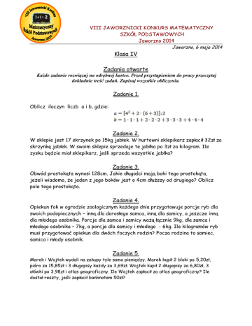 VIII JAWORZNICKI KONKURS MATEMATYCZNY SZKÓŁ PODSTAWOWYCH Jaworzno 2014 Jaworzno, 6 maja 2014 Klasa IV Zadania otwarte Każde zadanie rozwiązuj na odrębnej kartce. Przed przystąpieniem do pracy przeczytaj dokładnie treść zadań. Zapisuj wszystkie obliczenia. Zadanie 1. Oblicz iloczyn liczb a i b, gdzie: Zadanie 2. W sklepie jest 17 skrzynek po 15kg jabłek. W hurtowni sklepikarz zapłacił 32zł za skrzynkę jabłek. W swoim sklepie sprzedaje te jabłka po 3zł za kilogram. Ile zysku będzie miał sklepikarz, jeśli sprzeda wszystkie jabłka? Zadanie 3. Obwód prostokąta wynosi 128cm. Jakie długości mają boki tego prostokąta, jeżeli wiadomo, że jeden z jego boków jest o 4cm dłuższy od drugiego? Oblicz pole tego prostokąta. Zadanie 4. Opiekun fok w ogrodzie zoologicznym każdego dnia przygotowuje porcje ryb dla swoich podopiecznych – inną dla dorosłego samca, inną dla samicy, a jeszcze inną dla młodego osobnika. Porcje dla samca i samicy ważą łącznie 9kg, dla samca i młodego osobnika – 7kg, a porcje dla samicy i młodego - 6kg. Ile kilogramów ryb musi przygotować opiekun dla dwóch foczych rodzin? Focza rodzina to samiec, samica i młody osobnik. Zadanie 5. Marek i Wojtek wydali na zakupy tyle samo pieniędzy. Marek kupił 2 bloki po 5,20zł, pióro za 15,85zł i 3 długopisy każdy za 3,69zł. Wojtek kupił 2 długopisy za 6,80zł, 3 ołówki po 3,98zł i atlas geograficzny. Ile Wojtek zapłacił za atlas geograficzny? Ile dostał reszty, jeśli zapłacił banknotem 50zł? VIII JAWORZNICKI KONKURS MATEMATYCZNY SZKÓŁ PODSTAWOWYCH Jaworzno 2014 Test wyboru 1. Która z podanych liczb jest parzysta? A. 2009 B. 2+0+0+9 C. 200 – 9 D. E. 200+9 2. Sto mnożone przez trzy tysiące trzysta trzynaście jest równe: A. 3 331 B. 33 130 C. 331 300 3. Jaki ułamek można dodać do sumy liczb A. i B. D. 333 300 E. 131 300 , aby otrzymać 2 ? C. D. E. 4. Ile wynosi obwód narysowanej figury? 4cm A. 12cm 8cm B. 24cm C. C.16cm D. 20cm E. 32cm 5. 360 000 sekund to: A. 3 godziny B. 10 godzin C. 6 godzin D. 8,5 godzin E. więcej niż 90 godzin 6. Po jednej stronie ulicy Długiej stoją domy ponumerowane kolejnymi liczbami nieparzystymi od 1 do 39, a po drugiej stronie domy ponumerowane kolejnymi liczbami parzystymi od 2 do 34. Ile domów jest przy ulicy Długiej? A. 37 B. 38 C. 28 D. 36 E. 73 7. Dziadek ustawił w południe na swoim starym zegarku dokładny czas. Zegarek ten spóźnia się 20 sekund w ciągu godziny. Po upływie doby spóźnienie wynosić będzie: A. 7 minut B. 8 minut C. 9 minut 8. Jaką cyfrę należy wstawić w okienko, żeby suma D. 10 minut E. 11 minut + 4 była podzielna przez 2 i przez 5. A. 0 B. 6 C. 8 D. 5 E. 4 9. Ile słupków należy zakupić, aby ogrodzić prostokątny plac o długości 120m i szerokości 48m, jeśli słupki ustawimy co 3m? A. 56 B. 1920 C. 112 D. 80 E. 40 10. Janek ustawił swoich żołnierzyków w 9 rzędach po 8 w każdym. Ilu żołnierzyków będzie stało w rzędzie, jeśli ustawi ich w 6 rzędach? A. 12 B. 10 C. 14 D. 16 E. 18