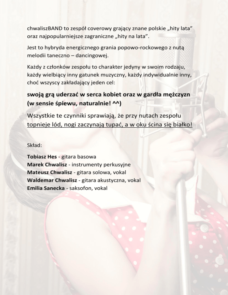 chwaliszBAND to zespół coverowy grający znane polskie „hity lata” oraz najpopularniejsze zagraniczne „hity na lata”. Jest to hybryda energicznego grania popowo-rockowego z nutą melodii taneczno – dancingowej. Każdy z członków zespołu to charakter jedyny w swoim rodzaju, każdy wielbiący inny gatunek muzyczny, każdy indywidualnie inny, chod wszyscy zakładający jeden cel: swoją grą uderzad w serca kobiet oraz w gardła mężczyzn (w sensie śpiewu, naturalnie! ^^) Wszystkie te czynniki sprawiają, że przy nutach zespołu topnieje lód, nogi zaczynają tupad, a w oku ścina się białko! Skład: Tobiasz Hes - gitara basowa Marek Chwalisz - instrumenty perkusyjne Mateusz Chwalisz - gitara solowa, vokal Waldemar Chwalisz - gitara akustyczna, vokal Emilia Sanecka - saksofon, vokal