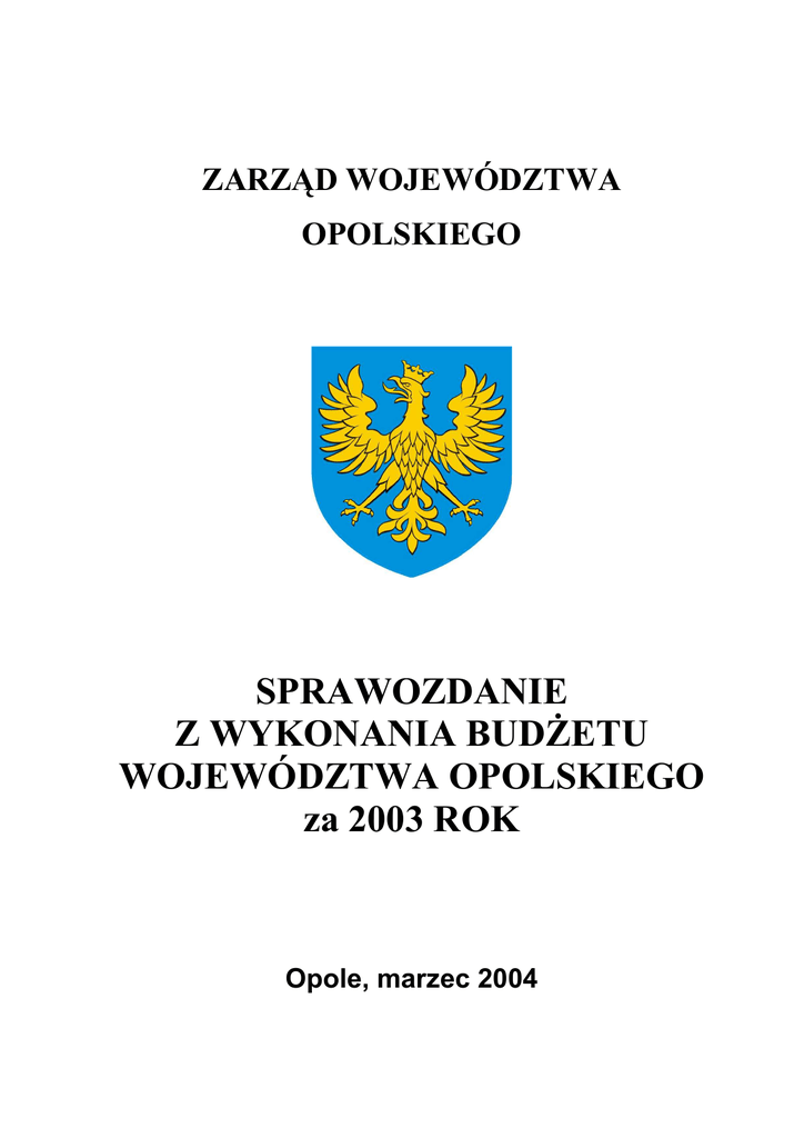 ZARZĄD WOJEWÓDZTWA OPOLSKIEGO SPRAWOZDANIE Z WYKONANIA BUDŻETU WOJEWÓDZTWA OPOLSKIEGO za 2003 ROK Opole, marzec 2004 CZĘŚĆ OPISOWA SPRAWOZDANIA Z WYKONANIA BUDŻETU WOJEWÓDZTWA OPOLSKIEGO ZA 2003 ROK 2 2 MARZEC 2004 I. ZMIANY W PLANIE BUDŻETU WOJEWÓDZTWA OPOLSKIEGO NA 2003 ROK Na sesji Sejmiku Województwa Opolskiego uchwałą nr III/20/2002 z 30 grudnia 2002 r. został uchwalony budżet województwa na 2003 rok. Uchwalono budżet zawierający plan dochodów na poziomie 93 013 478 zł i plan wydatków na poziomie 104 716 789 zł. Deficyt budżetowy w wysokości 11 703 311 zł zaplanowano do sfinansowania kredytem długoterminowym, z tym, że w związku ze spłatami rat kapitałowych kredytów zaciągniętych w latach poprzednich do sfinansowania wydatków nie mających pokrycia w dochodach budżetu zaplanowano zaciągnięcie kredytu w wysokości 13 408 077 zł. DOCHODY Plan dochodów budżetowych w trakcie 2003 roku zwiększony został o kwotę 33 792 064 zł, tj. o 36,3% i na dzień 31 grudnia wynosił 126 805 542 zł. W tym plan dochodów na zadania z zakresu administracji rządowej zwiększył się o kwotę 10 785 488 zł, tj. o 61,7% i na dzień 31 grudnia wynosił 28 263 488 zł, plan dochodów na zadania własne wzrósł o kwotę 21 912 741 zł tj. o 29,0% i na dzień 31 grudnia wynosił 97 441 219 zł, plan dochodów realizowanych na podstawie porozumień z jednostkami samorządu terytorialnego wzrósł o 923 835 zł i na dzień 31 grudnia wynosił 930 835 zł, plan dochodów realizowanych na podstawie porozumień z organami administracji rządowej wzrósł o 170 000 zł i na dzień 31 grudnia wynosił 170 000 zł. Powyższe zmiany zostały przeprowadzone następującymi uchwałami: 1. Sejmiku Województwa Opolskiego nr IV/33/2003 z dnia 25.02.2003 r. zwiększono plan dochodów o kwotę 658 006 zł, w tym: a\ zwiększono plan dochodów z tytułu subwencji ogólnej z budżetu państwa o kwotę 1 083 531 zł w tym: - drogowa część subwencji ogólnej o kwotę 1 025 765 zł - oświatowa część subwencji ogólnej o kwotę 57 766 zł b\ zwiększono plan dochodów z tytułu dotacji otrzymanych z funduszy celowych na realizację zadań bieżących j.s.t. o kwotę 20 000 zł c\ zmniejszono plan dochodów z tytułu podatku dochodowego od osób fizycznych o kwotę 332 072 zł d\ zmniejszono plan dochodów z tytułu wyrównawczej części subwencji ogólnej o kwotę 113 453 zł 2.Sejmiku Województwa Opolskiego nr V/48/2003 z dnia 27 marca 2003 r. zwiększono plan dochodów o kwotę 50 000 zł, w tym: - wpływy z różnych dochodów o kwotę 50 000 zł 3 3 3. Sejmiku Województwa Opolskiego nr IX/62/2003 z dnia 24 czerwca 2003 r. zwiększono plan dochodów o kwotę 1 375 000 zł, w tym: a/ zwiększono plan dochodów z tytułu subwencji ogólnej z budżetu państwa o kwotę 1 000 000 zł w tym: - drogowa część subwencji ogólnej o kwotę 1 000 000 zł b/ zwiększono plan dochodów z tytułu wpływów z różnych opłat o kwotę 250 000 zł c/ zwiększono plan dochodów z tytułu dotacji otrzymanych z funduszy celowych na realizację zadań bieżących jednostek sektora finansów publicznych o kwotę 125 000 zł 4. Sejmiku Województwa Opolskiego nr X/92/2003 z dnia 29 lipca 2003 r. zwiększono plan dochodów o kwotę 1 088 991 zł, w tym: a/ plan dochodów z tytułu subwencji ogólnej z budżetu państwa o kwotę 1 057 109 zł w tym: - oświatowa część subwencji ogólnej o kwotę 1 057 109 zł b/ plan dochodów z tytułu wpływów z usług o kwotę 29 353 zł c/ plan dochodów z tytułu wpływów z różnych dochodów o kwotę 2 529 zł 5. Sejmiku Województwa Opolskiego nr XII/114/2003 z dnia 23 września 2003 r. zwiększono plan dochodów o kwotę 333 073 zł, w tym: a/ zwiększono plan dochodów z tytułu wpływów z usług o kwotę 64 397 zł b/ zwiększono plan dochodów z tytułu pozostałych odsetek o kwotę 20 587 zł c/ zwiększono plan dochodów z tytułu wpływów z różnych dochodów o kwotę 3 089 zł d/ zwiększono plan dochodów z tytułu dotacji otrzymanych z funduszy celowych na realizację zadań bieżących jednostek sektora finansów publicznych o kwotę 80 000 zł e/ zwiększono plan dochodów z tytułu wpływów z opłat na zezwolenia na sprzedaż alkoholu o kwotę 165 000 zł 6. Sejmiku Województwa Opolskiego nr XIV/123/2003 z dnia 18 listopada 2003 r. zwiększono plan dochodów o kwotę 6 200 zł, w tym: a/ zwiększono plan dochodów z tytułu wpływów ze sprzedaży wyrobów i składników majątkowych o kwotę 6 200 zł 7. Sejmiku Województwa Opolskiego nr XV/133/2003 z dnia 22 grudnia 2003 r. zmniejszono plan dochodów o kwotę 569 480 zł, w tym: a/ zmniejszono plan dochodów z tytułu wpływów z usług o kwotę 5 000 zł b/ zmniejszono plan dochodów z tytułu pozostałych odsetek o kwotę 87 900 zł c/ zmniejszono plan dochodów z tytułu odpłatnego nabycia prawa własności nieruchomości o kwotę 100 000 zł d/ zmniejszono plan dochodów z tytułu podatku dochodowego od osób fizycznych o kwotę e/ zwiększono plan dochodów z tytułu najmu i dzierżawy składników majątkowych o kwotę f/ zwiększono plan dochodów z tytułu wpływów z różnych dochodów o kwotę 4 760 000 zł 15 936 zł 142 000 zł 4 g/ zwiększono plan dochodów z tytułu wpływów ze sprzedaży wyrobów i składników majątkowych o kwotę 200 zł h/ zwiększono plan dochodów z tytułu wpływów z różnych opłat o kwotę 14 900 zł i/ zwiększono plan dochodów z tytułu podatku dochodowego od osób prawnych o kwotę 104 864 zł j/ zwiększono plan dochodów z tytułu subwencji ogólnej z budżetu państwa o kwotę 25 520 zł w tym: oświatowa część subwencji ogólnej o kwotę 25 520 zł k/ zwiększono plan dochodów z tytułu środków na dofinansowanie własnych zadań bieżących gmin (związków gmin), powiatów (związków powiatów), samorządów województw, pozyskane z innych źródeł o kwotę 80 000 zł 8. Zarządu Województwa Opolskiego nr 139/2