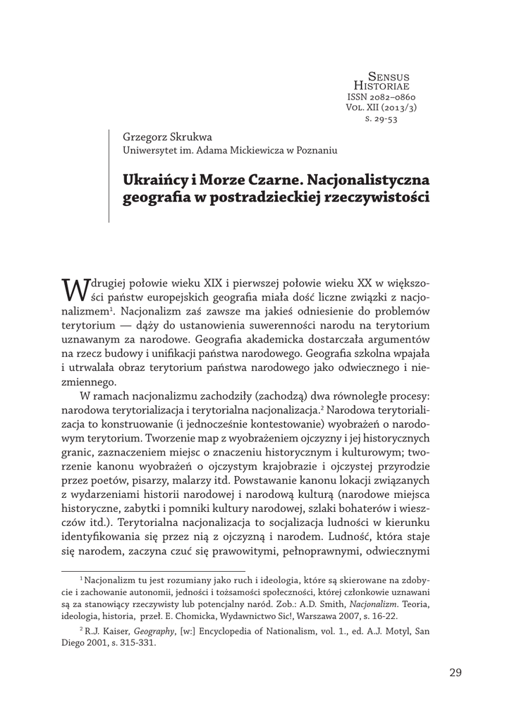 SENSUS HISTORIAE ISSN 2082–0860 Vol. XII (2013/3) s. 29-53 Grzegorz Skrukwa Uniwersytet im. Adama Mickiewicza w Poznaniu Ukraińcy i Morze Czarne. Nacjonalistyczna geografia w postradzieckiej rzeczywistości W drugiej połowie wieku XIX i pierwszej połowie wieku XX w większości państw europejskich geografia miała dość liczne związki z nacjonalizmem1. Nacjonalizm zaś zawsze ma jakieś odniesienie do problemów terytorium — dąży do ustanowienia suwerenności narodu na terytorium uznawanym za narodowe. Geografia akademicka dostarczała argumentów na rzecz budowy i unifikacji państwa narodowego. Geografia szkolna wpajała i utrwalała obraz terytorium państwa narodowego jako odwiecznego i niezmiennego. W ramach nacjonalizmu zachodziły (zachodzą) dwa równoległe procesy: narodowa terytorializacja i terytorialna nacjonalizacja.2 Narodowa terytorializacja to konstruowanie (i jednocześnie kontestowanie) wyobrażeń o narodowym terytorium. Tworzenie map z wyobrażeniem ojczyzny i jej historycznych granic, zaznaczeniem miejsc o znaczeniu historycznym i kulturowym; tworzenie kanonu wyobrażeń o ojczystym krajobrazie i ojczystej przyrodzie przez poetów, pisarzy, malarzy itd. Powstawanie kanonu lokacji związanych z wydarzeniami historii narodowej i narodową kulturą (narodowe miejsca historyczne, zabytki i pomniki kultury narodowej, szlaki bohaterów i wieszczów itd.). Terytorialna nacjonalizacja to socjalizacja ludności w kierunku identyfikowania się przez nią z ojczyzną i narodem. Ludność, która staje się narodem, zaczyna czuć się prawowitymi, pełnoprawnymi, odwiecznymi 1 Nacjonalizm tu jest rozumiany jako ruch i ideologia, które są skierowane na zdobycie i zachowanie autonomii, jedności i tożsamości społeczności, której członkowie uznawani są za stanowiący rzeczywisty lub potencjalny naród. Zob.: A.D. Smith, Nacjonalizm. Teoria, ideologia, historia, przeł. E. Chomicka, Wydawnictwo Sic!, Warszawa 2007, s. 16-22. 2 R.J. Kaiser, Geography, [w:] Encyclopedia of Nationalism, vol. 1., ed. A.J. Motyl, San Diego 2001, s. 315-331. 29 Grzegorz Skrukwa gospodarzami danego terytorium, zaczyna identyfikować jego granice oraz identyfikować obcych. Nacjonalistyczna geografia XIX–XX w. była zdominowana przez paradygmat determinizmu środowiskowego. Polegał on na przekonaniu, że geografia fizyczna regionu (kraju) określa charakterystykę w nim ludzi mieszkających, i to nie tylko ich zachowania socjoekonomiczne, ale także ich charakterystykę etnokulturową i psychologiczną oraz nastawienie polityczne.3 Źródłosłowem ‘terytorium’ jest łac. terra — ziemia, ale oczywiście w rozważaniach dotyczących przestrzennych aspektów nacjonalizmu należy też uwzględnić obszary planety Ziemia pokryte wodą — morza i oceany. W języku rosyjskim i ukraińskim istnieje zresztą termin ‘akwatorium’ (akwatorija). Nacjonaliści mają tendencję do traktowania postulowanych lub osiągniętych granic swego państwa narodowego jako organicznych lub naturalnych. Granica morska jest zwykle postrzegana jako najlepsza granica naturalna. Historia nacjonalizmów i konfliktów polityczno-etnicznych w Europie Środkowej i Wschodniej w XX w. daje wiele przykładów konfliktów o regiony nadmorskie i wybrzeże morskie, wymienić można chociażby konflikty polsko-niemieckie o Gdańsk i całe Pomorze, litewsko-niemieckie o Kraj Kłajpedzki, jugosłowiańsko-włoskie o Dalmację i Istrię, bułgarsko-rumuńskie o Dobrudżę, bułgarsko-greckie o Trację Wschodnią itd. Już z tego względu warto zainteresować się poglądami twórców idei ukraińskiego ruchu narodowego na granicę morską czyli granicę Ukrainy na Morzu Czarnym i tym samym konfliktami ukraińsko-rosyjskimi w tym regionie. Narody są produktami procesów modernizacyjnych. Ruchy nacjonalistyczne, zwłaszcza w swej XX-wiecznej fazie, zwykle choć oczywiście nie zawsze, mają program modernizacji społecznej i ekonomicznej. W ramach nowoczesnego narodu funkcjonuje pionowa integracja ekonomiczna i podział pracy. W Europie Środkowej i Wschodniej wybrzeża, a zwłaszcza miasta portowe miały często (wręcz w większości) inne oblicze etnokulturowe od ich lądowego zaplecza, albo oblicze mieszane — były pograniczem. Grupa dominująca w sferze ekonomicznej, kulturowej a i politycznej różniła się etnicznie od grupy większościowej.4 Klasa wyższa i średnia (właściciele stoczni, armatorzy, wielcy kupcy, oficerowie marynarki) należeli do grupy dominującej, np. Niemcy w miastach bałtyckich czy Włosi w adriatyckich. Ruchy narodowe np. słoweński, chorwacki, polski, litewski, łotewski czy estoński krytykowały 3 4 Ibidem, s. 315, 318. J. Chlebowczyk, O prawie do bytu małych i młodych narodów. Kwestia narodowa i procesy narodowotwórcze we wschodniej Europie Środkowej w dobie kapitalizmu (od schyłku XVIII do początków XX w.), PWN, Warszawa — Kraków 1983, s. 33. 30 Ukraińcy i Morze Czarne. Nacjonalistyczna geografia... ten stan rzeczy jako przejaw niesprawiedliwości i ucisku, i postulowały jego zmianę. Zwracały też uwagę fakt, że owe miasta portowe są nierozerwalnie ekonomicznie i społecznie związane ze swym lądowym zapleczem, Hinterlandem, zamieszkałym przez „małe”, „młode”. „niehistoryczne” narody5. Ruchy te miały więc charakter emancypacyjny jednocześnie narodowo i społecznie. Ostatecznym choć nie zawsze wprost wyartykułowanym celem tych ruchów było pozbawienie grupy dotąd dominującej jej dominującej pozycji i wytworzenie własnej klasy średniej i wyższej w sektorze morskim. Ponadto, postulat zdobycia dostępu do morza, rozciągnięcia narodowej suwerenności na wybrzeże i terytorialnej nacjonalizacji miast portowych miał znaczenie nie tylko lokalne, ale ogólnonarodowe. Dostęp do morza, posiadanie „okna na świat”, stworzenie własnego sektora morskiego, miało zapewnić udział w światowej gospodarce oraz modernizację i rozwój c