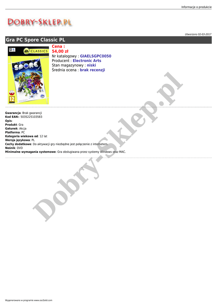 Informacje o produkcie Utworzono 02-03-2017 Gra PC Spore Classic PL Cena : 54,00 zł p. pl Nr katalogowy : GIAELSGPC0050 Producent : Electronic Arts Stan magazynowy : niski Średnia ocena : brak recenzji D ob ry - Sk le Gwarancja: Brak gwarancji Kod EAN:: 5035225103583 Opis: Produkt: Gra Gatunek: Akcja Platforma: PC Kategoria wiekowa od: 12 lat Wersja językowa: PL Cechy dodatkowe: Do aktywacji gry niezbędne jest połączenie z internetem. Nośnik: DVD Minimalne wymagania systemowe: Gra obsługiwana przez systemy Windows oraz MAC. Wygenerowano w programie www.oscGold.com