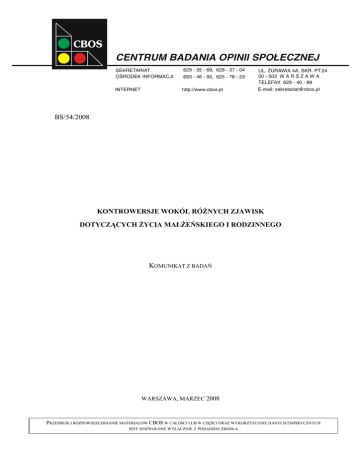 CENTRUM BADANIA OPINII SPOŁECZNEJ SEKRETARIAT OŚRODEK INFORMACJI 629 - 35 - 69, 628 - 37 - 04 693 - 46 - 92, 625 - 76 - 23 INTERNET http://www.cbos.pl UL. ŻURAWIA 4A, SKR. PT.24 00 - 503 W A R S Z A W A TELEFAX 629 - 40 - 89 E-mail: [email protected] BS/54/2008 KONTROWERSJE WOKÓŁ RÓŻNYCH ZJAWISK DOTYCZĄCYCH ŻYCIA MAŁŻEŃSKIEGO I RODZINNEGO KOMUNIKAT Z BADAŃ WARSZAWA, MARZEC 2008 PRZEDRUK I ROZPOWSZECHNIANIE MATERIAŁÓW CBOS W CAŁOŚCI LUB W CZĘŚCI ORAZ WYKORZYSTANIE DANYCH EMPIRYCZNYCH JEST DOZWOLONE WYŁĄCZNIE Z PODANIEM ŹRÓDŁA KONTROWERSJE WOKÓŁ RÓŻNYCH ZJAWISK DOTYCZĄCYCH ŻYCIA MAŁŻEŃSKIEGO I RODZINNEGO ¾ W porównaniu z sytuacją z 1996 roku opinie społeczne na temat prawdopodobnych przyczyn odkładania przez młodych ludzi decyzji o małżeństwie uległy istotnym zmianom. Już nie trudności materialne czy problemy mieszkaniowe, jak dwanaście lat temu, stanowią – zdaniem Polaków – podstawowy powód przedłużającego się panieństwa czy kawalerstwa, lecz raczej czynniki psychologiczne oraz prowadzony tryb życia, związany chociażby ze sferą zawodową. ¾ W opiniach na temat związków kohabitacyjnych Polacy są dość mocno podzieleni. Stosunkowo największą grupę (41%) stanowią respondenci, którzy za wskazane, choć nieobligatoryjne, uznają zawarcie małżeństwa przez osoby żyjące ze sobą bez ślubu. ¾ Jedna trzecia badanych (33%) wychodzi z założenia, że najważniejszy jest ślub kościelny, który niesie ze sobą skutki prawne, czyli tzw. konkordatowy. Jednak niemal tyle samo ankietowanych (32%) uważa, że tak naprawdę rodzaj ślubu jest bez znaczenia, a decyzja o nim powinna należeć wyłącznie do osób, które się pobierają. ¾ Polacy w zdecydowanej większości (67%) uważają, że życie singli nie jest ciekawsze niż tych, którzy tworzą trwałe związki. Życie w pojedynkę popiera niespełna jedna czwarta badanych (23%). ¾ Spośród różnych zachowań przedstawionych respondentom bezwzględnemu potępieniu podlega bicie dzieci. Najbardziej podzielone są opinie na temat rozwodów i życia w związku bez ślubu, a znacznie więcej zwolenników niż przeciwników mają takie zachowania, jak: stosowanie środków antykoncepcyjnych oraz współżycie przedmałżeńskie. Badanie „Aktualne problemy i wydarzenia” (213), 1–4 lutego 2008 roku, reprezentatywna próba losowa dorosłych mieszkańców Polski (N=1137). Rodzina w Polsce, podobnie jak w innych krajach, podlega istotnym przemianom. Opóźnia się wiek zawierania małżeństw, wzrasta liczba rozwodów i separacji, ludzie częściej decydują się na życie w pojedynkę, coraz większą popularnością cieszą się alternatywne formy życia małżeńskiego – tzw. związki kohabitacyjne, stosunkowo częstym zjawiskiem są rodziny niepełne oraz samotni rodzice wychowujący dzieci. W związku z powyższymi trendami zmieniają się również sposoby myślenia o małżeństwie i rodzinie. Liberalizacji podlegają opinie dotyczące różnych zjawisk i zachowań związanych zarówno z życiem małżeńskim, jak i rodzinnym. W jednym z naszych ostatnich badań1 zapytaliśmy Polaków o ich stosunek m.in. do takich kwestii, jak: odkładanie decyzji o małżeństwie, pozostawanie w związku nieformalnym czy też życie w pojedynkę2. BARIERY UTRUDNIAJĄCE ZAŁOŻENIE RODZINY Z danych Głównego Urzędu Statystycznego3 wynika, że – po tendencji spadkowej – od 2003 roku obserwuje się ponowny wzrost liczby nowo zawartych małżeństw, co z pewnością w istotnym stopniu jest spowodowane wstąpieniem w wiek prokreacyjny osób z tzw. wyżu demograficznego przełomu lat siedemdziesiątych i osiemdziesiątych. Nie zmienia się natomiast trend związany z opóźnianiem decyzji o małżeństwie i wzrostem wieku nowożeńców. Jak podaje GUS, na początku lat dziewięćdziesiątych ponad połowa mężczyzn zawierających małżeństwo nie osiągała wieku 25 lat, a w roku 2006 – już tylko jedna czwarta (27%). Wśród kobiet liczba ta zmalała o jedną trzecią (z 73% do 48%). 1 Badanie „Aktualne problemy i wydarzenia” (213) zrealizowano w dniach 1–4 lutego 2008 roku na liczącej 1137 osób reprezentatywnej próbie losowej dorosłych mieszkańców Polski. 2 Stosunek do rozwodów przedstawiliśmy w odrębnym komunikacie. Zob. komunikat CBOS „Stosunek Polaków do rozwodów”, marzec 2008. 3 www.stat.gov.pl -2Przyczyn spadku gotowości do zawierania małżeństw w przypadku kobiet respondenci upatrują obecnie przede wszystkim w obawie przed nieudanym małżeństwem. Opinię taką wyraża blisko połowa ankietowanych (48%). Mniej więcej dwie piąte badanych uważa, że kobiety nie chcą zakładać rodziny z uwagi na fakt, że może to stanowić przeszkodę w ich karierze zawodowej (40%), jak również z tego względu, że nie mają odpowiednich warunków mieszkaniowych (39%). Ponad jedna trzecia respondentów wymienia w tym względzie trudności ze znalezieniem odpowiedniego kandydata na męża (36%), a także dążenie współczesnych kobiet do życia bez zobowiązań (36%) oraz ich obawę przed pogorszeniem własnej sytuacji materialnej w związku z założeniem rodziny (35%). Zdecydowanie rzadziej do głównych przyczyn odkładania przez panie decyzji o małżeństwie lub rezygnacji przez nie z tej formy życia ankietowani zaliczają obawę przed obowiązkami rodzicielskimi (16%), brak chęci posiadania dzieci (10%) oraz inne względy. CBOS RYS. 1. OBECNIE W POLSCE CZĘŚĆ MŁODYCH LUDZI, KTÓRZY SĄ W WIEKU ODPOWIEDNIM DO ZAŁOŻENIA RODZINY, NIE WSTĘPUJE W ZWIĄZEK MAŁŻEŃSKI. JAK PAN(I) SĄDZI, DLACZEGO KOBIETY NIE WYCHODZĄ ZA MĄŻ, MĘŻCZYŹNI SIĘ NIE ŻENIĄ? 36% Wybierają tzw. wolność, a więc życie bez zobowiązań Nie mogą znaleźć odpowiedniego kandydata na męża/odpowiedniej kandydatki na żonę 27% 36% 10% 9% Nie chcą mieć dzieci Obawiają się nieudanego małżeństwa 48% 27% 16% Obawiają się obowiązków rodzicielskich Obaw