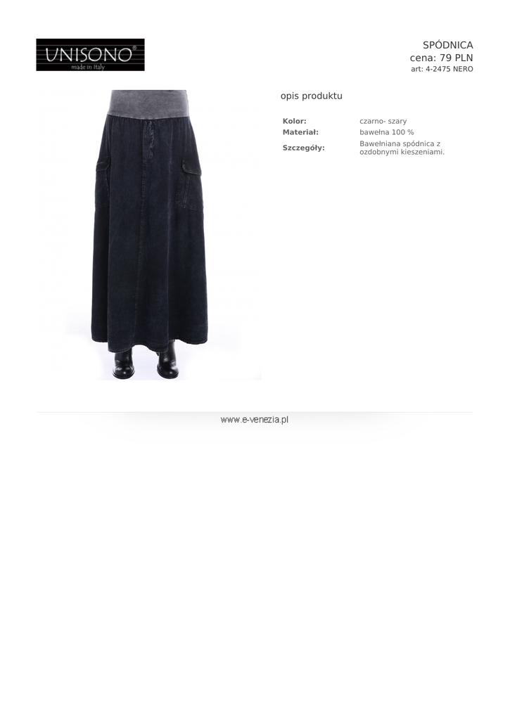 SPÓDNICA cena: 79 PLN art: 4-2475 NERO opis produktu Kolor: czarno- szary Materiał: bawełna 100 % Szczegóły: Bawełniana spódnica z ozdobnymi kieszeniami.