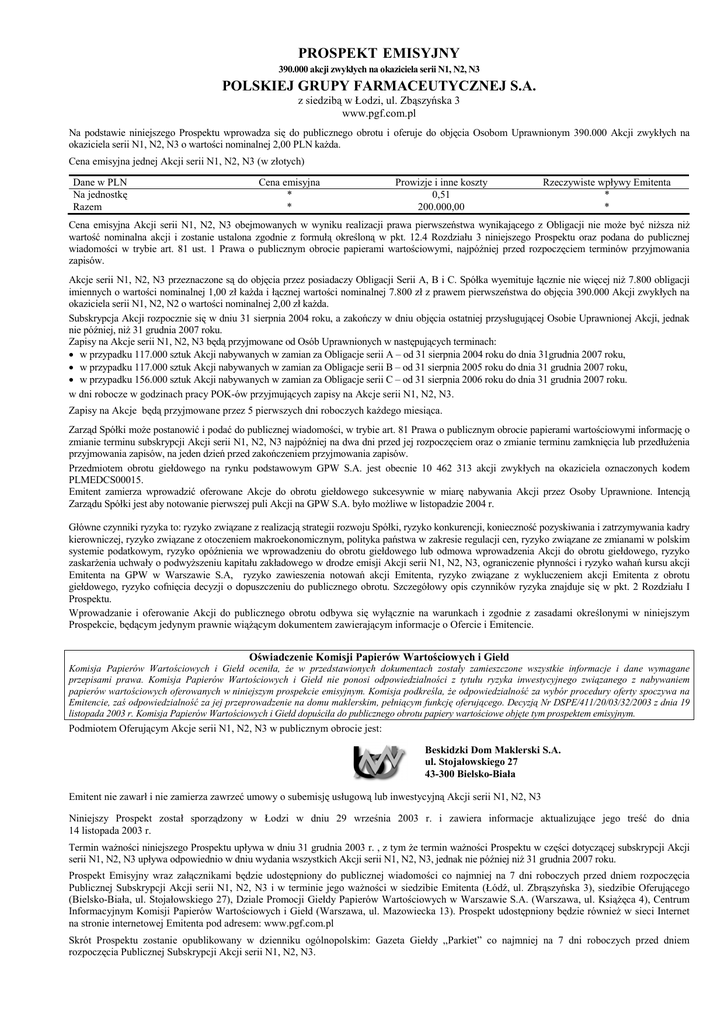 PROSPEKT EMISYJNY 390.000 akcji zwykłych na okaziciela serii N1, N2, N3 POLSKIEJ GRUPY FARMACEUTYCZNEJ S.A. z siedzibą w Łodzi, ul. Zbąszyńska 3 www.pgf.com.pl Na podstawie niniejszego Prospektu wprowadza się do publicznego obrotu i oferuje do objęcia Osobom Uprawnionym 390.000 Akcji zwykłych na okaziciela serii N1, N2, N3 o wartości nominalnej 2,00 PLN każda. Cena emisyjna jednej Akcji serii N1, N2, N3 (w złotych) Dane w PLN Na jednostkę Razem Cena emisyjna * * Prowizje i inne koszty 0,51 200.000,00 Rzeczywiste wpływy Emitenta * * Cena emisyjna Akcji serii N1, N2, N3 obejmowanych w wyniku realizacji prawa pierwszeństwa wynikającego z Obligacji nie może być niższa niż wartość nominalna akcji i zostanie ustalona zgodnie z formułą określoną w pkt. 12.4 Rozdziału 3 niniejszego Prospektu oraz podana do publicznej wiadomości w trybie art. 81 ust. 1 Prawa o publicznym obrocie papierami wartościowymi, najpóźniej przed rozpoczęciem terminów przyjmowania zapisów. Akcje serii N1, N2, N3 przeznaczone są do objęcia przez posiadaczy Obligacji Serii A, B i C. Spółka wyemituje łącznie nie więcej niż 7.800 obligacji imiennych o wartości nominalnej 1,00 zł każda i łącznej wartości nominalnej 7.800 zł z prawem pierwszeństwa do objęcia 390.000 Akcji zwykłych na okaziciela serii N1, N2, N2 o wartości nominalnej 2,00 zł każda. Subskrypcja Akcji rozpocznie się w dniu 31 sierpnia 2004 roku, a zakończy w dniu objęcia ostatniej przysługującej Osobie Uprawnionej Akcji, jednak nie później, niż 31 grudnia 2007 roku. Zapisy na Akcje serii N1, N2, N3 będą przyjmowane od Osób Uprawnionych w następujących terminach: • w przypadku 117.000 sztuk Akcji nabywanych w zamian za Obligacje serii A – od 31 sierpnia 2004 roku do dnia 31grudnia 2007 roku, • w przypadku 117.000 sztuk Akcji nabywanych w zamian za Obligacje serii B – od 31 sierpnia 2005 roku do dnia 31 grudnia 2007 roku, • w przypadku 156.000 sztuk Akcji nabywanych w zamian za Obligacje serii C – od 31 sierpnia 2006 roku do dnia 31 grudnia 2007 roku. w dni robocze w godzinach pracy POK-ów przyjmujących zapisy na Akcje serii N1, N2, N3. Zapisy na Akcje będą przyjmowane przez 5 pierwszych dni roboczych każdego miesiąca. Zarząd Spółki może postanowić i podać do publicznej wiadomości, w trybie art. 81 Prawa o publicznym obrocie papierami wartościowymi informację o zmianie terminu subskrypcji Akcji serii N1, N2, N3 najpóźniej na dwa dni przed jej rozpoczęciem oraz o zmianie terminu zamknięcia lub przedłużenia przyjmowania zapisów, na jeden dzień przed zakończeniem przyjmowania zapisów. Przedmiotem obrotu giełdowego na rynku podstawowym GPW S.A. jest obecnie 10 462 313 akcji zwykłych na okaziciela oznaczonych kodem PLMEDCS00015. Emitent zamierza wprowadzić oferowane Akcje do obrotu giełdowego sukcesywnie w miarę nabywania Akcji przez Osoby Uprawnione. Intencją Zarządu Spółki jest aby notowanie pierwszej puli Akcji na GPW S.A. było możliwe w listopadzie 2004 r. Główne czynniki ryzyka to: ryzyko związane z realizacją strategii rozwoju Spółki, ryzyko konkurencji, konieczność pozyskiwania i zatrzymywania kadry kierowniczej, ryzyko związane z otoczeniem makroekonomicznym, polityka państwa w zakresie regulacji cen, ryzyko związane ze zmianami w polskim systemie podatkowym, ryzyko opóźnienia we wprowadzeniu do obrotu giełdowego lub odmowa wprowadzenia Akcji do obrotu giełdowego, ryzyko zaskarżenia uchwały o podwyższeniu kapitału zakładowego w drodze emisji Akcji serii N1, N2, N3, ograniczenie płynności i ryzyko wahań kursu akcji Emitenta na GPW w Warszawie S.A, ryzyko zawieszenia notowań akcji Emitenta, ryzyko związane z wykluczeniem akcji Emitenta z obrotu giełdowego, ryzyko cofnięcia decyzji o dopuszczeniu do publicznego obrotu. Szczegółowy opis czynników ryzyka znajduje się w pkt. 2 Rozdziału I Prospektu. Wprowadzanie i oferowanie Akcji do publicznego obrotu odbywa się wyłącznie na warunkach i zgodnie z zasadami określonymi w niniejszym Prospekcie, będącym jedynym prawnie wiążącym dokumentem zawierającym informacje o Ofercie i Emitencie. Oświadczenie Komisji Papierów Wartościowych i Giełd Komisja Papierów Wartościowych i Giełd oceniła, że w przedstawionych dokumentach zostały zamieszczone wszystkie informacje i dane wymagane przepisami prawa. Komisja Papierów Wartościowych i Giełd nie ponosi odpowiedzialności z tytułu ryzyka inwestycyjnego związanego z nabywaniem papierów wartościowych oferowanych w niniejszym prospekcie emisyjnym. Komisja podkreśla, że odpowiedzialność za wybór procedury oferty spoczywa na Emitencie, zaś odpowiedzialność za jej przeprowadzenie na domu maklerskim, pełniącym funkcję oferującego. Decyzją Nr DSPE/411/20/03/32/2003 z dnia 19 listopada 2003 r. Komisja Papierów Wartościowych i Giełd dopuściła do publicznego obrotu papiery wartościowe objęte tym prospektem emisyjnym. Podmiotem Oferującym Akcje serii N1, N2, N3 w publicznym obrocie jest: Beskidzki Dom Maklerski S.A. ul. Stojałowskiego 27 43-300 Bielsko-Biała Emitent nie zawarł i nie zamierza zawrzeć umowy o subemisję usługową lub inwestycyjną Akcji serii N1, N2, N3 Niniejszy Prospekt został sporządzony w Łodzi w dniu 29 września 2003 r. i zawiera informacje aktualizujące jego treść do dnia 14 listopada 2003 r. Termin ważności niniejszego Prospektu upływa w dniu 31 grudnia 2003 r. , z tym że termin ważności Prospektu w części dotyczącej subskrypcji Akcji serii N1, N2, N3 upływa odpowiednio w dniu wydania wszystkich Akcji serii N1, N2, N3, jednak nie później niż 31 grudnia 2007 roku. Prospekt Emisyjny wraz załącznikami będzie udostępniony do publicznej wiadomości co najmniej na 7 dni roboczych przed dniem rozpoczęcia Publicznej Subskrypcji Akcji serii N1, N2, N3 i w terminie jego ważności w siedzibie Emitenta (Łódź, ul. Zbrąszyńska 3), siedzibie Oferującego (Bielsko-Bi