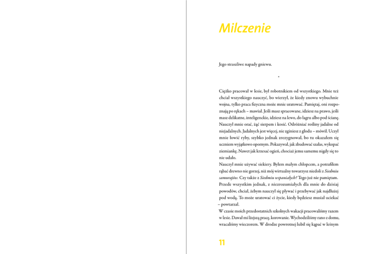 Milczenie Jego straszliwe napady gniewu. * Ciężko pracował w lesie, był robotnikiem od wszystkiego. Mnie też chciał wszystkiego nauczyć, bo wierzył, że kiedy znowu wybuchnie wojna, tylko praca fizyczna może mnie uratować. Pamiętaj, oni rozpoznają po rękach – mawiał. Jeśli masz spracowane, idziesz na prawo, jeśli masz delikatne, inteligenckie, idziesz na lewo, do łagru albo pod ścianę. Nauczył mnie orać, żąć sierpem i kosić. Odróżniać rośliny jadalne od niejadalnych. Jadalnych jest więcej, nie zginiesz z głodu – mówił. Uczył mnie łowić ryby, szybko jednak zrezygnował, bo tu okazałem się uczniem wyjątkowo opornym. Pokazywał, jak zbudować szałas, wykopać ziemiankę. Nawet jak krzesać ogień, chociaż jemu samemu nigdy się to nie udało. Nauczył mnie używać siekiery. Byłem małym chłopcem, a potrafiłem rąbać drewno nie gorzej, niż mój wirtualny towarzysz niedoli z Siedmiu samurajów. Czy także z Siedmiu wspaniałych? Tego już nie pamiętam. Przede wszystkim jednak, z niezrozumiałych dla mnie do dzisiaj powodów, chciał, żebym nauczył się pływać i przebywać jak najdłużej pod wodą. To może uratować ci życie, kiedy będziesz musiał uciekać – powtarzał. W czasie moich przedostatnich szkolnych wakacji pracowaliśmy razem w lesie. Dawał mi lżejszą pracę, korowanie. Wychodziliśmy rano z domu, wracaliśmy wieczorem. W drodze powrotnej lubił się kąpać w leśnym 11 jeziorze. Któregoś wieczoru wskoczył jak zwykle na głowę do wody i długo nie wypływał. Myślałem, że przepłynął już do drugiego brzegu i czeka tam na mnie. Obszedłem jezioro dookoła, ani śladu. Jego rzeczy w tym czasie także zniknęły. Obszedłem drugi raz, trzeci, nadaremnie. Nie wiedziałem, co robić. Przerażony, pomyliłem w ciemnościach drogę. Długo błądziłem, zanim trafiłem do domu. Był tam już, jak gdyby nic. Sam. Mama poszła mnie szukać po nocy. Milczał. Też milczałem. Bałem się cokolwiek powiedzieć. Tak już zostało. Niewiele się nauczyłem. Zginąłbym na bezludziu. Zginąłbym w ucieczce. * Wezwany telegramem, pojechałem prosto z dworca do szpitala. Leżał pod namiotem tlenowym. Nie spodziewał się mnie, patrzył na mnie nieobecnym spojrzeniem. Wreszcie poznał. Płakał. Jego prawe płuco, odjęte przed kilkoma dniami, wędrowało już po swoich niepewnych, kalekich zaświatach. Twarz Nie dawała mi spokoju przez całe dzieciństwo, spędzone w poniemieckim domu moich rodziców z królującym niebieskim napisem Sich regen bringt Segen na kafelkach nad piecem kuchennym, którego nawet mój cudem odnaleziony ojciec nie potrafił mi przetłumaczyć. Twarz. Groteskowo (jeszcze długo nie nauczę się tego słowa) wykrzywiona twarz ze słojów drzewnych w lewym górnym rogu drzwi między pokojem, gdzie wtedy spałem, a kuchnią. Naturalnie, że nie przez całe dzieciństwo. Zauważyłem ją tego dnia, kiedy ojciec po kilku godzinach pieszej wędrówki wrócił z najbliższego miasta ze strasznym bólem głowy i moja biedna mama próbowała na progu odczyniać uroki, jakie ktoś (jakaś baba, mówiła, bo przecież nie wilk, nie pies, nie żmija, nie żaba ani żaden ptak) musiał rzucić na niego. Najpierw do garnka z zimną wodą wrzucała rozżarzone węgielki i ledwo zdołała je zaprzecznie policzyć: nie jeden, nie dwa – i tak aż do dziewięciu, już zdążyły zatonąć, co nie wróżyło niczego dobrego. Od tego czasu twarz uporczywie świdrowała mnie wzrokiem, wodziła za mną oczami. Chowałem się przed nią w najdalszym kącie i godzinami wyglądałem przez okno. Raz ucieleśniła się jako twarz obcego mężczyzny, który nie wiadomo skąd pojawił się przede mną i długo coś perorował w swoim zawiłym drewnianodrzewnym języku, z którego po ocknięciu niczego nie potrafiłem sobie przypomnieć, żadnego dźwięku czy słowa. Bałem się krzyku. Jeszcze bardziej bałem się śmiechu. Nie umiałem nikomu się zwierzyć. Jak tylko skończyłem szkołę, wyjechałem do miasta. 13