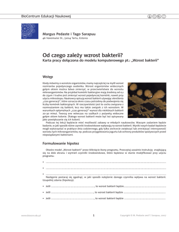 1246 BioCentrum Edukacji Naukowej Margus Pedaste i Tago Sarapuu 46 Vanemuise St., 51014 Tartu, Estonia Od czego zależy wzrost bakterii? Karta pracy dołączona do modelu komputerowego pt.: „Wzrost bakterii” Wstęp Kiedy mówimy o wzroście organizmów, mamy najczęściej na myśli wzrost rozmiarów pojedynczego osobnika. Wzrost organizmów widocznych gołym okiem można łatwo zmierzyć, w przeciwieństwie do wzrostu mikroorganizmów. Na przykład komórki bakteryjne mają średnicę od 0,1 do 25µm i trudno jest zmierzyć wzrost pojedynczej komórki, nawet przy użyciu mikroskopu. Naukowcy opisują wzrost bakterii używając określenia „czas generacji”, które oznacza okres czasu potrzebny do podwojenia się liczby komórek bakteryjnych. W rzeczywistości jest to cecha związana z rozmnażaniem się bakterii, lecz ma także związek z ich wzrostem. W warunkach optymalnych „czas generacji” wynosi dla niektórych bakterii 20-30 minut. Tworzą one wówczas na szalkach z pożywką widoczne gołym okiem kolonie. Dlatego wzrost bakterii może być też opisywany jako powiększanie się ich kolonii. Podczas tej lekcji będziecie mieć możliwość zabawy w młodych naukowców. Waszym zadaniem będzie badanie, w jaki sposób różne czynniki środowiskowe wpływają na wzrost bakterii. Wyniki swych badań będziecie mogli wykorzystać w praktyce dnia codziennego, gdy tylko zechcecie zwiększyć lub zmniejszyć intensywność wzrostu tych mikroorganizmów, np. podczas przygotowania jogurtu lub ochrony produktów spożywczych przed niepożądanymi bakteriami. Formułowanie hipotez Otwórz model „Wzrost bakterii” przez kliknięcie ikony programu. Przeczytaj uważnie instrukcję znajdującą się na dole ekranu i wymień czynniki środowiskowe, które będziesz w stanie modyfikować przy użyciu programu: • …………………………………………………….................................……………….........................................................................……………… • …………………………..............................…………………………………….........................................................................……………………… • ..............................…………………………………………………………….........................................................................………………………… Następnie postaraj się zgadnąć, w jaki sposób natężenie danego czynnika wpływa na wzrost bakterii. Uzupełnij zdania (hipotezy). • Jeśli ………………………………………………………………, to wzrost bakterii będzie…............................…………………………………. • Jeśli ……………………………..………........................…, to wzrost bakterii będzie ...................................................................…. • Jeśli .................................…………………………………, to wzrost bakterii będzie ……................................................................ www.biocen.edu.pl Copyright © M. Pedaste and T. Sarapuu, 2007 BioCentrum Edukacji Naukowej Planowanie badań Przeprowadź trzy eksperymenty weryfikujące Twoje hipotezy. Opisz, w jaki sposób planujesz doświadczenia i wymień wyposażenie niezbędne do przeprowadzenia ich w prawdziwym laboratorium. • W celu weryfikacji pierwszej hipotezy planuję …………………………............. ................................................................................................................................... Niezbędne wyposażenie do przeprowadzenia tego doświadczenia to ................................................................................................................................... • W celu weryfikacji drugiej hipotezy planuję …………………………................. ................................................................................................................................... Niezbędne wyposażenie do przeprowadzenia tego doświadczenia to ................................................................................................................................... • W celu weryfikacji trzeciej hipotezy planuję …………………………................ ................................................................................................................................... Niezbędne wyposażenie do przeprowadzenia tego doświadczenia to ................................................................................................................................... Badanie 1. Wpływ temperatury na wzrost bakterii. Wykorzystaj symulację „Wzrost baterii” i wypełnij poniższą tabelę. Temperatura °C Wilgotność % Antybiotyk obecny / brak 10 60 brak 25 60 brak 50 60 brak Czas podwojenia liczby bakterii (w godzinach) pierwszy drugi trzeci Średni czas generacji (w godzinach) Na podstawie otrzymanych wyników narysuj wykres i odpowiedz na poniższe pytania. • W jakich warunkach wzrost bakterii był najbardziej intensywny? ........................…………………………………………………………………………………………... • W jakich warunkach wzrost bakterii był najwolniejszy? ........................…………………………………………………………………………………………... • Jaki wpływ ma temperatura na wzrost bakterii? Napisz ogólny wniosek. ………………………………………………………………………………………...……………………… .................................................……………………………………………………………………... www.biocen.edu.pl Copyright © M. Pedaste and T. Sarapuu, 2007 Od czego zależy wzrost bakterii? Średni czas generacji (w godzinach) 10 8 6 4