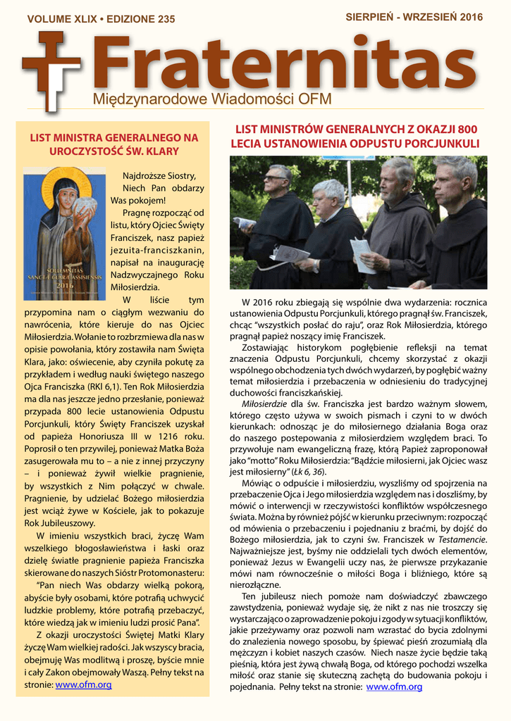 SIERPIEŃ - WRZESIEŃ 2016 VOLUME XLIX • EDIZIONE 235 Fraternitas Międzynarodowe Wiadomości OFM LIST MINISTRA GENERALNEGO NA UROCZYSTOŚĆ ŚW. KLARY Najdroższe Siostry, Niech Pan obdarzy Was pokojem! Pragnę rozpocząć od listu, który Ojciec Święty Franciszek, nasz papież jezuita-franciszkanin, napisał na inaugurację Nadzwyczajnego Roku Miłosierdzia. W liście tym przypomina nam o ciągłym wezwaniu do nawrócenia, które kieruje do nas Ojciec Miłosierdzia. Wołanie to rozbrzmiewa dla nas w opisie powołania, który zostawiła nam Święta Klara, jako: oświecenie, aby czyniła pokutę za przykładem i według nauki świętego naszego Ojca Franciszka (RKl 6,1). Ten Rok Miłosierdzia ma dla nas jeszcze jedno przesłanie, ponieważ przypada 800 lecie ustanowienia Odpustu Porcjunkuli, który Święty Franciszek uzyskał od papieża Honoriusza III w 1216 roku. Poprosił o ten przywilej, ponieważ Matka Boża zasugerowała mu to – a nie z innej przyczyny – i ponieważ żywił wielkie pragnienie, by wszystkich z Nim połączyć w chwale. Pragnienie, by udzielać Bożego miłosierdzia jest wciąż żywe w Kościele, jak to pokazuje Rok Jubileuszowy. W imieniu wszystkich braci, życzę Wam wszelkiego błogosławieństwa i łaski oraz dzielę światłe pragnienie papieża Franciszka skierowane do naszych Sióstr Protomonasteru: “Pan niech Was obdarzy wielką pokorą, abyście były osobami, które potrafią uchwycić ludzkie problemy, które potrafią przebaczyć, które wiedzą jak w imieniu ludzi prosić Pana”. Z okazji uroczystości Świętej Matki Klary życzę Wam wielkiej radości. Jak wszyscy bracia, obejmuję Was modlitwą i proszę, byście mnie i cały Zakon obejmowały Waszą. Pełny tekst na stronie: www.ofm.org LIST MINISTRÓW GENERALNYCH Z OKAZJI 800 LECIA USTANOWIENIA ODPUSTU PORCJUNKULI W 2016 roku zbiegają się wspólnie dwa wydarzenia: rocznica ustanowienia Odpustu Porcjunkuli, którego pragnął św. Franciszek, chcąc “wszystkich posłać do raju”, oraz Rok Miłosierdzia, którego pragnął papież noszący imię Franciszek. Zostawiając historykom pogłębienie refleksji na temat znaczenia Odpustu Porcjunkuli, chcemy skorzystać z okazji wspólnego obchodzenia tych dwóch wydarzeń, by pogłębić ważny temat miłosierdzia i przebaczenia w odniesieniu do tradycyjnej duchowości franciszkańskiej. Miłosierdzie dla św. Franciszka jest bardzo ważnym słowem, którego często używa w swoich pismach i czyni to w dwóch kierunkach: odnosząc je do miłosiernego działania Boga oraz do naszego postepowania z miłosierdziem względem braci. To przywołuje nam ewangeliczną frazę, którą Papież zaproponował jako “motto” Roku Miłosierdzia: “Bądźcie miłosierni, jak Ojciec wasz jest miłosierny” (Łk 6, 36). Mówiąc o odpuście i miłosierdziu, wyszliśmy od spojrzenia na przebaczenie Ojca i Jego miłosierdzia względem nas i doszliśmy, by mówić o interwencji w rzeczywistości konfliktów współczesnego świata. Można by również pójść w kierunku przeciwnym: rozpocząć od mówienia o przebaczeniu i pojednaniu z braćmi, by dojść do Bożego miłosierdzia, jak to czyni św. Franciszek w Testamencie. Najważniejsze jest, byśmy nie oddzielali tych dwóch elementów, ponieważ Jezus w Ewangelii uczy nas, że pierwsze przykazanie mówi nam równocześnie o miłości Boga i bliźniego, które są nierozłączne. Ten jubileusz niech pomoże nam doświadczyć zbawczego zawstydzenia, ponieważ wydaje się, że nikt z nas nie troszczy się wystarczająco o zaprowadzenie pokoju i zgody w sytuacji konfliktów, jakie przeżywamy oraz pozwoli nam wzrastać do bycia zdolnymi do znalezienia nowego sposobu, by śpiewać pieśń zrozumiałą dla mężczyzn i kobiet naszych czasów. Niech nasze życie będzie taką pieśnią, która jest żywą chwałą Boga, od którego pochodzi wszelka miłość oraz stanie się skuteczną zachętą do budowania pokoju i pojednania. Pełny tekst na stronie: www.ofm.org INNE WIADOMOŚCI 1 czerwca 2016 roku - papież Franciszek mianował biskupem prałatem Prałatury Terytorialnej Marajo (Brazylia) Fr. Evaristo Pascoal Spengler OFM, aktualnego wikariusza Prowincji Niepokalanego Poczęcia NMP w Brazylii z siedzibą w São Paulo. F R A T E R N I T A S 24 czerwca 2016 roku - papież Franciszek przyjął rezygnację z zarządzania Łacińskim Patriarchatem Jerozolimy, jaką złożył Fouad Twal, zgodnie z kan. 401 §1 KPK oraz mianował administratorem apostolskim sede vacante Fr. Pierbattista Pizzaballa OFM, wynosząc go do godności arcybiskupiej oraz przydzielając mu siedzibę biskupa tytularnego Verbe. W maju 2004 roku definitorium generalne wybrało go Kustoszem Ziemi Świętej oraz gwardianem Góry Syjon. 22 marca 2010 roku został ponownie wybrany na to stanowisko. W 2013 roku został wybrany przez postulację na kolejne trzechlecie. Jego mandat zakończył się w kwietniu 2016 roku. Zmarł tato Fr. Philippe Shillings 17 czerwca w Dinant (Belgia) w wieku 96 lat zmarł Léon Schillings, ojciec Fr. Philippe Shillingsa. Fr. Phillipe odprawił pogrzeb swojego ojca 21 czerwca. 2 Redakcja Fraternitas składa naszemu współbratu wyrazy głębokiego współczucia, dziękując za posługę tłumacza na język francuski już od 1983 roku. Ponadto w latach 2003-2013 mieszkał w kurii generalnej, a obecnie w nowej swojej siedzibie na Lateranie, nadal każdego miesiąca dokonuje tłumaczeń Fraternitas i wielu innych dokumentów Zakonu. Rzym, Kuria generalna – młodzi bracia przygotowujący się do złożenia profesji wieczystej do 14 lipca 2016 roku, uczestniczyli w spotkaniu kurii generalnej, w celu weryfikacji obecności Zakonu na tych terenach, poszukując jednocześnie nowych form oraz planując kroki na przyszłość. Korzystając z okazji Roku Miłosierdzia, podczas spotkania zorganizowana została pielgrzymka do Asyżu, by móc uzyskać łaskę odpustu. W pielgrzymce towarzyszyli im: sekretarz generalny ds. mi