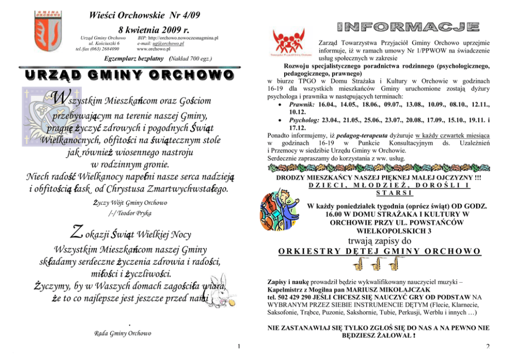 Wieści Orchowskie Nr 4/09 8 kwietnia 2009 r. Urząd Gminy Orchowo ul. Kościuszki 6 tel./fax (063) 2684090 BIP: http://orchowo.nowoczesnagmina.pl e-mail: [email protected] www.orchowo.pl Zarząd Towarzystwa Przyjaciół Gminy Orchowo uprzejmie informuje, iż w ramach umowy Nr 1/PPWOW na świadczenie usług społecznych w zakresie Rozwoju specjalistycznego poradnictwa rodzinnego (psychologicznego, pedagogicznego, prawnego) w biurze TPGO w Domu Strażaka i Kultury w Orchowie w godzinach 16-19 dla wszystkich mieszkańców Gminy uruchomione zostają dyżury psychologa i prawnika w następujących terminach: • Prawnik: 16.04., 14.05., 18.06., 09.07., 13.08., 10.09., 08.10., 12.11., 10.12. • Psycholog: 23.04., 21.05., 25.06., 23.07., 20.08., 17.09., 15.10., 19.11. i 17.12. Ponadto informujemy, iż pedagog-terapeuta dyżuruje w każdy czwartek miesiąca w godzinach 16-19 w Punkcie Konsultacyjnym ds. Uzależnień i Przemocy w siedzibie Urzędu Gminy w Orchowie. Serdecznie zapraszamy do korzystania z ww. usług. Egzemplarz bezpłatny (Nakład 700 egz.) Wszystkim Mieszkańcom oraz Gościom przebywającym na terenie naszej Gminy, pragnę życzyć zdrowych i pogodnych Świąt Wielkanocnych, obfitości na świątecznym stole jak również wiosennego nastroju w rodzinnym gronie. Niech radość Wielkanocy napełni nasze serca nadzieją i obfitością łask od Chrystusa Zmartwychwstałego. DRODZY MIESZKAŃCY NASZEJ PIĘKNEJ MAŁEJ OJCZYZNY !!! DZIECI, MŁODZIEŻ, DOROŚLI I STARSI Życzy Wójt Gminy Orchowo /-/ Teodor Pryka W każdy poniedziałek tygodnia (oprócz świąt) OD GODZ. 16.00 W DOMU STRAŻAKA I KULTURY W ORCHOWIE PRZY UL. POWSTAŃCÓW WIELKOPOLSKICH 3 Z okazji Świąt Wielkiej Nocy trwają zapisy do Wszystkim Mieszkańcom naszej Gminy składamy serdeczne życzenia zdrowia i radości, miłości i życzliwości. Życzymy, by w Waszych domach zagościła wiara, że to co najlepsze jest jeszcze przed nami ORKIESTRY DĘTEJ GMINY ORCHOWO Zapisy i naukę prowadził będzie wykwalifikowany nauczyciel muzyki – Kapelmistrz z Mogilna pan MARIUSZ MIKOŁAJCZAK tel. 502 429 290 JEŚLI CHCESZ SIĘ NAUCZYĆ GRY OD PODSTAW NA WYBRANYM PRZEZ SIEBIE INSTRUMENCIE DĘTYM (Flecie, Klarnecie, Saksofonie, Trąbce, Puzonie, Sakshornie, Tubie, Perkusji, Werblu i innych …) . NIE ZASTANAWIAJ SIĘ TYLKO ZGŁOŚ SIĘ DO NAS A NA PEWNO NIE BĘDZIESZ ŻAŁOWAŁ ! Rada Gminy Orchowo 1 2 OBWIESZCZENIE o wyłożeniu do publicznego wglądu projektu miejscowego planu zagospodarowania przestrzennego dla działki oznaczonej nr ewid. 8/6, położonej w miejscowości Osówiec, działki oznaczonej nr ewid. 63, położonej w miejscowości Różanna, części działki oznaczonej nr ewid. 23, położonej w miejscowości Wólka Orchowska, Na podstawie art. 17 pkt 10 ustawy z dnia 27 marca 2003r. o planowaniu i zagospodarowaniu przestrzennym (Dz. U. z 2003r. Nr 80, poz. 717 z późn. zm.) oraz uchwały Rady Gminy Orchowo nr XXXIX/237/06 z dnia 21 lipca 2006r. zawiadamiam o wyłożeniu do publicznego wglądu projektu miejscowego planu zagospodarowania przestrzennego wybranych terenów Gminy Orchowo, obejmującego: - działkę nr ewid. 8/6, położoną w miejscowości Osówiec, - działkę nr ewid. 63, położoną w miejscowości Różanna, - część działki nr ewid. 23, położoną w miejscowości Wólka Orchowska, wraz z prognozą oddziaływania na środowisko, w dniach od 22.04.2009r. do 22.05.2009r. w siedzibie Urzędu Gminy Orchowo ul. Kościuszki 6 pokój nr 15 w godz. od 7.30 do 15.30 Dyskusja publiczna nad przyjętymi w projekcie planu miejscowego rozwiązaniami odbędzie się w dniu 18.05.2009 (poniedziałek) w siedzibie Urzędu Gminy Orchowo ul. Kościuszki 6, pokój nr 13 (sala narad) o godz. 14.00 Zgodnie z art. 18 ust. 1 ustawy, każdy, kto kwestionuje ustalenia przyjęte w projekcie planu miejscowego, może wnieść uwagi. Uwagi należy składać na piśmie do Wójta Gminy Orchowo z podaniem imienia i nazwiska lub nazwy jednostki organizacyjnej i adresu, oznaczenia nieruchomości, której uwaga dotyczy, w nieprzekraczalnym terminie do dnia 12.06.2009r. Wójt Gminy Orchowo /-/ Teodor Pryka niniejszego regulaminu. Formularz wniosku oraz regulamin s ą do pobrania w każdym Urzędzie Gminy, jak również na stronie internetowej w Biuletynie Informacji Publicznej Starostwa Powiatowego w S łupcy ( www.powiat-slupca.pl). Termin rozpoczęcia składania wniosków zostanie ogłoszony z chwilą wyłonienia firmy wykonującej Zadanie. W przypadku jakichkolwiek w ątpliwości informacji udziela pracownik Urzędu Gminy pan Michał Spychalski tel. (063) 2684090 wew. 29 oraz Wydziału Ochrony Środowiska, Rolnictwa i Leśnictwa Starostwa Powiatowego w Słupcy pan Paweł Szablewski (063) 2758630 , wykonujący zadania z zakresu gospodarki odpadami. szystkich zainteresowanych informuję, że w miesiącu kwietniu 2009roku zostaną ogłoszone kolejne konkursy na realizację Usług Integracji Społecznej w ramach Poakcesyjnego Programu Wsparcia Obszarów Wiejskich na rok 2009. na świadczenie usług na rzecz: Osób starszych, dzieci i młodzieży, rodzin oraz na usługi łączone. Ogłoszenia o konkursach opublikowane będą na stronie internetowej Biuletynu Informacji Publicznej Urzędu Gminy Orchowo www.orchowo.nowoczesnagmina.pl oraz na tablicy ogłoszeń Urzędu Gminy . Wójt Gminy Orchowo /-/ Teodor Pryka W DOPŁATY DO LIKWIDACJI AZBESTU Dofinansowanie do kosztów działania obejmującego łącznie demontaż wyrobów azbestowych oraz transport i unieszkodliwianie wytworzonego odpadu azbestowego i/lub kosztów dzia łania obejmującego wyłącznie transport i unieszkodliwiane odpadu azbestowego, sk ładowanego na terenie nieruchomości należącej do wnioskodawcy przyznawane b ędzie w wysokości 100%) całościowych kosztów tego działań. Pomoc finansowa nie dotyczy zak ładania nowych pokryć dachowych. Pomoc finansowa udzielana będzie na pisemny wniosek z łożony we D ziękujemy za otrzymaną pomoc ze strony Gminy Orchowo 