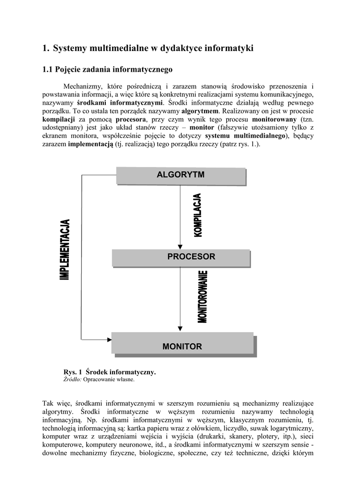 1. Systemy multimedialne w dydaktyce informatyki 1.1 Pojęcie zadania informatycznego Mechanizmy, które pośredniczą i zarazem stanowią środowisko przenoszenia i powstawania informacji, a więc które są konkretnymi realizacjami systemu komunikacyjnego, nazywamy środkami informatycznymi. Środki informatyczne działają według pewnego porządku. To co ustala ten porządek nazywamy algorytmem. Realizowany on jest w procesie kompilacji za pomocą procesora, przy czym wynik tego procesu monitorowany (tzn. udostępniany) jest jako układ stanów rzeczy – monitor (fałszywie utoŜsamiony tylko z ekranem monitora, współcześnie pojęcie to dotyczy systemu multimedialnego), będący zarazem implementacją (tj. realizacją) tego porządku rzeczy (patrz rys. 1.). ALGORYTM PROCESOR MONITOR Rys. 1 Środek informatyczny. Źródło: Opracowanie własne. Tak więc, środkami informatycznymi w szerszym rozumieniu są mechanizmy realizujące algorytmy. Środki informatyczne w węŜszym rozumieniu nazywamy technologią informacyjną. Np. środkami informatycznymi w węŜszym, klasycznym rozumieniu, tj. technologią informacyjną są: kartka papieru wraz z ołówkiem, liczydło, suwak logarytmiczny, komputer wraz z urządzeniami wejścia i wyjścia (drukarki, skanery, plotery, itp.), sieci komputerowe, komputery neuronowe, itd., a środkami informatycznymi w szerszym sensie dowolne mechanizmy fizyczne, biologiczne, społeczne, czy teŜ techniczne, dzięki którym rzeczy (zjawiska, zdarzenia, przedmioty, itp.) stają się takimi a nie innymi obiektami rozpoznawanymi jako układy pewnych stanów rzeczy, a więc rozpoznawane są jako implementacje pewnych algorytmów. W tym rozumieniu wiedzę z zakresu informatyki oraz umiejętności logicznego myślenia i programowania, wchodzącą w skład tzw. "kultury informatycznej", naleŜy teŜ zaliczyć do środków informatycznych (patrz Studium 1.1 – 1.3) . Studium 1.1 Środek informatyczny: eksperyment fizyczny. Algorytm: sprawdzić prawo Hoocka dla pewnego metalu. Implementacja: korzystając z wiedzy o tym metalu przyjmuje się, Ŝe drut sporządzony z tego metalu, rozciągany przez wybrane siły będzie się wydłuŜał zgodnie z prawem Hoocka i nie odkształci się. Kompilacja: drut jest rozciągany przez wybrane siły. Procesor: drut wykonany z badanego metalu, na który działają wybrane siły. Monitorowanie: drut widoczny na tle podziałki mierzącej jego długość wraz z dynamometrem mierzącym siły - wielkości sił i długości nanoszone są na wykres . Monitor: bezpośredni ogląd miejsca, w którym dokonywane jest doświadczenie oraz wykres zaleŜności siła-długość drutu sporządzony na kartce papieru. Studium 1.2 1 Środek informatyczny: wynalazek techniczny. Algorytm: tak przekonstruować deszczownice będące w uŜyciu aby miały większą wydajność, intensywność zraszania oraz zasięg. Implementacja: wydłuŜenie skrzydeł deszczownicy zwiększa jej wydajność i zasięg. Kompilacja: przeprojektowanie deszczownicy w taki sposób aby miała dłuŜsze skrzydła. Procesor: deszczownica jest to traktor wyposaŜony w pompę i skrzydła - kratownicę (wysięgniki). Na skrzydłach umieszczone są rozpryskiwacze (polewaczki). Dwuwysięgnikowy agregat zuŜywa 90-100 litrów wody. Napór roboczy – 23 metry słupa wody, u podstawy skrzydła - 30 metrów, zasięg roboczy 120 metrów. Maszyna przemieszcza się wzdłuŜ kanałów nawadniających przekopany co 120 metrów. Monitorowanie: Deszczownice są metalochłonne. CięŜar kratownicy jest proporcjonalny do sześcianu jej długości. Jeśli zwiększyć długość kratownicy o połowę, cięŜar jej wzrośnie o trzy i pół raza. Dlatego rozpiętość skrzydeł jest ograniczona do 100 metrów. Przeprowadzono wiele prób rozwiązania tego zadania. „Rura zraszająca” była na przykład zawieszana na areostatach albo podnoszona za pomocą śmigłowców uruchamianych ciśnieniem pompowanej od dołu wody, albo teŜ montowana była na wieŜy i uruchamiana za pomocą silników turboodrzutowych, itp. Wszystkie próby pokazały, Ŝe wydłuŜenie skrzydeł zwiększa w sposób niedopuszczalny zuŜycie materiałów, a zwiększony cięŜar deszczownicy utrudnia jej kierowanie. Monitor: bezpośredni ogląd prób technicznych, urządzenia pomiarowe. Studium 1.3 Środek informatyczny: zadanie z geometrii – „Łączenie punktów”2. Algorytm: Dane jest 9 punktów na płaszczyźnie, wyznaczających wierzchołki kwadratu i czterech mniejszych kwadratów weń wpisanych . Wszystkie te punkty połączyć linią ciągłą złoŜoną z czterech odcinków. 1 2 H. Altszuller, Algorytm wynalazku, Wiedza Powszechna, Warszawa 1972, s. 80. Z. Peitrasiński, Atakowanie problemów, Nasza Księgarnia, Warszawa 1983, s 20. Implementacja: do szukanej linii naleŜy 9 danych punktów oraz składa się ona z czterech odcinków, których końcami są tylko dane punkty. Kompilacja: łączenie odcinkami kolejno wybranych punktów. Procesor: zbiór wszystkich odcinków do których naleŜą dane punkty.. Monitorowanie: do Ŝadnej określonej w kompilacji linii nie naleŜą wszystkie dane punkty. Monitor: rysunek przedstawiający wynik kompilacji. Uczestniczenie w kulturze informatycznej wymaga posiadania przez ludzi umiejętności przetwarzania informacji oraz wykorzystywania środków informatycznych. Takie przetwarzanie informacji nazywamy zadaniami informatycznymi, a wykonywanie czynności prowadzących do przetwarzania informacji z uŜyciem środków informatycznych – wykonywaniem zadań. Zadania informatyczne nie muszą być więc sformułowane słownie np.. w formie pytań lub poleceń do wykonania. W przypadku posługiwania się techniką komputerową, zadania informatyczne dotyczą wszystkich aspektów wykorzystywania tej techniki, np. uruchomienie sprzętu, obsługa klawiatury i myszki, zalogowanie się do sieci, archiwizacja danych, redagowanie pism z uŜyciem edytorów komputerowych, przygotowanie danych 