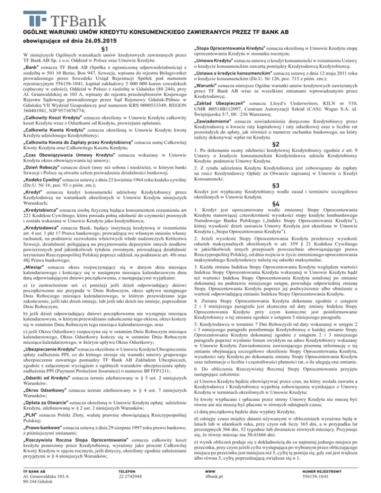 OGÓLNE WARUNKI UMÓW KREDYTU KONSUMENCKIEGO ZAWIERANYCH PRZEZ TF BANK AB obowiązujące od dnia 26.05.2015 §1 W niniejszych Ogólnych warunkach umów kredytowych zawieranych przez TF Bank AB Sp. z o.o. Oddział w Polsce oraz Umowie Kredytu: „Bank” oznacza TF Bank AB (Spółka z ograniczoną odpowiedzialnością) z siedzibą w 501 10 Boras, Box 947, Szwecja, wpisana do rejestru Bolagsverket prowadzonego przez Szwedzki Urząd Rejestracji Spółek pod numerem rejestracyjnym 556158-1041, kapitał zakładowy 5 000 000 koron szwedzkich (opłacony w całości), Oddział w Polsce z siedzibą w Gdańsku (80 244), przy Al. Grunwaldzkiej nr 103 A, wpisany do rejestru przedsiębiorców Krajowego Rejestru Sądowego prowadzonego przez Sąd Rejonowy Gdańsk-Północ w Gdańsku VII Wydział Gospodarczy pod numerem KRS 0000533349, REGON 360401941, NIP 9571076774; „Całkowity Koszt Kredytu” oznacza określony w Umowie Kredytu całkowity koszt Kredytu wraz z Odsetkami od Kredytu, prowizjami opłatami; „Całkowita Kwota Kredytu” oznacza określoną w Umowie Kredytu kwotę Kredytu udzielonego Kredytobiorcy; „Całkowita Kwota do Zapłaty przez Kredytobiorcę” oznacza sumę Całkowitej Kwoty Kredytu oraz Całkowitego Kosztu Kredytu; „Czas Obowiązywania Umowy Kredytu” oznacza wskazany w Umowie Kredytu okres obowiązywania tej umowy; „Dzień Roboczy” oznacza dzień (inny niż sobota i niedziela), w którym banki Szwecji i Polsce są otwarte celem prowadzenia działalności bankowej; „Kodeks Cywilny” oznacza ustawę z dnia 23 kwietnia 1964 roku kodeks cywilny (Dz.U. Nr 16, poz. 93 z późn. zm.); „Stopa Oprocentowania Kredytu” oznacza określoną w Umowie Kredytu stopę oprocentowania Kredytu w stosunku rocznym; „Umowa Kredytu” oznacza umowę o kredyt konsumencki w rozumieniu Ustawy o kredycie konsumenckim zawartą pomiędzy Kredytodawcą Kredytobiorcą; „Ustawa o kredycie konsumenckim” oznacza ustawę z dnia 12 maja 2011 roku o kredycie konsumenckim (Dz.U. Nr 126, poz. 715 z późn. zm.); „Warunki” oznacza niniejsze Ogólne warunki umów kredytowych zawieranych przez TF Bank AB wraz ze wszelkimi zmianami wprowadzanymi przez Kredytodawcę; „Zakład Ubezpieczeń” oznacza Lloyd’s Underwriters, KILN nr 510, UMR B0518B112097, Centrum Autoryzacji Szkód (CAS): Wagas S.A. ul. Świętojerska 5/7, 00‐236 Warszawa; „Zawiadomienie” oznacza zawiadomienie doręczone Kredytobiorcy przez Kredytodawcę o kwocie raty kapitałowej i raty odsetkowej oraz o liczbie rat pozostałych do spłaty, jak również o numerze rachunku bankowego, na który należy dokonywać wpłat rat Kredytu. §2 1. Po dokonaniu oceny zdolności kredytowej Kredytobiorcy zgodnie z art. 9 Ustawy o kredycie konsumenckim Kredytodawca udziela Kredytobiorcy Kredytu podstawie Umowy Kredytu. 2. Z tytułu udzielenia Kredytu Kredytobiorca jest zobowiązany do zapłaty na rzecz Kredytodawcy Opłaty za Otwarcie zapisanej w Umowie o Kredyt Konsumencki. §3 „Kredyt” oznacza kredyt konsumencki udzielony Kredytobiorcy przez Kredytodawcę na warunkach określonych w Umowie Kredytu niniejszych Warunkach; Kredyt jest wypłacany Kredytobiorcy wedle zasad i terminów szczegółowo określonych w Umowie Kredytu. „Kredytobiorca” oznacza osobę fizyczną będąca konsumentem rozumieniu art 221 Kodeksu Cywilnego, która posiada pełną zdolność do czynności prawnych i została wskazana w Umowie Kredytu jako kredytobiorca; 1. Kredyt jest oprocentowany wedle zmiennej Stopy Oprocentowania Kredytu stanowiącej czterokrotność wysokości stopy kredytu lombardowego Narodowego Banku Polskiego („Indeks Stopy Oprocentowania Kredytu”), której wysokość dzień zawarcia Umowy Kredytu jest określona w Umowie Kredytu („Stopa Oprocentowania Kredytu”). „Kredytodawca” oznacza Bank, będący instytucją kredytową w rozumieniu art. 4 ust. 1 pkt 17 Prawa bankowego, prowadzącą we własnym imieniu własny rachunek, na podstawie zezwolenia właściwych władz nadzorczych Królestwa Szwecji, działalność polegającą na przyjmowaniu depozytów innych środków powierzonych pod jakimkolwiek tytułem zwrotnym, prowadzącą działalność terytorium Rzeczypospolitej Polskiej poprzez oddział, na podstawie art. 48i oraz 48j Prawa bankowego; „Miesiąc” oznacza okres rozpoczynający się w danym dniu miesiąca kalendarzowego i kończący się w następnym miesiącu kalendarzowym dniu datą odpowiadającym dniowi początkowemu, z następującymi wyjątkami: a) (z zastrzeżeniem ust. c) poniżej) jeśli dzień odpowiadający dniowi początkowemu nie przypada w Dniu Roboczym, okres upływa następnego Dnia Roboczego miesiąca kalendarzowego, w którym przewidziano jego zakończenie, jeśli taki dzień istnieje, lub jeśli taki dzień nie istnieje, poprzednim Dniu Roboczym; b) jeśli dzień odpowiadający dniowi początkowemu nie występuje miesiącu kalendarzowym, w którym przewidziano zakończenie tego okresu, okres kończy się w ostatnim Dniu Roboczym tego miesiąca kalendarzowego; oraz c) jeśli Okres Odsetkowy rozpoczyna się w ostatnim Dniu Roboczym miesiąca kalendarzowego, Okres Odsetkowy kończy się w ostatnim Dniu Roboczym miesiąca kalendarzowego, w którym upływa Okres Odsetkowy; „Ubezpieczenie Kredytu” oznacza określone w Umowie Kredytu Ubezpieczenie spłaty zadłużenia PPI, co do którego stosuje się warunki umowy grupowego ubezpieczenia zawartego pomiędzy TF Bank AB Zakładem Ubezpieczeń, zgodnie z załączonym wyciągiem z ogólnych warunków ubezpieczenia spłaty zadłużenia PPI (Payment Protection Insurance) o numerze BFTFP1211; „Odsetki od Kredytu” oznacza termin zdefiniowany w § 5 ust. 2 niniejszych Warunków; „Okres Odsetkowy” oznacza termin zdefiniowany w § 4 ust. 7 niniejszych Warunków; „Opłata za Otwarcie” oznacza określoną w Umowie Kredytu opłatę udzielenie Kredytu, zdefiniowaną w § 2 ust. 2 niniejszych Warunków; „PLN” oznacza Polski Złoty, walutę prawni