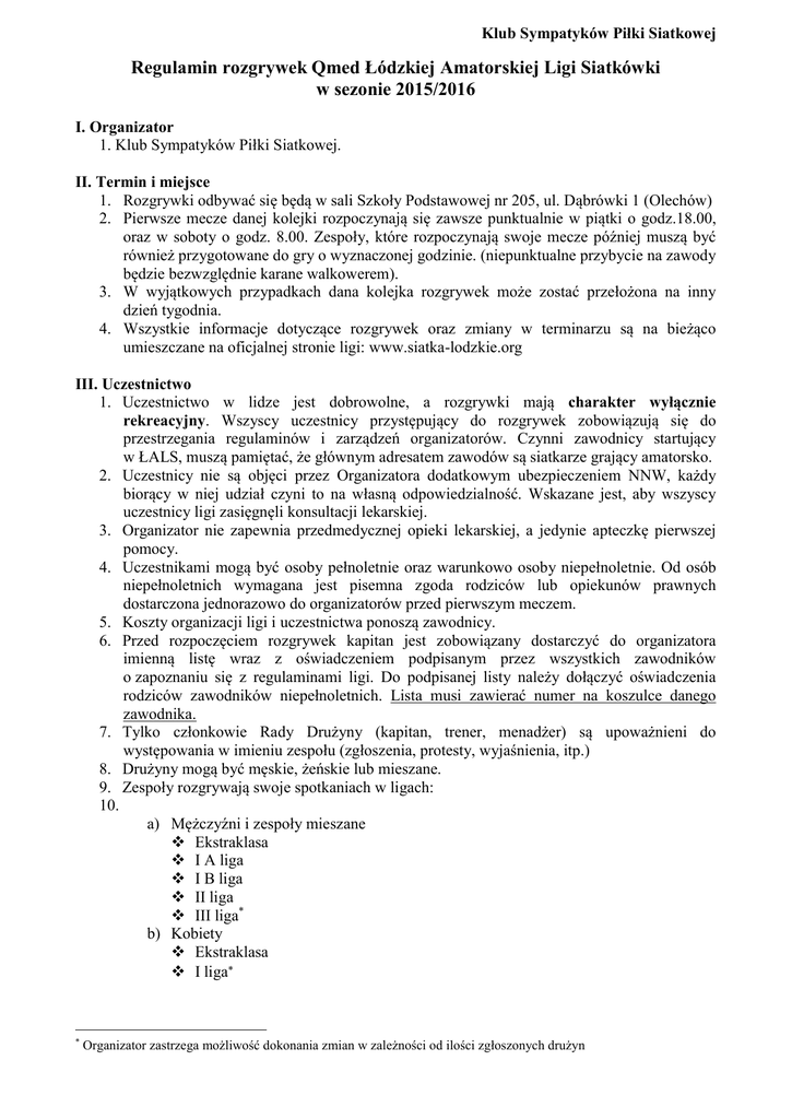 Klub Sympatyków Piłki Siatkowej Regulamin rozgrywek Qmed Łódzkiej Amatorskiej Ligi Siatkówki w sezonie 2015/2016 I. Organizator 1. Klub Sympatyków Piłki Siatkowej. II. Termin i miejsce 1. Rozgrywki odbywać się będą w sali Szkoły Podstawowej nr 205, ul. Dąbrówki 1 (Olechów) 2. Pierwsze mecze danej kolejki rozpoczynają się zawsze punktualnie w piątki o godz.18.00, oraz w soboty o godz. 8.00. Zespoły, które rozpoczynają swoje mecze później muszą być również przygotowane do gry o wyznaczonej godzinie. (niepunktualne przybycie na zawody będzie bezwzględnie karane walkowerem). 3. W wyjątkowych przypadkach dana kolejka rozgrywek może zostać przełożona na inny dzień tygodnia. 4. Wszystkie informacje dotyczące rozgrywek oraz zmiany w terminarzu są na bieżąco umieszczane na oficjalnej stronie ligi: www.siatka-lodzkie.org III. Uczestnictwo 1. Uczestnictwo w lidze jest dobrowolne, a rozgrywki mają charakter wyłącznie rekreacyjny. Wszyscy uczestnicy przystępujący do rozgrywek zobowiązują się do przestrzegania regulaminów i zarządzeń organizatorów. Czynni zawodnicy startujący w ŁALS, muszą pamiętać, że głównym adresatem zawodów są siatkarze grający amatorsko. 2. Uczestnicy nie są objęci przez Organizatora dodatkowym ubezpieczeniem NNW, każdy biorący w niej udział czyni to na własną odpowiedzialność. Wskazane jest, aby wszyscy uczestnicy ligi zasięgnęli konsultacji lekarskiej. 3. Organizator nie zapewnia przedmedycznej opieki lekarskiej, a jedynie apteczkę pierwszej pomocy. 4. Uczestnikami mogą być osoby pełnoletnie oraz warunkowo osoby niepełnoletnie. Od osób niepełnoletnich wymagana jest pisemna zgoda rodziców lub opiekunów prawnych dostarczona jednorazowo do organizatorów przed pierwszym meczem. 5. Koszty organizacji ligi i uczestnictwa ponoszą zawodnicy. 6. Przed rozpoczęciem rozgrywek kapitan jest zobowiązany dostarczyć do organizatora imienną listę wraz z oświadczeniem podpisanym przez wszystkich zawodników o zapoznaniu się z regulaminami ligi. Do podpisanej listy należy dołączyć oświadczenia rodziców zawodników niepełnoletnich. Lista musi zawierać numer na koszulce danego zawodnika. 7. Tylko członkowie Rady Drużyny (kapitan, trener, menadżer) są upoważnieni do występowania w imieniu zespołu (zgłoszenia, protesty, wyjaśnienia, itp.) 8. Drużyny mogą być męskie, żeńskie lub mieszane. 9. Zespoły rozgrywają swoje spotkaniach w ligach: 10. a) Mężczyźni i zespoły mieszane Ekstraklasa I A liga I B liga II liga III liga* b) Kobiety Ekstraklasa I liga * Organizator zastrzega możliwość dokonania zmian w zależności od ilości zgłoszonych drużyn Klub Sympatyków Piłki Siatkowej 11. W rozgrywkach uczestniczą zespoły, które zgłosiły swój udział do organizatora do dnia 11.09.2015. (Organizatorzy zastrzegają sobie prawo dokooptowania po tym terminie do rozgrywek I ligi kobiet lub III ligi mężczyzn wyłącznie nowe zespoły) 12. Każdy z zawodników i oficjalnych członków drużyny otrzyma bezpłatnie kartę uczestnika ŁALS, będącą jednocześnie identyfikatorem umożliwiającym automatyczne wypełnienie protokołu meczu. (Uwaga! W przypadku zagubienia karty, kolejna będzie wydana zawodnikowi /zawodniczce/ po uiszczeniu opłaty 20 zł.) 13. Do gry uprawniony jest jedynie zawodnik, który przed meczem potwierdzi swoją obecność poprzez przyłożenie karty do zbliżeniowego czytnika rejestracyjnego. Zeskanowanie swojej katy w czytniku jest jednoznaczne z wpisaniem zawodnika (członka zespołu) do protokołu. 14. Nowego zawodnika (nie zgłoszonego w danym sezonie w WZPS lub PZPS) można zgłosić do rozgrywek do 30.01.2016. (w uzasadnionych przypadkach Komisja Gier może wyrazić zgodę na dokooptowanie nowego zawodnika do zespołu poza wyznaczonym terminem) Zgłoszenia można dokonać wyłącznie mailowo nie później niż w czwartek do godz. 20 przed daną kolejką. Zawodnik po przybyciu na halę otrzyma kartę oraz musi podpisać oświadczenie o zapoznaniu się z regulaminami ligi. 15. Zawodnika zgłoszonego w rozgrywkach WZPS lub PZPS można zgłaszać do 31 grudnia 2015 na zasadach określonych w pkt. 13 i na warunkach określonych w pkt 19. 16. Mecze rozgrywane są zgodnie z Oficjalnymi Przepisami Gry PZPS z następującymi wyjątkami: a) Dopuszcza się udział zespołów 5 osobowych, b) Jeżeli zespół przeciwny wyrazi zgodę drużyna może liczyć mniej niż 5 zawodników, c) W przypadku kontuzji w trakcie spotkania, zespół może dokończyć mecz z mniejszą ilością zawodników, d) W przypadku gdy jeden z zawodników będzie kontuzjowany, a zespół nie ma możliwości dokonania zmiany regulaminowej ani zmiany narzuconej to w jego miejsce może wejść zawodnik Libero i grać jak każdy inny zawodnik. Zawodnik zmieniony w takim trybie nie może już powrócić do gry w danym spotkaniu. e) Wskazanych w pkt c i d wyjątków nie stosuje się w przypadkach nałożenia kar na zawodników (wykluczenie, dyskwalifikacja). W takim wypadku zmiany muszą być dokonywane zgodnie z przepisami lub drużyna jest zdekompletowana. f) W sytuacji gdy zespół rozpocznie mecz w niepełnym składzie, uzupełnienie może nastąpić dopiero przed rozpoczęciem kolejnego seta. g) W przypadku braku pełnego składu zespołu, zawodnik libero może rozpocząć mecz na dowolnej pozycji w polu. W sytuacji kiedy skład zespołu zostanie uzupełniony zawodnik libero może przejść na swoją właściwą pozycję. Powrót libero na swoją właściwą pozycję może nastąpić dopiero przed rozpoczęciem kolejnego seta. Zespół grający z uzupełniającym skład libero nie może do końca danego seta dokonać żadnej zmiany zarówno regulaminowej jak i narzuconej (kontuzja). W przypadku wykluczenia lub dyskwalifikacji set zostaje zakończony (zespół zdekompletowany). Chęć skorzystania z powyższej możliwości regulaminowej musi zostać zgłoszona przed meczem zarówno kapitanowi druży