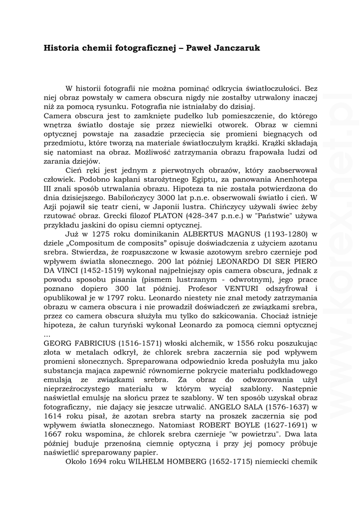 Historia chemii fotograficznej – Paweł Janczaruk www.korex.net.pl W historii fotografii nie moŜna pominąć odkrycia światłoczułości. Bez niej obraz powstały w camera obscura nigdy nie zostałby utrwalony inaczej niŜ za pomocą rysunku. Fotografia nie istniałaby do dzisiaj. Camera obscura jest to zamknięte pudełko lub pomieszczenie, do którego wnętrza światło dostaje się przez niewielki otworek. Obraz w ciemni optycznej powstaje na zasadzie przecięcia się promieni biegnących od przedmiotu, które tworzą na materiale światłoczułym krąŜki. KrąŜki składają się natomiast na obraz. MoŜliwość zatrzymania obrazu frapowała ludzi od zarania dziejów. Cień ręki jest jednym z pierwotnych obrazów, który zaobserwował człowiek. Podobno kapłani staroŜytnego Egiptu, za panowania Anenhotepa III znali sposób utrwalania obrazu. Hipoteza ta nie została potwierdzona do dnia dzisiejszego. Babilończycy 3000 lat p.n.e. obserwowali światło i cień. W Azji pojawił się teatr cieni, w Japonii lustra. Chińczycy uŜywali świec Ŝeby rzutować obraz. Grecki filozof PLATON (428-347 p.n.e.) w "Państwie" uŜywa przykładu jaskini do opisu ciemni optycznej. JuŜ w 1275 roku dominikanin ALBERTUS MAGNUS (1193-1280) w dziele „Compositum de composits” opisuje doświadczenia z uŜyciem azotanu srebra. Stwierdza, Ŝe rozpuszczone w kwasie azotowym srebro czernieje pod wpływem światła słonecznego. 200 lat później LEONARDO DI SER PIERO DA VINCI (1452-1519) wykonał najpełniejszy opis camera obscura, jednak z powodu sposobu pisania (pismem lustrzanym - odwrotnym), jego prace poznano dopiero 300 lat później. Profesor VENTURI odszyfrował i opublikował je w 1797 roku. Leonardo niestety nie znał metody zatrzymania obrazu w camera obscura i nie prowadził doświadczeń ze związkami srebra, przez co camera obscura słuŜyła mu tylko do szkicowania. ChociaŜ istnieje hipoteza, Ŝe całun turyński wykonał Leonardo za pomocą ciemni optycznej ... GEORG FABRICIUS (1516-1571) włoski alchemik, w 1556 roku poszukując złota w metalach odkrył, Ŝe chlorek srebra zaczernia się pod wpływem promieni słonecznych. Spreparowana odpowiednio kreda posłuŜyła mu jako substancja mająca zapewnić równomierne pokrycie materiału podkładowego emulsją ze związkami srebra. Za obraz do odwzorowania uŜył nieprzeźroczystego materiału w którym wyciął szablony. Następnie naświetlał emulsję na słońcu przez te szablony. W ten sposób uzyskał obraz fotograficzny, nie dający się jeszcze utrwalić. ANGELO SALA (1576-1637) w 1614 roku pisał, Ŝe azotan srebra starty na proszek zaczernia się pod wpływem światła słonecznego. Natomiast ROBERT BOYLE (1627-1691) w 1667 roku wspomina, Ŝe chlorek srebra czernieje "w powietrzu". Dwa lata później buduje przenośną ciemnię optyczną i przy jej pomocy próbuje naświetlić spreparowany papier. Około 1694 roku WILHELM HOMBERG (1652-1715) niemiecki chemik www.korex.net.pl prowadził studia światłoczułości soli srebra. ZauwaŜył, Ŝe kość zanurzona w azotanie srebra zaciemnia się w świetle słonecznym. Natomiast w 1727 roku JOHANN HEINRICH SCHULZE (1687-1744) teŜ niemiecki chemik podsumował dotychczasowe eksperymenty ze związkami srebra. Do odwzorowania obrazu uŜywał emulsji światłoczułej sporządzonej z chlorku srebra na podkładzie z białej kredy. Eksperymentował z papierowymi szablonami, które przykładał do butelki zawierającej kredę nasączoną azotanem srebra. Właściwość tą nazwał światłoczułością. W ten sposób uzyskał nie dający się jeszcze utrwalić, obraz fotograficzny. Wielu było badaczy, których interesowała światłoczułość i tak w 1757 roku GIACOMO BATTISTA BECCARIA bada światłoczułość chlorku srebrowego. Natomiast szwedzki chemik CHARLES WILLIAM SCHEELE w 1777 roku eksperymentował z chlorkiem srebra i światłem słonecznym. Udowodnił, Ŝe poszczególne barwy widma miały odmienne skutki na związki srebra, kiedy były poddane działaniu słońca. Stwierdził, Ŝe ciemniejsze kolory (purpura, błękit) mocniej oddziaływały na chlorek srebra, który ciemniał mocniej. Scheele stwierdził równieŜ, Ŝe sczerniały na świetle chlorek srebrowy jest zredukowanym metalicznym srebrem nie rozpuszczalnym w wodzie, a nienaświetlony natomiast daje się rozpuszczać. ZauwaŜył równieŜ, Ŝe chlorek srebra czernieje proporcjonalnie do działania światła, zwłaszcza, jeŜeli zawiera przewagę promieni błękitnych i fioletowych. Inny badacz JACQUES CHARLES w 1780 roku robił interesujące doświadczenia. Skonstruował przyrząd, przy pomocy którego kopiował sylwetki ludzi na papierze chlorowym. Eksperyment mógł przeprowadzić tylko w ciemni optycznej, której otworek rzucał obraz obiektu na papier światłoczuły. Nie znamy zasad jego doświadczeń, gdyŜ zmarł nie pozostawiwszy opisów swej pracy. W 1796 roku Anglik THOMAS WEDGWOOD uzyskuje stykowe odbitki sylwetek na skórze uczulonej azotanem srebra. Niestety, jak i poprzednicy, nie umie ich utrwalić. Podobnie sir HUMPHRY DAVY (1778-1829) w 1802 roku zrobił coś w rodzaju fotografii, kładąc skrzydełka owadów i liście na światłoczułym papierze i skórze, a następnie przepuszczając przez nie światło, tworzył obrazy. On teŜ nie znał sposobu utrwalenia „fotogramów”. JOSEPH NICEPHORE NIEPCE (1765-1833) w 1814 rozpoczął pierwsze próby z fotografią. Eksperymenty rozpoczął od kamienia litograficznego po nieudanych próbach zastosował płyty cynowe. Po wielu doświadczeniach w 1816 roku spostrzegł, Ŝe cienka warstewka asfaltu syryjskiego, umieszczona w płynnym stanie na płytce i następnie wystawiona na działanie promieni słonecznych, traci swą rozpuszczalność w miejscach naświetlonych. W miejscach zaś nie naświetlonych łatwo rozpuszcza się w olejku lawendowym. Metodę tą nazwał heliografią. Co prawda juŜ w liście do brata z 1811 roku pisał "przesyłam ci 4 nowe z