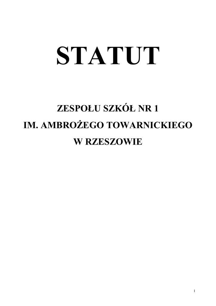 STATUT ZESPOŁU SZKÓŁ NR 1 IM. AMBROŻEGO TOWARNICKIEGO W RZESZOWIE 1 STATUT SZKOŁY I. Nazwa szkoły, inne informacje o szkole §1 1. Szkoła nosi nazwę: Zespół Szkół Nr 1 im. Ambrożego Towarnickiego 2. Zespół Szkół Nr 1 w Rzeszowie zwany dalej Szkołą jest jednostką budżetową prowadzącą gospodarkę finansową na podstawie odrębnych przepisów. 3. W skład Szkoły wchodzą: 1) VI Liceum Ogólnokształcące, 2) Technikum Nr 1. 4. Nazwy szkół wchodzących w skład Zespołu Szkół Nr 1 im. Ambrożego Towarnickiego składają się z nazwy Zespołu i z nazwy szkoły 5.Siedziba Zespołu Szkół Nr 1 im. Ambrożego Towarnickiego mieści się przy ulicy Towarnickiego 4 w Rzeszowie. 6.Organem prowadzącym Szkołę jest Miasto Rzeszów §2 1. 2. 1) 2) 3) 4) 3. Szkoła posiada własny sztandar i ceremoniał. Do najważniejszych uroczystości tworzących ceremoniał szkolny należą: obchody świąt narodowych, okolicznościowych, regionalnych wynikających z kalendarza historycznego; rozpoczęcie i zakończenie roku szkolnego; pasowanie na ucznia, ślubowanie klas pierwszych; święto Patrona Szczegółowe zasady ceremoniału szkolnego są zawarte § 68 Statutu Szkoły. §3 1.Ustalona nazwa Szkoły jest używana w pełnym brzmieniu. Na pieczęciach może być używany skrót nazwy. Przepis dotyczy również szkół wymienionych §1 ust.3 §4 1. Oświata w Rzeczypospolitej Polskiej stanowi wspólne dobro całego społeczeństwa; kieruje się zasadami zawartymi w Konstytucji Rzeczypospolitej Polskiej, a także wskazaniami zawartymi w Powszechnej Deklaracji Praw Człowieka, Międzynarodowym Pakcie Praw Obywatelskich i Politycznych oraz Międzynarodowej Konwencji o Prawach Dziecka. Nauczanie i wychowanie — respektując chrześcijański system wartości — za podstawę przyjmuje uniwersalne zasady etyki. 2. Kształcenie i wychowanie służy rozwijaniu młodzieży poczucia odpowiedzialności, miłości ojczyzny oraz poszanowania dla polskiego dziedzictwa kulturowego, przy jednoczesnym otwarciu na wartości kultur Europy i świata. 3. Szkoła winna zapewnić każdemu uczniowi warunki niezbędne do jego rozwoju, przygotować go do wypełniania obowiązków rodzinnych i obywatelskich w oparciu o zasady solidarności, demokracji, tolerancji, sprawiedliwości i wolności. 2 §5 1. Zespół Szkół Nr 1 im. Ambrożego Towarnickiego: 1) respektuje prawa każdego ucznia i stwarza warunki do: a) podtrzymywania poczucia tożsamości narodowej i etnicznej, b) swobodnego wyboru nauki religii; 2) zapewnia pomoc psychologiczną i pedagogiczną przez wykwalifikowaną kadrę nauczycieli i wychowawców oraz przez pedagoga szkolnego współdziałającego z poradniami psychologicznopedagogicznymi i innymi placówkami i poradniami specjalistycznymi; 3) umożliwia rozwijanie zainteresowań uczniów w ramach zajęć pozalekcyjnych i kół zainteresowań oraz innych formach kształcenia, które są pomocne w zdobywaniu wiedzy specjalistycznej, 4) umożliwia tworzenie oddziałów integracyjnych, 5) umożliwia realizację indywidualnych programów nauczania oraz ukończenia szkoły w skróconym czasie- zgodnie z obowiązującymi przepisami. 6) zapewnia ochronę prawną nauczycieli jako funkcjonariuszy publicznych na zasadach określonych w ustawach. §6 1.Szkoła realizuje cele i zadania określone w ustawie o systemie oświaty oraz przepisach wydanych na jej podstawie. W szczególności – Szkoła: 1) umożliwia zdobycie wiedzy i umiejętności niezbędnych do uzyskania świadectw i dyplomów państwowych; 2) umożliwia efektywne kształcenie umiejętności zawodowych oczekiwanych przez przyszłych pracodawców i zmieniające się wymagania rynku pracy; 3) umożliwia absolwentom dokonania świadomego wyboru dalszego kształcenia lub wykonywania wybranego zawodu, 4) kształtuje środowisko wychowawcze sprzyjające realizowaniu celów i zasad określonych w wyżej wymienionej ustawie, stosownie do warunków Szkoły i wieku uczniów; 5) sprawuje opiekę nad uczniami odpowiednio do ich potrzeb oraz możliwości Szkoły. §7 1.Zadania opiekuńcze Szkoły realizowane są odpowiednio do wieku uczniów i potrzeb środowiskowych z uwzględnieniem obowiązujących w szkołach przepisów bezpieczeństwa i higieny pracy. W tym celu: 1) bezpośredni nadzór nad bezpieczeństwem uczniów sprawują nauczyciele prowadzący zajęcia obowiązkowe, nadobowiązkowe i pozalekcyjne; 2) nadzór nad uczniami podczas zajęć poza terenem szkoły sprawują nauczyciele lub inne upoważnione do tego osoby pełnoletnie zgodnie z obowiązującymi przepisami; 3) dla zapewnienia bezpieczeństwa w Szkole organizowane są dyżury nauczycielskie; 4) Szkoła zapewnia uczniom rozpoczynającym naukę indywidualną opiekę pedagoga szkolnego i pośredniczy w uzyskaniu pomocy psychologiczno – pedagogicznej świadczonej przez inne wyspecjalizowane instytucje; 5) Szkoła respektuje zalecenia lekarskich poradni specjalistycznych i zapewnia uczniom podstawową opiekę medyczną zgodnie z obowiązującymi przepisami, 6) uczniom znajdującym się w trudnych warunkach materialnych lub w przypadkach losowych Szkoła w porozumieniu i przy wsparciu Rady Rodziców, ośrodków pomocy społecznej świadczy stałą bądź doraźną pomoc finansową. 3 §8 1. Czas trwania cyklu kształcenia w poszczególnych typach szkół wchodzących w skład Zespołu Szkół Nr 1 im. Ambrożego Towarnickiego jest zgodny z przepisami w sprawie ramowych planów nauczania zawartych w rozporządzeniu ministra właściwego do spraw oświaty i wychowania. 2. Kształcenie w szkołach wchodzących w skład Zespołu Szkół Nr 1 im. Ambrożego Towarnickiego odbywa się w zawodach i profilach stosownych do potrzeb społeczności lokalnej oraz możliwości kadrowych i bazowych Szkoły. 3. Rodzaj zawodów i profili, w których odbywa się kształcenie, jest określany corocznie w arkuszu organizacyjnym Szkoły. 4. Szkoła prowadzi działalność wspomagającą proces dydaktyczny