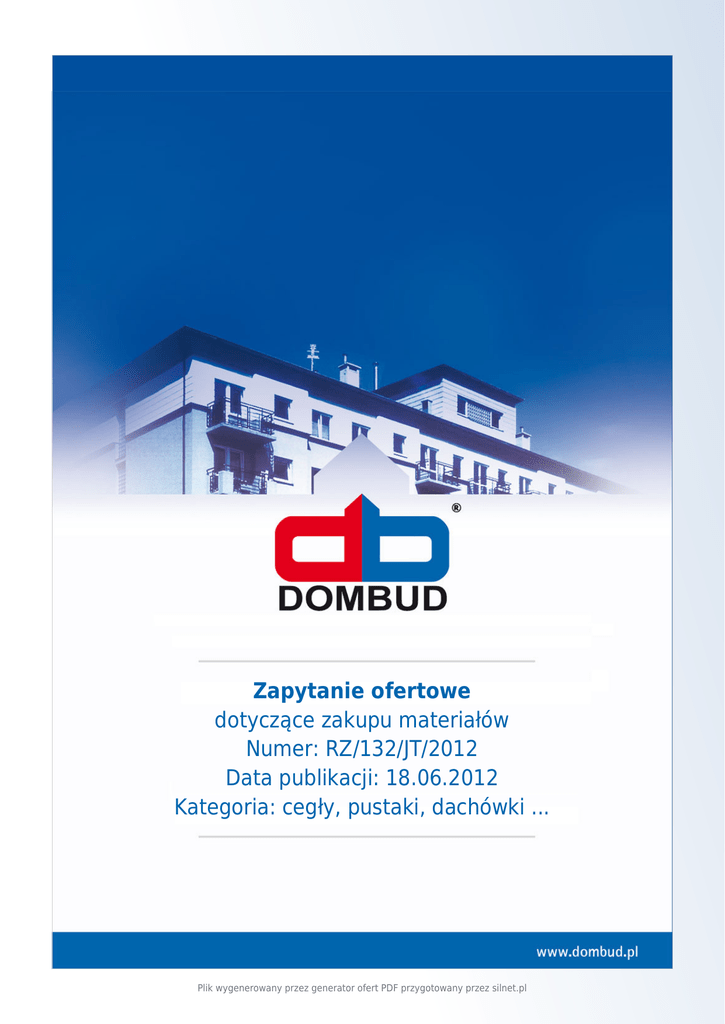 Zapytanie ofertowe dotyczące zakupu materiałów Numer: RZ/132/JT/2012 Data publikacji: 18.06.2012 Kategoria: cegły, pustaki, dachówki ... Plik wygenerowany przez generator ofert PDF przygotowany przez silnet.pl Zapytanie oferowe Numer: RZ/132/JT/2012 z dnia 18.06.2012 P.B. DOMBUD S.A. zwraca się z prośbą o przedstawienie oferty na sprzedaż i dostawę następujących materiałów: 1. Cegła silikatowa N8 , kl. 15 - 2688 szt. 2. Cegła silikatowa N12 , kl. 15 - 512 szt. ● ● Miejsce dostawy - Sosnowiec, ul. Baczyńskiego Termin realizacji - 21.06.2012 Palety jednorazowe bezzwrotne, jeżeli zwrotne to 1.Towar dostarczony zostanie na paletach zwrotnych . 2.Wykonawca za ww. palety pobiera kaucję w wysokości 20,00 zł . ( słownie dwadzieścia złotych za jedną sztukę. 3.Wykonawca zobowiązany jest do odbioru ww. palet na swój koszt z miejsca dostarczenia towaru w terminie do 30 dni od daty dostawy towarów po uprzednim uzgodnieniu telefonicznym z Kierownikiem budowy. 4. Wykonawca zwróci Zamawiającemu kaucję za ww. palety w terminie 14 dni od daty odbioru palet przez Wykonawcę. 5.Wykonawca zobowiązany jest zwrócić Zamawiającemu kaucję z ww. palety w przypadku ich nieodebrania przez Wykonawcę w terminie 30 dni od daty dostawy towarów. Zwrot kaucji w tym przypadku nastąpi w terminie 7 dni od daty, w którym upłynął wyżej zakreślony termin na odbiór palet przez Wykonawcę. 6. W przypadku nieodebrania przez Wykonawcę palet w terminie 30 dni od daty dostawy towarów Zamawiający może domagać się od Wykonawcy pokrycia kosztów ich przechowania w wysokości 1,00 zł ( słownie; jeden złotych ) za przechowanie jednej sztuk. Prosimy o: ● ● ● podanie ceny netto materiałów oraz wartość franco budowa, podanie warunków płatności, potwierdzenie terminu realizacji. Zastrzegamy sobie prawo do zamówienia wybranych pozycji. Uwaga: wraz z materiałem należy dostarczyć na budowę Krajową Deklarację Zgodności. Prosimy o przesłanie oferty do dnia 19.06.2012 do godz. 12.00 na numer fax (32) 750 84 51 lub lub e-mailem. Telefon kontaktowy 666 027 727 lub (32) 7219 165 Wygenerowano: 02-03-2017 07:43:32 1/3 www.dombud.pl Osoba wprowadzająca: Joanna Tyszkowska PB DOMBUD SA 40-059 Katowice Drzymały 15 E-mail: [email protected] Tel: 32 721 91 67 Fax: 32 750 84 51 Plik wygenerowany przez generator ofert PDF przygotowany przez silnet.pl