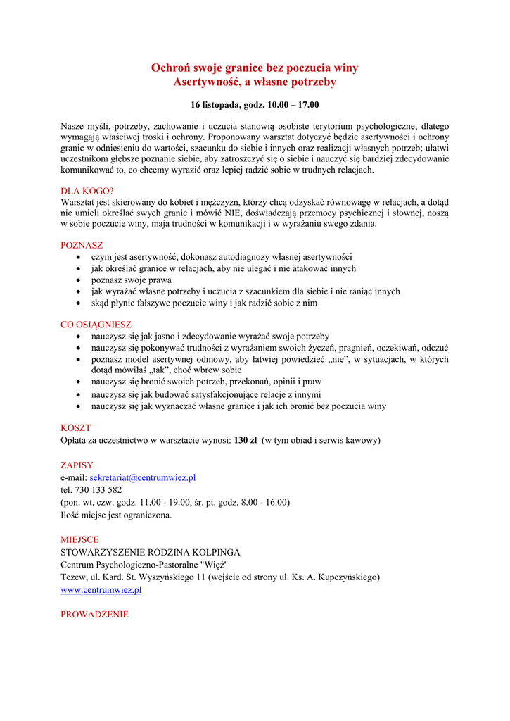 Ochroń swoje granice bez poczucia winy Asertywność, a własne potrzeby 16 listopada, godz. 10.00 – 17.00 Nasze myśli, potrzeby, zachowanie i uczucia stanowią osobiste terytorium psychologiczne, dlatego wymagają właściwej troski i ochrony. Proponowany warsztat dotyczyć będzie asertywności i ochrony granic w odniesieniu do wartości, szacunku do siebie i innych oraz realizacji własnych potrzeb; ułatwi uczestnikom głębsze poznanie siebie, aby zatroszczyć się o siebie i nauczyć się bardziej zdecydowanie komunikować to, co chcemy wyrazić oraz lepiej radzić sobie w trudnych relacjach. DLA KOGO? Warsztat jest skierowany do kobiet i mężczyzn, którzy chcą odzyskać równowagę w relacjach, a dotąd nie umieli określać swych granic i mówić NIE, doświadczają przemocy psychicznej i słownej, noszą w sobie poczucie winy, maja trudności w komunikacji i w wyrażaniu swego zdania. POZNASZ czym jest asertywność, dokonasz autodiagnozy własnej asertywności jak określać granice w relacjach, aby nie ulegać i nie atakować innych poznasz swoje prawa jak wyrażać własne potrzeby i uczucia z szacunkiem dla siebie i nie raniąc innych skąd płynie fałszywe poczucie winy i jak radzić sobie z nim CO OSIĄGNIESZ nauczysz się jak jasno i zdecydowanie wyrażać swoje potrzeby nauczysz się pokonywać trudności z wyrażaniem swoich życzeń, pragnień, oczekiwań, odczuć poznasz model asertywnej odmowy, aby łatwiej powiedzieć „nie”, w sytuacjach, w których dotąd mówiłaś „tak”, choć wbrew sobie nauczysz się bronić swoich potrzeb, przekonań, opinii i praw nauczysz się jak budować satysfakcjonujące relacje z innymi nauczysz się jak wyznaczać własne granice i jak ich bronić bez poczucia winy KOSZT Opłata za uczestnictwo w warsztacie wynosi: 130 zł (w tym obiad i serwis kawowy) ZAPISY e-mail: [email protected] tel. 730 133 582 (pon. wt. czw. godz. 11.00 - 19.00, śr. pt. godz. 8.00 - 16.00) Ilość miejsc jest ograniczona. MIEJSCE STOWARZYSZENIE RODZINA KOLPINGA Centrum Psychologiczno-Pastoralne "Więź" Tczew, ul. Kard. St. Wyszyńskiego 11 (wejście od strony ul. Ks. A. Kupczyńskiego) www.centrumwiez.pl PROWADZENIE IRENA NEUMUELER - teolog, pedagog, trener rozwoju osobistego, doradca - coach. Ukończyła studia doktoranckie na UKSW w Warszawie na Wydziale Teologicznym; szkolenie „Coaching i nowe możliwości”. Ma wieloletnie doświadczenie pracy edukacyjnej jako nauczyciel dyplomowany (1993 – 2012). Od czerwca 2005 r. jest pomysłodawczynią i autorką programu kobiecych spotkań pod nazwą Status Feminae, na których podejmowane są zagadnienia z psychologii, filozofii i duchowości kobiety. Od czerwca 2011 r. jest prezesem Fundacji „Status Feminae”. Towarzyszy kobietom w odkrywaniu piękna kobiecości, ucząc jak żyć w harmonii wewnętrznej ze sobą i innymi, w poczuciu wartości i godności, aby cieszyć się życiem w pełni. Prowadzi konferencje, sesje tematyczne, szkolenia, warsztaty rozwoju osobistego. Od 2007 r. jest wykładowcą w Gdyńskim Uniwersytecie Trzeciego Wieku w Gdyni i w Centrum Kształceni Ustawicznego w Sopocie (prowadzi zajęcia według autorskiego programu). Od listopada 2012 r. jest właścicielką firmy szkoleniowej InSpe INSPIRACJA I ROZWÓJ. Ma doświadczenie pozyskiwania środków publicznych i zarządzania projektami rozwojowymi. Koordynowała projekty: Myśleć i działać konstruktywnie; Obudź w sobie siłę, by lepiej żyć. Mieszka w Gdyni. Interesuje ją człowiek, procesy w nim zachodzące oraz wymiar wewnętrzny; psychologia, dobry film, lubi czytać, przebywać nad morzem, lubi dobrą kuchnię.