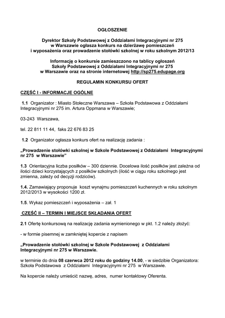 OGŁOSZENIE Dyrektor Szkoły Podstawowej z Oddziałami Integracyjnymi nr 275 w Warszawie ogłasza konkurs na dzierżawę pomieszczeń i wyposażenia oraz prowadzenie stołówki szkolnej w roku szkolnym 2012/13 Informację o konkursie zamieszczono na tablicy ogłoszeń Szkoły Podstawowej z Oddziałami Integracyjnymi nr 275 w Warszawie oraz na stronie internetowej http://sp275.edupage.org REGULAMIN KONKURSU OFERT CZĘŚĆ I - INFORMACJE OGÓLNE 1.1 Organizator : Miasto Stołeczne Warszawa – Szkoła Podstawowa z Oddziałami Integracyjnymi nr 275 im. Artura Oppmana w Warszawie; 03-243 Warszawa, tel. 22 811 11 44, faks 22 676 83 25 1.2 Organizator ogłasza konkurs ofert na realizację zadania : „Prowadzenie stołówki szkolnej w Szkole Podstawowej z Oddziałami Integracyjnymi nr 275 w Warszawie” 1.3 Orientacyjna liczba posiłków – 300 dziennie. Docelowa ilość posiłków jest zależna od ilości dzieci korzystających z posiłków szkolnych (ilość w ciągu roku szkolnego jest zmienna, zależy od decyzji rodziców). 1.4. Zamawiający proponuje koszt wynajmu pomieszczeń kuchennych w roku szkolnym 2012/2013 w wysokości 1200 zł. 1.5. Wykaz pomieszczeń i wyposażenia – zał. 1 CZĘŚĆ II – TERMIN I MIEJSCE SKŁADANIA OFERT 2.1 Ofertę konkursową na realizację zadania wymienionego w pkt. 1.2 należy złożyć: - w formie pisemnej w zamkniętej kopercie z napisem „Prowadzenie stołówki szkolnej w Szkole Podstawowej z Oddziałami Integracyjnymi nr 275 w Warszawie. w terminie do dnia 08 czerwca 2012 roku do godziny 14.00, - w siedzibie Organizatora: Szkoła Podstawowa z Oddziałami Integracyjnymi nr 275 w Warszawie. Na kopercie należy umieścić nazwę, adres, numer kontaktowy Oferenta. Potwierdzeniem złożenia oferty będzie oznakowanie jej podczas składania w sekretariacie szkoły, polegające na odnotowaniu na kopercie terminu jej złożenia (dzień, godzina) Oferty złożone po terminie określonym w pkt. 2.1 nie będą rozpatrywane. 2.2 Otwarcie kopert z ofertami oraz rozpatrzenie ofert przez Komisję Konkursową nastąpi dnia 12 czerwca 2012 roku o godzinie 15.00 w siedzibie Organizatora konkursu. 2.3 Konkurs uważa się za ważny jeśli wpłyną przynajmniej dwie oferty spełniające wymagania niniejszego konkursu. 2.4 Wybrany w drodze konkursu Oferent będzie zobowiązany do podpisania w siedzibie Organizatora konkursu Umowy Najmu. CZĘŚĆ III – WARUNKI WYMAGANE OD OFERENTÓW 3.1 Po wynajęciu od szkoły pomieszczeń kuchni Oferent zobowiązany będzie do prowadzenia żywienia na następujących zasadach: codzienne przygotowywanie i wydawanie posiłków w wynajętych pomieszczeniach kuchni, oraz w części przeznaczonej dla oddziałów przedszkolnych obiady dwudaniowe będą przygotowywane dla uczniów Szkoły Podstawowej z Oddziałami Integracyjnymi nr 275 w Warszawie oraz pracowników szkoły, Oferent zapewnia możliwość zakupu jednego dania dla uczniów, których obiady finansowane są przez OPS Oferent będzie prowadził stosowne rozliczenia finansowe z OPS-ami, śniadania i podwieczorki przygotowywane będą dla uczniów oddziałów przedszkolnych zgodnie z życzeniami rodziców posiłki dla dzieci z oddziałów przedszkolnych dowożone będą na wózku kelnerskim z użyciem wewnętrznej platformy przyschodowej i wydawane w salach przedszkolnych (w tej części szkoły znajdują się: wydawalnia posiłków i zmywalnia) przygotowywanie posiłków będzie zgodne z zasadami racjonalnego żywienia, sporządzane z pełnowartościowych produktów posiadających aktualne terminy ważności, spełniających obowiązujące normy żywienia dzieci i młodzieży, oraz systemu HACCP dla posiłków szkolnych, tygodniowe jadłospisy będą wywieszane w stołówce szkolnej oraz przedkładane dyrektorowi szkoły wraz z kalorycznością i wyszczególnieniem składników odżywczych, ceny obiadów na okres każdego roku szkolnego do dnia 31 sierpnia uzgadniane będą z dyrektorem szkoły. Akceptacja ceny przedstawiana będzie na piśmie. Brak powyższej akceptacji jest podstawą rozwiązania umowy, utrzymywanie czystości i porządku na terenie kuchni zgodnie z wymogami odpowiednich służb oraz zapewnienie czystości podczas przygotowywania posiłków, udostępnienie kuchni i stołówki na organizowanie szkolnych imprez okolicznościowych, przyjmowanie wpłat za wydawane posiłki, odliczanie opłat za dni, w których uczeń jest nieobecny pod warunkiem zgłoszenia tego faktu w tym samym dniu do godz.9.00. Oferent od dnia obowiązywania umowy najmu pokrywa wszelkie koszty utrzymania kuchni związane z jej funkcjonowaniem (w tym ze sprawnością urządzeń, przeglądami technicznymi, stanem technicznym pomieszczeń, zatrudnieniem pracowników, zakupem środków czystości, zakupem środków i produktów żywnościowych, utylizacją odpadów, zużyciem mediów), Oferent nie może podnająć innemu podmiotowi wynajmowanych pomieszczeń Zamawiający zastrzega sobie prawo bieżącej kontroli w zakresie przestrzegania przez Oferenta jakości wykonywanych usług. 3.2 Wydawanie obiadów uczniom i pracownikom będzie odbywać się od poniedziałku do piątku z wyłączeniem okresu przerw świątecznych, wakacji, ferii szkolnych i dni ustawowo wolnych od nauki, śniadania w godz. 8.30 – 9.00, obiady w godz. od 11:30 do 14:30. Podczas prowadzonej przez szkołę akcji „Lato w Mieście” lub „Zima w Mieście” oraz dyżurach wakacyjnych w oddziałach przedszkolnych Oferent zobowiązany będzie do przygotowywania posiłków dla uczniów biorących udział w akcjach. Wizji lokalnej pomieszczeń przeznaczonych do najmu Oferenci dokonają indywidualnie. CZĘŚĆ IV – TERMIN REALIZACJI UMOWY . Wymagany termin realizacji umowy: 01.09.2012 r. – 30.06.2013 r. CZĘŚĆ V – WARUNKI WYMAGANE OD OFERENTÓW I DOKUMENTY UWIARYGODNIAJĄCE 5.1. Oferent powinien legitymować się doświadczeniem w świadczeniu usług podobnych do przedmiotu konkursu, tj. prowadzenie stołówki dla dzieci 