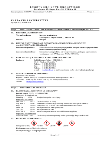 BENZYNY SILNIKOWE BEZOŁOWIOWE EuroSuper 95, Super Plus 98, VERVA 98 Data sporządzenia: 10.04.1998 / Data aktualizacji: 01.06.2015 Wersja: 1 KARTA CHARAKTERYSTYKI wg rozp. (UE) Nr 453/2010 Sekcja 1. 1.1. IDENTYFIKACJA SUBSTANCJI/MIESZANINY I IDENTYFIKACJA PRZEDSIĘBIORSTWA IDENTYFIKATOR PRODUKTU Nazwa handlowa Zawiera Benzyna bezołowiowa EuroSuper 95 Super Plus 98, , VERVA 98 Benzyna 1.2. ISTOTNE ZIDENTYFIKOWANE ZASTOSOWANIA SUBSTANCJI lub MIESZANINY oraz ZASTOSOWANIA ODRADZANE Zastosowanie produktu Paliwo do silników benzynowych pojazdów, których konstrukcja pozwala na stosowanie benzyny bezołowiowej. Zastosowania odradzane Inne zastosowania produktu, niż wyżej wymienione, podlegają ograniczeniom wynikającym z zał. XVII do rozp. WE Nr 1907/2006. 1.3. DANE DOTYCZĄCE DOSTAWCY KARTY CHARAKTERYSTYKI Producent Polski Koncern Naftowy ORLEN S.A. 09-411 Płock, ul. Chemików 7 Telefon: (+48 24) 365 00 00 Fax: (+48 24) 365 45 55 Telefon: (+48 24) 365 35 24 e-mail: [email protected] (e-mail kompetentnej osoby odpowiedzialnej za kartę) 1.4. NUMER TELEFONU ALARMOWEGO Zakładowa Straż Pożarna Krajowe Centrum Pomocy w Transporcie Materiałów Niebezpiecznych - SPOT - Telefony: (+48 24) 365 70 32 i (+48 24) 365 70 33 (całodobowo) - e-mail [email protected] Sekcja 2. IDENTYFIKACJA ZAGROŻEŃ 2.1. KLASYFIKACJA SUBSTANCJI lub MIESZANINY Zgodnie z rozp. WE Nr 1272/2008 (CLP) Zagrożenia fizykochemiczne Flam Liq. 1 H224 Skrajnie łatwopalna ciecz i pary. Zagrożenia dla zdrowia Skin Irrit. 2 H315 Działa drażniąco na skórę. Asp. Tox. 1 H304 Połknięcie i dostanie się przez drogi oddechowe może grozić śmiercią. Repr. 2 H361d Podejrzewa się, że działa szkodliwie na dziecko w łonie matki. Muta. 1B H340 Może powodować wady genetyczne. Carc. 1B H350 Może powodować raka. STOT SE 3 H336 Może wywoływać uczucie senności lub zawroty głowy. Zagrożenia dla środowiska Aquatic Chronic 2 H411 Działa toksycznie na organizmy wodne, powodując długotrwałe skutki. 2.2. ELEMENTY OZNAKOWANIA GHS07 Piktogram: GHS02 Hasło ostrzegawcze: Niebezpieczeństwo Zwroty wskazujące rodzaj zagrożenia GHS08 Strona 1 z 17 GHS09 BENZYNY SILNIKOWE BEZOŁOWIOWE EuroSuper 95, Super Plus 98, VERVA 98 Data sporządzenia: 10.04.1998 / Data aktualizacji: 01.06.2015 Wersja: 1 H315 Działa drażniąco na skórę. H304 Połknięcie i dostanie się przez drogi oddechowe może grozić śmiercią. H361d Podejrzewa się, że działa szkodliwie na dziecko w łonie matki. H340 Może powodować wady genetyczne. H350 Może powodować raka. H336 Może wywoływać uczucie senności lub zawroty głowy. H411 Działa toksycznie na organizmy wodne, powodując długotrwałe skutki. Zwroty wskazujące środki ostrożności: P201 Przed użyciem zapoznać się ze specjalnymi środkami ostrożności. P210 Przechowywać z dala od źródeł ciepła, gorących powierzchni, iskrzenia, otwartego ognia i innych źródeł zapłonu. Palenie wzbronione. P280 Stosować rękawice ochronne/odzież ochronną/ ochronę oczu/ ochronę twarzy. P301+P310 W PRZYPADKU POŁKNIĘCIA: Natychmiast skontaktować się z OŚRODKIEM ZATRUĆ/lekarzem P403+P233 Przechowywać w dobrze wentylowanym miejscu. Przechowywać pojemnik szczelnie zamknięty. P501 Zawartość/pojemnik usuwać do firm posiadających odpowiednie uprawnienia. 2.3. INNE ZAGROŻENIA Produkt o bardzo niskiej temperaturze zapłonu. Pary tworzą mieszaniny wybuchowe z powietrzem. Pary są cięższe od powietrza, rozprzestrzeniają się i gromadzą przy powierzchni ziemi, zagłębieniach terenu, w dolnych partiach pomieszczeń Zamknięte pojemniki narażone na działanie ognia lub wysokiej temperatury mogą wybuchać w wyniku wzrostu ciśnienia wewnątrz nich. Produkt lżejszy od wody i praktycznie nierozpuszczalny w wodzie, pływa na jej powierzchni stwarzając zagrożenie pożarowo-wybuchowe. Nie spełnia kryteriów PBT lub vPvB i nie jest uważana za PBT/vPvB zgodnie z załącznikiem XIII rozporządzenia REACH. Sekcja 3. SKŁAD/INFORMACJA O SKŁADNIKACH 3.1. SUBSTANCJE – nie dotyczy, produkt jest mieszaniną. 3.2. MIESZANINY Charakterystyka chemiczna Mieszanina benzyny (Niskowrzącej benzyny – niespecyfikowanej; Gazoliny) oraz organicznych związków tlenowych [biokomponentów, m.in. etanolu i eteru etylowo-tert-butylowego (ETBE)] i innych substancji pełniących funkcję dodatków uszlachetniających (max 1% obj.). Benzyna (Niskowrząca benzyna – niespecyfikowana; Gazolina) zawiera: do 1% benzenu [CAS: 71-43-2, WE: 200-753-7], < 3% n-heksanu [CAS: 110-54-3, WE: 203-777-6], ok. 6% toluenu [CAS: 108-88-3, WE: 203-6259]. Charakterystyka gatunków benzyn silnikowych bezołowiowych Benzyna bezołowiowa EuroSuper 95 (ES95) Benzyna bezołowiow EuroSuper 95 alkoholowo-eterowa (ES95 A-E) Benzyna bezołowiowa Super Plus (SP98E) Benzyna bezołowiowa Super Plus 98 alkoholowo-eterowa (SP98 A-E) Benzyna bezołowiowa bezsiarkowa 98 (Verva 98) Strona 2 z 17 nie zawiera biokomponentów. zawiera 0 - 5 % etanolu i 0 - 6 % ETBE zawiera 0 - 15 % ETBE zawiera 0 - 5 % etanolu i 0 - 6 % ETBE zawiera 0 - 15 % ETBE lub 0 - 5 % etanolu i 0 - 6 % ETBE BENZYNY SILNIKOWE BEZOŁOWIOWE EuroSuper 95, Super Plus 98, VERVA 98 Data sporządzenia: 10.04.1998 / Data aktualizacji: 01.06.2015 Wersja: 1 SKŁADNIKI NIEBEZPIECZNE Numery identyfikujące składnik Nazwa składnika % (m/m) Klasyfikacja CAS: 86290-81-5 WE: 289-220-8 Indeksowy: 649-378-00-4 Rejestracji: 01-2119471335-39-0039 Benzyna ; Niskowrząca do 100 Flam. Liq. 1, H224 Carc. 1B, H350 ; Muta. 1B, H340 ; Repr. 2, H361d; benzyna - niespecyfikowana Asp. Tox. 1, H304 Skin Irrit. 2, H315 ; STOT SE 3, H336 Aquatic Chronic 2, H411 CAS: 637-92-3 WE: 211-309-7 Indeksowy: -Rejestracji: 01-211945278529-0003 Eter etylowo-tert-butylowy (ETBE) **/ Flam. Liq. 2, H225 STOT SE 3, H336 CAS: 64-17-5 WE: 200-578-6 Indeksowy: 603-002-00-5 Rejestracji: 012119457610-43- xxxx Etanol **/ Flam. Liq. 2, H225 */ Niedostępny w dniu opracowania karty. **/ Zawartość składnika zgodna