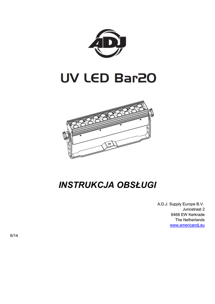 INSTRUKCJA OBSŁUGI A.D.J. Supply Europe B.V. Junostraat 2 6468 EW Kerkrade The Netherlands www.americandj.eu 6/14 ©2013 ADJ Products, LLC wszystkie prawa zastrzeżone. Informacje, specyfikacje, rysunki, zdjęcia oraz instrukcje zawarte w niniejszej instrukcji mogą ulec zmianie bez wcześniejszego powiadomienia. Produkty marki ADJ, logo LLC oraz nazwy i numery identyfikujące produkty opisane w niniejszym dokumencie stanowią znak handlowy ADJ Products, LLC. Zgłoszona ochrona praw autorskich obejmuje wszelkie formy i wszelkie kwestie dotyczące materiałów i informacji podlegających ochronie prawem autorskim, dozwolone obecnie przez obowiązujące ustawy bądź rozstrzygnięcia sądowe. Nazwy produktów użyte w niniejszym dokumencie mogą stanowić znaki towarowe bądź zarejestrowane znaki towarowe produkujących je spółek i zostają niniejszym prawnie uznane. Wszelkie marki oraz nazwy produktów nie pochodzące od ADJ Products, LLC, stanowią znaki towarowe lub zarejestrowane znaki towarowe odpowiednich, produkujących je spółek. ADJ Products, LLC oraz wszystkie powiązane z nią spółki wyłączają niniejszym wszelką swoją odpowiedzialność za szkody we własności, sprzęcie, budynkach lub szkody elektryczne, za obrażenia poniesione przez jakiekolwiek osoby, jak też za bezpośrednie lub pośrednie straty ekonomiczne związane z lub zależne od użycia jakichkolwiek informacji zawartych w niniejszym dokumencie, oraz/lub wynikłe z niewłaściwego, niebezpiecznego, niepełnego lub niestarannego montażu, instalacji, konfiguracji osprzętu oraz działania opisanych tutaj produktów. A.D.J. Supply Europe B.V. - www.americandj.eu - UV LED Bar 20 Podręcznik Użytkownika 2 Spis treści WSTĘP ..................................................................................................................................................................................... 4 INSTRUKCJE OGÓLNE .............................................................................................................................................................. 4 CHARAKTERYSTYKA ................................................................................................................................................................. 4 CZYSZCZENIE ........................................................................................................................................................................... 4 ŚRODKI BEZPIECZEŃSTWA ...................................................................................................................................................... 4 USTAWIENIA ........................................................................................................................................................................... 5 OBSŁUGA URZĄDZENIA........................................................................................................................................................... 6 PILOT ZDALNEGO STEROWANIA ............................................................................................................................................. 7 KONFIGURACJA MASTER-SLAVE ............................................................................................................................................. 7 1 KANAŁOWY .......................................................................................................................................................................... 8 2 KANAŁOWY .......................................................................................................................................................................... 8 3 KANAŁOWY .......................................................................................................................................................................... 8 WYKRES KRZYWEJ DIMERA ..................................................................................................................................................... 9 POŁĄCZENIE SZEREGOWE ....................................................................................................................................................... 9 WYMIANA BEZPIECZNIKA ....................................................................................................................................................... 9 ROZWIĄZYWANIE PROBLEMÓW ............................................................................................................................................ 9 SPECYFIKACJE ........................................................................................................................................................................ 10 ROHS - Ważny wkład w ochronę środowiska ....................................................................................................................... 11 WEEE – Utylizacja odpadów elektrycznych i elektronicznych .............................................................................................. 11 A.D.J. Supply Europe B.V. - www.americandj.eu - UV LED Bar 20 Podręcznik Użytkownika 3 INOZIONE WSTĘP Wypakowanie: Dziękujemy za zakup UV LED Bar 20 firmy ADJ Products, LLC. Każdy egzemplarz UV LED Bar 20 Canon został gruntownie przetestowany i wysłany do klientów w idealnym stanie technicznym. Należy dokładnie sprawdzić czy opakowanie nie posiada uszkodzeń powstałych w czasie transportu. Jeżeli opakowanie nosi ślady uszkodzeń, należy sprawdzić czy urządzenie nie jest uszkodzone oraz upewnić się czy towarzyszące mu wyposażenie konieczne do jego eksploatacji dotarło w stanie nienaruszonym. W razie stwierdzenia uszkodzeń lub braku części, należy skontaktować się z wsparciem klienta poprzez nasz bezpłatny numer. Prosimy o taki kontakt przed podjęciem decyzji o zwrocie urządzenia do sprzedawcy. WSTĘP Urządzenie UV LED Bar 20 jest kontynuacją wysił