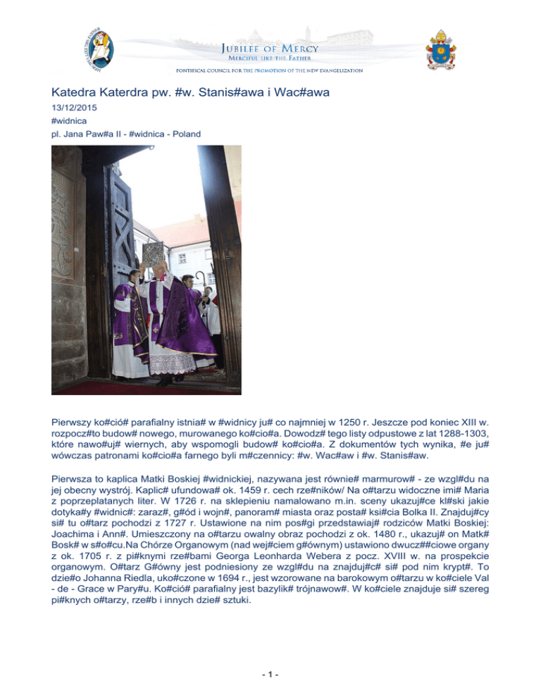 Katedra Katerdra pw. #w. Stanis#awa i Wac#awa 13/12/2015 #widnica pl. Jana Paw#a II - #widnica - Poland Pierwszy ko#ció# parafialny istnia# w #widnicy ju# co najmniej w 1250 r. Jeszcze pod koniec XIII w. rozpocz#to budow# nowego, murowanego ko#cio#a. Dowodz# tego listy odpustowe z lat 1288-1303, które nawo#uj# wiernych, aby wspomogli budow# ko#cio#a. Z dokumentów tych wynika, #e ju# wówczas patronami ko#cio#a farnego byli m#czennicy: #w. Wac#aw i #w. Stanis#aw. Pierwsza to kaplica Matki Boskiej #widnickiej, nazywana jest równie# marmurow# - ze wzgl#du na jej obecny wystrój. Kaplic# ufundowa# ok. 1459 r. cech rze#ników/ Na o#tarzu widoczne imi# Maria z poprzeplatanych liter. W 1726 r. na sklepieniu namalowano m.in. sceny ukazuj#ce kl#ski jakie dotyka#y #widnic#: zaraz#, g#ód i wojn#, panoram# miasta oraz posta# ksi#cia Bolka II. Znajduj#cy si# tu o#tarz pochodzi z 1727 r. Ustawione na nim pos#gi przedstawiaj# rodziców Matki Boskiej: Joachima i Ann#. Umieszczony na o#tarzu owalny obraz pochodzi z ok. 1480 r., ukazuj# on Matk# Bosk# w s#o#cu.Na Chórze Organowym (nad wej#ciem g#ównym) ustawiono dwucz##ciowe organy z ok. 1705 r. z pi#knymi rze#bami Georga Leonharda Webera z pocz. XVIII w. na prospekcie organowym. O#tarz G#ówny jest podniesiony ze wzgl#du na znajduj#c# si# pod nim krypt#. To dzie#o Johanna Riedla, uko#czone w 1694 r., jest wzorowane na barokowym o#tarzu w ko#ciele Val - de - Grace w Pary#u. Ko#ció# parafialny jest bazylik# trójnawow#. W ko#ciele znajduje si# szereg pi#knych o#tarzy, rze#b i innych dzie# sztuki. -1-