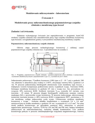 Modelowanie mikrosystemów - laboratorium Ćwiczenie 2 Modelowanie pracy mikromechanicznego pojemnościowego czujnika ciśnienia z membraną typu bossed Zadania i cel ćwiczenia. Zadaniem wykonującego ćwiczenie jest zaprojektowanie w programie AutoCAD struktury czujnika ciśnienia oraz zamodelowanie pracy tego czujnika (membrany krzemowej typu bossed) z uwzględnieniem granicy wytrzymałości mechanicznej membrany czujnika. Pojemnościowy mikromechaniczny czujnik ciśnienia Główne etapy procesu technologicznego krzemowej i pojemnościowego czujnika ciśnienia (rys. 1) przedstawiono na rysunku 2. szklanej części Rys. 1. Względny, pojemnościowy czujnik ciśnienia - przekrój poprzeczny przez strukturę z zaznaczonymi wymiarami charakterystycznymi i pojemnościami CP(p) i CC, (rysunek nie jest w skali) Jednostronnie polerowane, 3”podłoże krzemowe (100) typu n (2 - 10 Ωcm) o grubości 380 µm, utleniono w atmosferze pary wodnej w 1150oC, otrzymując warstwę SiO2 o grubości 1,6 µm. W procesie jednostronnej fotolitografii uformowano wzór membrany typu bossed, z trójkątnym wzorem kompensacji podtrawienia naroży wypukłych wyspy. Trawienie EMSi, formujące membranę krzemowe (o grubości 65 µm) z wyspą (rys. 2a), prowadzono we wrzącym 30% roztworze KOH. Szybkość trawienia V(100) wynosiła 6,8 µm/min, czas trawienia - 45 minut. W procesie drugiej fotolitografii, selektywnie usunięto warstwę maskująca SiO2 z powierzchni wyspy krzemowej. W procesie tradycyjnego, aktywowanego termicznie trawienia krzemu w 40% roztworze KOH o temperaturze 80oC, pocieniano o 15 µm membranę, cofając jednocześnie czoło wyspy. Uformowano strukturę membrany krzemowej z wyspą – ruchomą okładkę kondensatora o wymiarach 2,6 x 2,6 mm2 umiejscowioną na środku membrany o grubości 50 µm i wymiarach 6,5 x 6,5 mm2. Na tylną stronę podłoża krzemowego, po uprzednim usunięciu SiO2, naniesiono w procesie naparowania próżniowego, warstwę Ti/Ni/Au (20 nm/100 nm/100 nm), będącą kontaktem elektrycznym do mikromechanicznej, ruchomej okładki kondensatora. Lico podłoża krzemowego pokryto w procesie zmiennoprądowego rozpylania magnetronowego, warstwą ___________________________________________________________________________ www.memslab.pl SiO2 o grubości 0,3 µm. W kolejnym kroku technologicznym, 3” podłoże krzemowo podzielono na pojedyncze struktury krzemowe (rys. 2b). Podłoże szklane (Borofloat 3.3) o średnicy 3” i grubości 2 mm, po uprzednim oczyszczeniu, pokryto, w procesie naparowania próżniowego, warstwą Cr/Au (100 nm/100 nm). W procesie fotolitografii, prowadzonej na pokrytej metaliczną warstwą stronie podłoża, uformowano kształt dolnej, nieruchomej okładki kondensatora o wymiarach 5 x 5 mm2 i wyprowadzenia elektryczne tej okładki do pola kontaktowego. Następnie, stosując szybkoobrotowa wiertarkę (20000 obr/min) i wiertło pokryte SiC, wykonano w szkle, obok okładki kondensatora, otwór o średnicy 0,8 mm. Po umyciu podłoża szklanego, pocięto je za pomocą piły diamentowej, na pojedyncze struktury szklane o wymiarach 11 x 13 mm2 (rys. 2b). Łączenie struktury krzemowej i szklanej, poprzedzone procedurami odtłuszczania i hydrofilizacji powierzchni tych struktur, prowadzono w procesie selektywnego bondingu anodowego w temperaturze 450oC i napięciu 1,5 kV przez 30 minut, za pomocą odpowiednio uformowanej metalowej katody. Krzemowo-szklaną strukturę czujnika (rys. 2c) zamontowano w plastikowej obudowie. W procesie termokompresji wykonywano drutowe połączenia pomiędzy polami kontaktowymi struktury czujnika a wyprowadzeniami obudowy, a następnie, zamknięto obudowę (rys. 2d). Rys. 2. Technologia (flow chart) krzemowo-szklanego, pojemnościowego czujnika ciśnienia Widok komponentów czujnika oraz struktura po montażu w plastikowej obudowie przedstawiono na rysunku 3. ___________________________________________________________________________ www.memslab.pl a) c) b) d) Rys. 3. Krzemowo-szklany, pojemnościowy czujnik ciśnienia: a) fragment 3” podłoża krzemowego po trawieniu EMSi, b) pojedyncza struktura krzemowa (po lewej) i szklana (po prawej), c) struktura czujnika po procesie bondingu anodowego części krzemowej i szklanej, d) czujnik w plastikowej obudowie Wyznaczono charakterystykę wyjściową czujnika - zależności pojemności czujnika od różnicowego ciśnienia (C=f(p)). W zastosowanym układzie pomiarowym wykorzystano zadajnik ciśnienia (typ ZC-1). Ciśnieniem referencyjnym dla czujnika było ciśnienie atmosferyczne. Wyprowadzenia elektryczne czujnika podłączono przewodami, o łącznej pojemności ~35 pF (odejmowanej od wskazań miernika), do uniwersalnego miernika Metex 3640D o zakresie pomiarowym pojemności od 20 pF do 2 µF z dokładnością 3%. Charakterystykę wyjściową czujnika zmierzono w zakresie różnicowych ciśnień od 0 kPa do 40 kPa i porównano z teoretyczną krzywą, wyznaczoną jako suma pojemności CC i CP(p) (rys. 4). Rys. 4. Krzemowo-szklany, pojemnościowy czujnik ciśnienia: charakterystyka wyjściowa – pojemność czujnika C w zależności od przyłożonego ciśnienia różnicowego p ___________________________________________________________________________ www.memslab.pl Przebieg ćwiczenia Ćwiczenie składa się z czterech etapów: • etap 1 – zaprojektowanie struktury czujnika ciśnienia w programie AutoCAD, • etap 2 – wstępne zamodelowanie zaprojektowanej struktury w programie Comsol Multiphysics, • etap 3 – określenie granicznych parametrów pracy membrany typu bossed – naprężenia i ciśnienia • etap 4 - obliczenie pojemności kondensatora o zmiennej pojemności C, wyznaczenie zależności C w funkcji ciśnienia działającego na membrane czujnika, prezentacja wyników. 1. Projekt AutoCAD. W projekcie AutoCAD mikromechanicznego czujnika ciśnienia należy zatem przyjąć, że: • struktura czujnika wykonana jest w podłoży krzemowym o orientacji krystalograficznej (