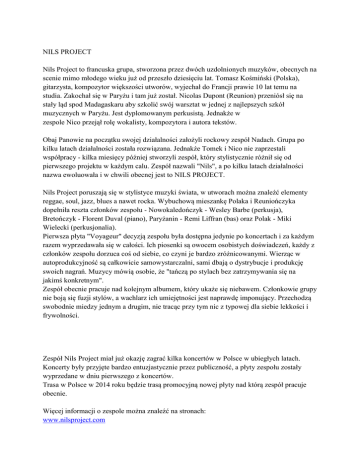 NILS PROJECT Nils Project to francuska grupa, stworzona przez dwóch uzdolnionych muzyków, obecnych na scenie mimo młodego wieku już od przeszło dziesięciu lat. Tomasz Kośmiński (Polska), gitarzysta, kompozytor większości utworów, wyjechał do Francji prawie 10 lat temu na studia. Zakochał się w Paryżu i tam już został. Nicolas Dupont (Reunion) przeniósł się na stały ląd spod Madagaskaru aby szkolić swój warsztat w jednej z najlepszych szkół muzycznych w Paryżu. Jest dyplomowanym perkusistą. Jednakże w zespole Nico przejął rolę wokalisty, kompozytora i autora tekstów. Obaj Panowie na początku swojej działalności założyli rockowy zespół Nadach. Grupa po kilku latach działalności została rozwiązana. Jednakże Tomek i Nico nie zaprzestali współpracy - kilka miesięcy później stworzyli zespół, który stylistycznie różnił się od pierwszego projektu w każdym calu. Zespół nazwali "Nils", a po kilku latach działalności nazwa ewoluowała i w chwili obecnej jest to NILS PROJECT. Nils Project poruszają się w stylistyce muzyki świata, w utworach można znaleźć elementy reggae, soul, jazz, blues a nawet rocka. Wybuchową mieszankę Polaka i Reuniończyka dopełniła reszta członków zespołu - Nowokaledończyk - Wesley Barbe (perkusja), Bretończyk - Florent Duval (piano), Paryżanin - Remi Liffran (bas) oraz Polak - Miki Wielecki (perkusjonalia). Pierwsza płyta "Voyageur" decyzją zespołu była dostępna jedynie po koncertach i za każdym razem wyprzedawała się w całości. Ich piosenki są owocem osobistych doświadczeń, każdy z członków zespołu dorzuca coś od siebie, co czyni je bardzo zróżnicowanymi. Wierząc w autoprodukcyjność są całkowicie samowystarczalni, sami dbają o dystrybucje i produkcję swoich nagrań. Muzycy mówią osobie, że "tańczą po stylach bez zatrzymywania się na jakimś konkretnym". Zespół obecnie pracuje nad kolejnym albumem, który ukaże się niebawem. Członkowie grupy nie boją się fuzji stylów, a wachlarz ich umiejętności jest naprawdę imponujący. Przechodzą swobodnie miedzy jednym a drugim, nie tracąc przy tym nic z typowej dla siebie lekkości i frywolności. Zespół Nils Project miał już okazję zagrać kilka koncertów w Polsce w ubiegłych latach. Koncerty były przyjęte bardzo entuzjastycznie przez publiczność, a płyty zespołu zostały wyprzedane w dniu pierwszego z koncertów. Trasa w Polsce w 2014 roku będzie trasą promocyjną nowej płyty nad którą zespół pracuje obecnie. Więcej informacji o zespole można znaleźć na stronach: www.nilsproject.com www.facebook.com/nilsproject Przesyłam również linki do wybranych utworów/występów zespołu: http://youtu.be/77JjCm85mJM http://youtu.be/z4JzFDXNvkU http://www.youtube.com/watch?v=CqIWxLgEtH8