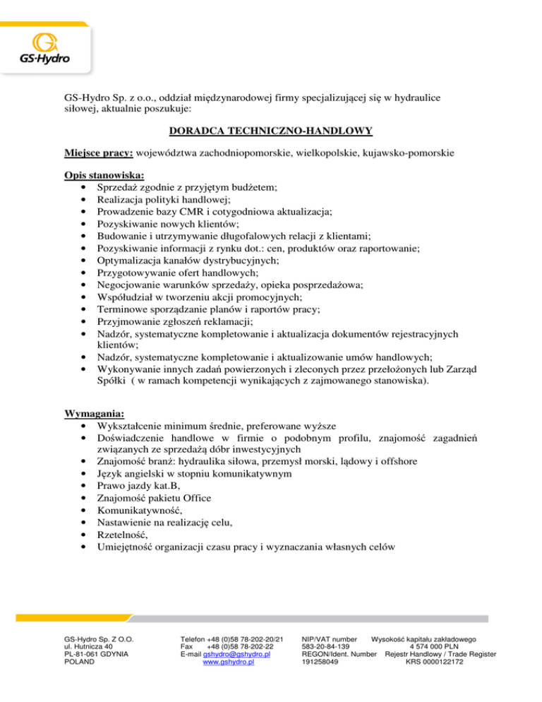 GS-Hydro Sp. z o.o., oddział międzynarodowej firmy specjalizującej się w hydraulice siłowej, aktualnie poszukuje: DORADCA TECHNICZNO-HANDLOWY Miejsce pracy: województwa zachodniopomorskie, wielkopolskie, kujawsko-pomorskie Opis stanowiska: • Sprzedaż zgodnie z przyjętym budżetem; • Realizacja polityki handlowej; • Prowadzenie bazy CMR i cotygodniowa aktualizacja; • Pozyskiwanie nowych klientów; • Budowanie i utrzymywanie długofalowych relacji z klientami; • Pozyskiwanie informacji z rynku dot.: cen, produktów oraz raportowanie; • Optymalizacja kanałów dystrybucyjnych; • Przygotowywanie ofert handlowych; • Negocjowanie warunków sprzedaży, opieka posprzedażowa; • Współudział w tworzeniu akcji promocyjnych; • Terminowe sporządzanie planów i raportów pracy; • Przyjmowanie zgłoszeń reklamacji; • Nadzór, systematyczne kompletowanie i aktualizacja dokumentów rejestracyjnych klientów; • Nadzór, systematyczne kompletowanie i aktualizowanie umów handlowych; • Wykonywanie innych zadań powierzonych i zleconych przez przełożonych lub Zarząd Spółki ( w ramach kompetencji wynikających z zajmowanego stanowiska). Wymagania: • Wykształcenie minimum średnie, preferowane wyższe • Doświadczenie handlowe w firmie o podobnym profilu, znajomość zagadnień związanych ze sprzedażą dóbr inwestycyjnych • Znajomość branż: hydraulika siłowa, przemysł morski, lądowy i offshore • Język angielski w stopniu komunikatywnym • Prawo jazdy kat.B, • Znajomość pakietu Office • Komunikatywność, • Nastawienie na realizację celu, • Rzetelność, • Umiejętność organizacji czasu pracy i wyznaczania własnych celów GS-Hydro Sp. Z O.O. ul. Hutnicza 40 PL-81-061 GDYNIA POLAND Telefon +48 (0)58 78-202-20/21 Fax +48 (0)58 78-202-22 E-mail [email protected] www.gshydro.pl NIP/VAT number Wysokość kapitału zakładowego 583-20-84-139 4 574 000 PLN REGON/Ident. Number Rejestr Handlowy / Trade Register 191258049 KRS 0000122172 Oferujemy: • Narzędzia niezbędne do wykonywania obowiązków: telefon, samochód służbowy, laptop • Umowa o pracę (3-miesięczny okres próbny) • Prywatne ubezpieczenie zdrowotne • Możliwości rozwoju zawodowego Forma kontaktu: Osoby zainteresowane prosimy o przesyłanie CV oraz listu motywacyjnego wraz z klauzulą o ochronie danych osobowych na adres: [email protected] (w tytule prosimy wpisać nazwę stanowiska). Uprzejmie informujemy, że skontaktujemy się jedynie z wybranymi kandydatami. GS-Hydro Sp. Z O.O. ul. Hutnicza 40 PL-81-061 GDYNIA POLAND Telefon +48 (0)58 78-202-20/21 Fax +48 (0)58 78-202-22 E-mail [email protected] www.gshydro.pl NIP/VAT number Wysokość kapitału zakładowego 583-20-84-139 4 574 000 PLN REGON/Ident. Number Rejestr Handlowy / Trade Register 191258049 KRS 0000122172