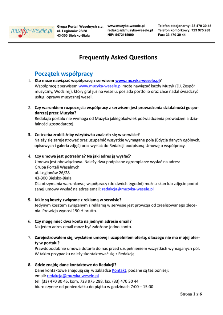 Grupa Portali Weselnych s.c. ul. Legionów 26/28 43-300 Bielsko-Biała www.muzyka-wesele.pl [email protected] NIP: 5472115090 Telefon stacjonarny: 33 470 30 45 Telefon komórkowy: 723 975 288 Fax: 33 470 30 44 Frequently Asked Questions Początek współpracy 1. Kto może nawiązać współpracę z serwisem www.muzyka-wesele.pl? Współpracę z serwisem www.muzyka-wesele.pl może nawiązać każdy Muzyk (DJ, Zespół muzyczny, Wodzirej), który grał już na weselu, posiada portfolio oraz chce nadal świadczyć usługi oprawy muzycznej wesel. 2. Czy warunkiem rozpoczęcia współpracy z serwisem jest prowadzenia działalności gospodarczej przez Muzyka? Redakcja portalu nie wymaga od Muzyka jakiegokolwiek poświadczenia prowadzenia działalności gospodarczej. 3. Co trzeba zrobić żeby wizytówka znalazła się w serwisie? Należy się zarejestrować oraz uzupełnić wszystkie wymagane pola (Edycja danych ogólnych, opisowych i galeria zdjęć) oraz wysłać do Redakcji podpisaną Umowę o współpracy. 4. Czy umowa jest potrzebna? Na jaki adres ją wysłać? Umowa jest obowiązkowa. Należy dwa podpisane egzemplarze wysłać na adres: Grupa Portali Weselnych ul. Legionów 26/28 43-300 Bielsko-Biała Dla otrzymania warunkowej współpracy (do dwóch tygodni) można skan lub zdjęcie podpisanej umowy wysłać na adres email: [email protected] 5. Jakie są koszty związane z reklamą w serwisie? Jedynym kosztem związanym z reklamą w serwisie jest prowizja od zrealizowanego zlecenia. Prowizja wynosi 150 zł brutto. 6. Czy mogę mieć dwa konta na jednym adresie email? Na jeden adres email może być założone jedno konto. 7. Zarejestrowałem się, wysłałem umowę i uzupełniłem ofertę, dlaczego nie ma mojej oferty w portalu? Prawdopodobnie umowa dotarła do nas przed uzupełnieniem wszystkich wymaganych pól. W takim przypadku należy skontaktować się z Redakcją. 8. Gdzie znajdę dane kontaktowe do Redakcji? Dane kontaktowe znajdują się w zakładce Kontakt, podane są też poniżej: email: [email protected] tel. (33) 470 30 45, kom. 723 975 288, fax. (33) 470 30 44 biuro czynne od poniedziałku do piątku w godzinach 7:00 – 15:00 Strona 1 z 6 Grupa Portali Weselnych s.c. ul. Legionów 26/28 43-300 Bielsko-Biała www.muzyka-wesele.pl [email protected] NIP: 5472115090 Telefon stacjonarny: 33 470 30 45 Telefon komórkowy: 723 975 288 Fax: 33 470 30 44 Edycja informacji 1. Czy są ograniczenia co do długość tekstu i ilości dodawanych zdjęć? Poza ilością zdjęć i filmów (min.3 – max. 12) nie ma ograniczeń co do ilości zawartych informacji. 2. Jakie parametry plików obowiązują przy wgrywaniu ich do oferty? Zdjęcia mogą być wgrywane w proporcjach 3x2 lub 2x3 (idealne proporcje to 440x660 px i/lub 660x440 px), w formacie JPG, GIF lub PNG (bez ramek, logo, podpisów). Filmy mogą być wgrywane w formacie avi, mpg, mpeg, wmv, asf, mp4, 3gp. Maksymalna wielkość pliku to 256 MB. 3. Czy mogę zamieścić wszystkie informacje o swojej działalności w wizytówce? W wizytówce mogą znajdować się informacje o świadczonych usługach oprawy muzycznej wesel poza danymi kontaktowymi umożliwiającymi identyfikację Muzyka. Niedopuszczalne dane to min.: Nazwisko, adres, numer telefonu, adres email, adres strony www, numery komunikatorów, logo, nazwa firmy itp. 4. Co to jest cena usługi standardowej i czy mogę to edytować? Cena usługi standardowej to cena za identyczny pakiet usług wyceniany przez każdego Muzyka w serwisie. Nie można zmienić pakietu usługi standardowej. Ma on na celu umożliwienie Parze Młodej szybkiego porównania cen usług poszczególnych Muzyków z danego miasta/województwa. Każdy Muzyk może dodać także swoje pakiety usług z dokładnym ich opisem i ceną. Pakiety takie można dodać w zakładce Oferty niestandardowe 5. Czy mogę aktualizować wizytówkę w późniejszym czasie i czy to jest płatne? Aktualizacji oferty można dokonywać bezpłatnie przez cały okres współpracy. 6. Nie pamiętam hasła. Jak mogę je odzyskać? Hasło można odzyskać korzystając z opcji Przypomnienie hasła lub kontaktując się z Redakcją. Zbieranie poleceń, kontakt z Parą Młodą 1. W jaki sposób kontaktuje się ze mną Para Młoda (brak danych kontaktowych)? Para Młoda kontaktuje się z Państwem poprzez formularz kontaktowy znajdujący się w Państwa ofercie. Strona 2 z 6 Grupa Portali Weselnych s.c. ul. Legionów 26/28 43-300 Bielsko-Biała www.muzyka-wesele.pl [email protected] NIP: 5472115090 Telefon stacjonarny: 33 470 30 45 Telefon komórkowy: 723 975 288 Fax: 33 470 30 44 2. Gdzie znajdę te polecenia? Polecenia wysyłane są na adres email Muzyka podany podczas rejestracji, a historia wszystkich otrzymanych poleceń znajduje się w Panelu Administracyjnym w zakładce Twoje polecenia. 3. Czy liczba wysłanych zapytań do Muzyków od jednej pary/osoby jest ograniczona? Jeśli tak to ile wynosi? Jedna osoba może z jednego adresu email wysłać maksymalnie 5 zapytań do Muzyków w ciągu dnia. 4. Kiedy muszę oznaczyć polecenie otrzymane z serwisu? Każde polecenie należy oznaczyć nie później niż 7 dni od daty ślubu podanej w wysłanym formularzu. 5. Para Młoda podała jako datę ślubu najbliższy weekend, a ślub planowany jest za rok. Co w takim przypadku? W takim przypadku należy skontaktować się z Redakcją Serwisu z prośbą o zmianę daty na poprawną. 6. Jak sprawdzacie czy zrealizowałem zlecenie? Sami Państwo oznaczają, czy zrealizowali usługę czy nie. Losowo wybierane są numery telefonów do Par Młodych z pytaniem o to, czy zdecydowała się na Muzyka z naszej bazy. 7. Jak często muszę się logować do Panelu Administracyjnego? Wymagane jest jedynie logowanie w celu oznaczenia polecenia jako zrealizowane lub niezrealizowane w momencie gdy mija termin ich oznaczenia. Warto jednak 3-4 razy w tygodniu zajrzeć do Panelu i sprawdzić, czy nie pojawiły się nowe polecenia (które przeoczyliśmy w skrzynce pocz